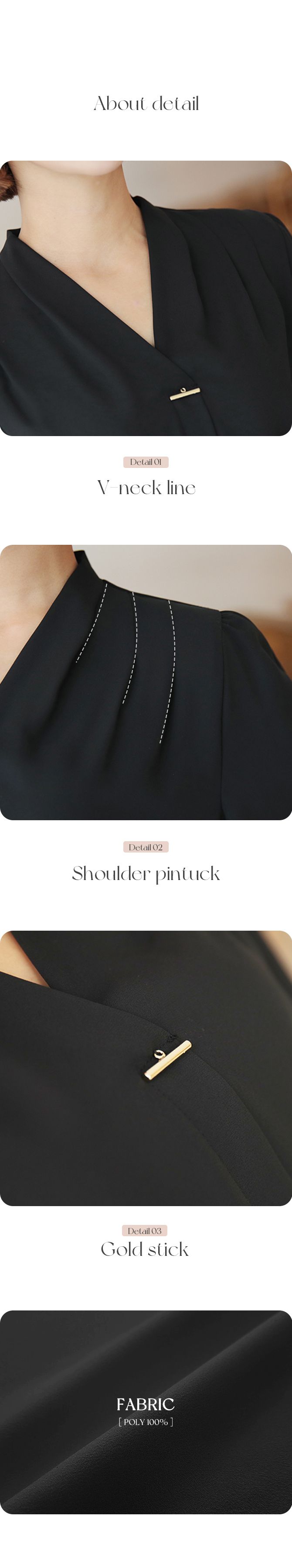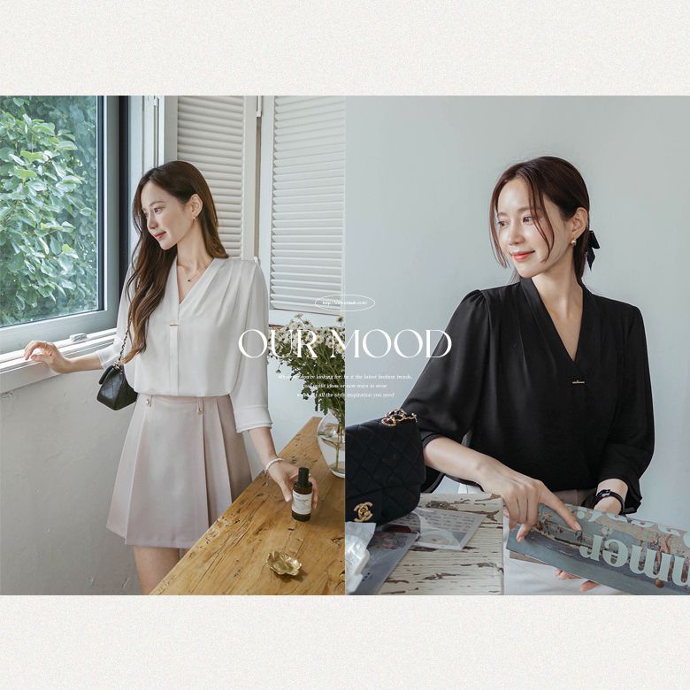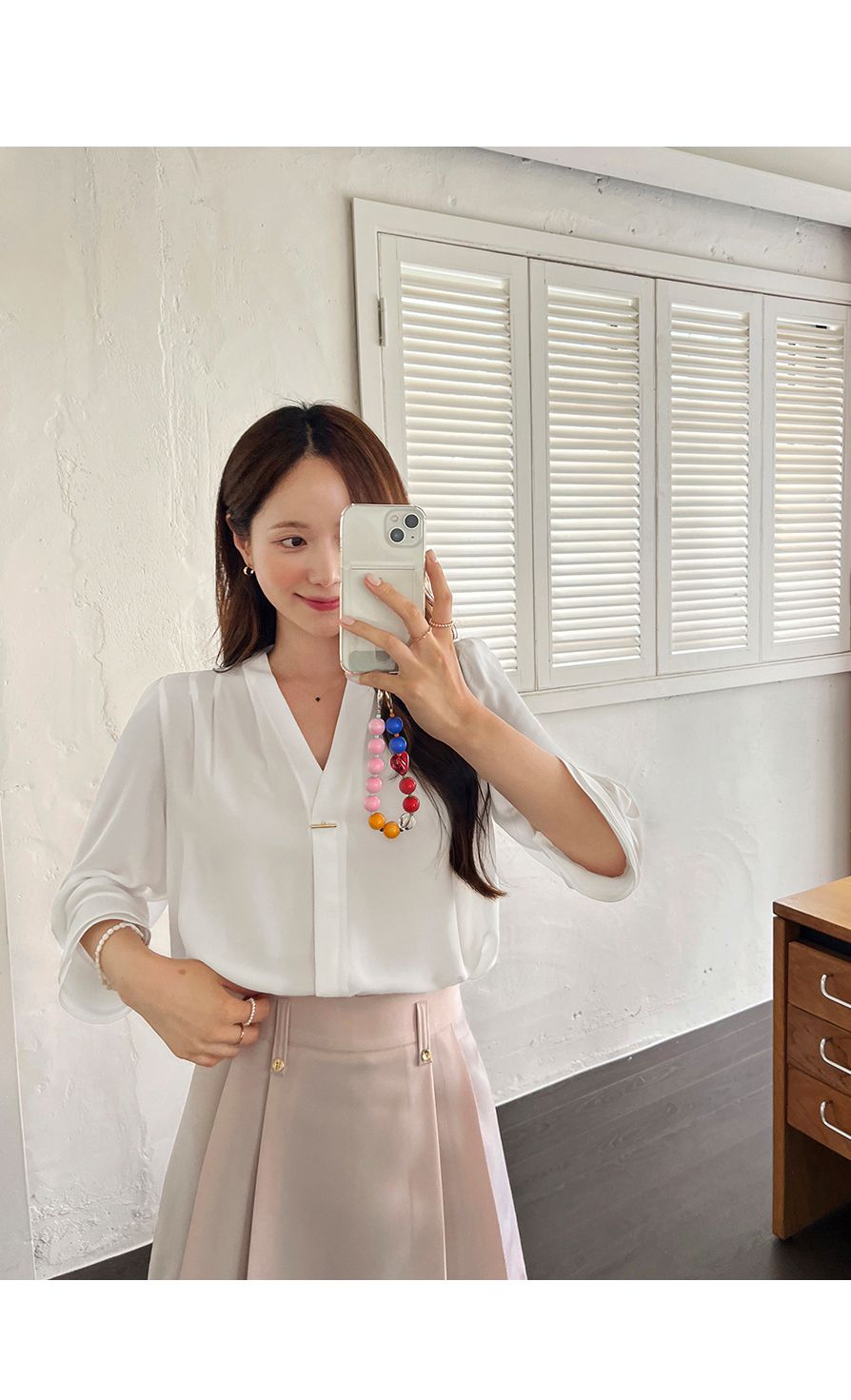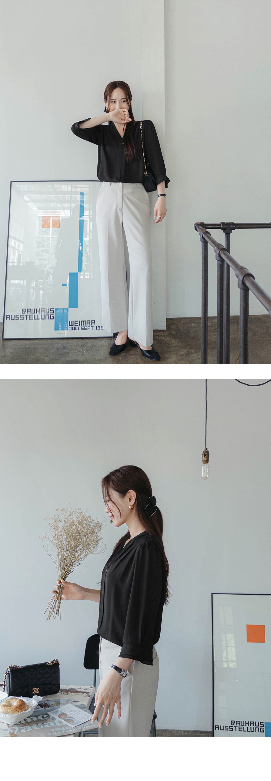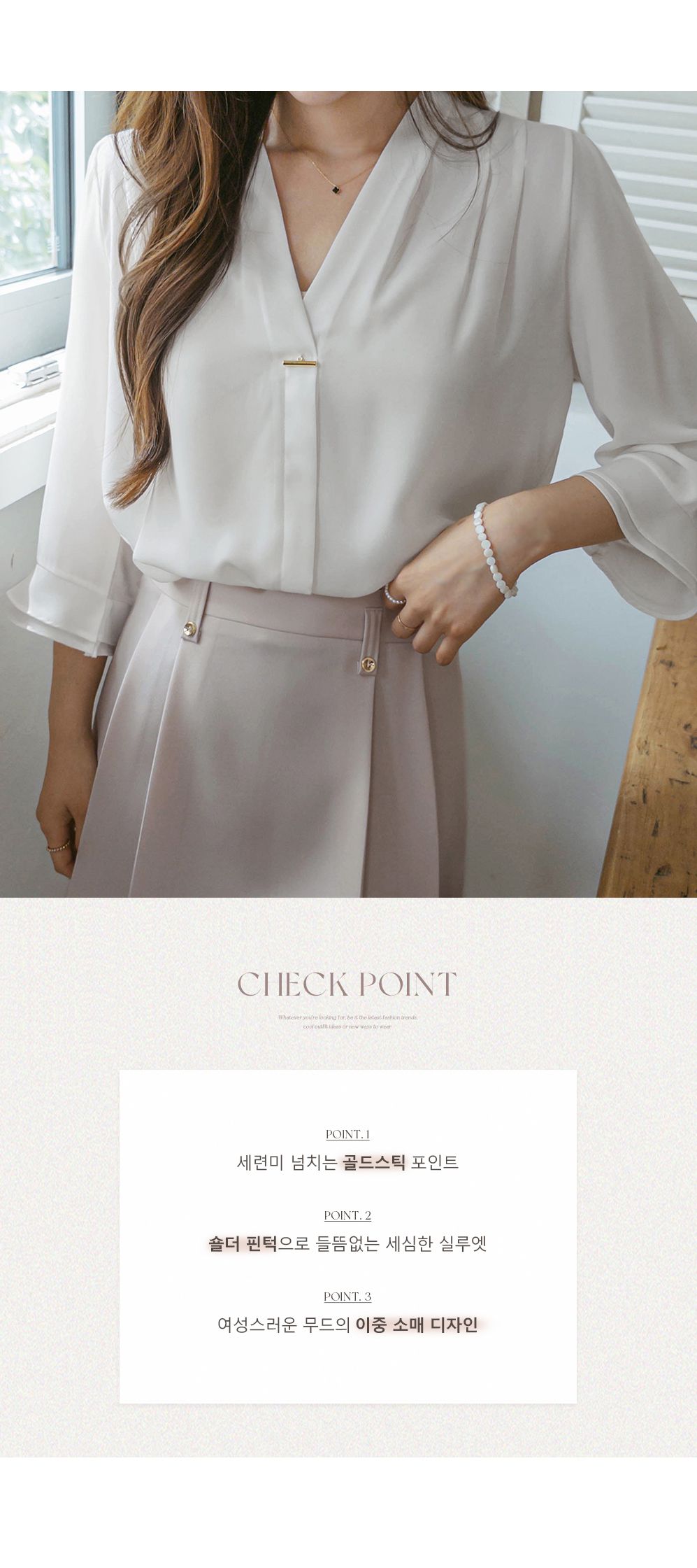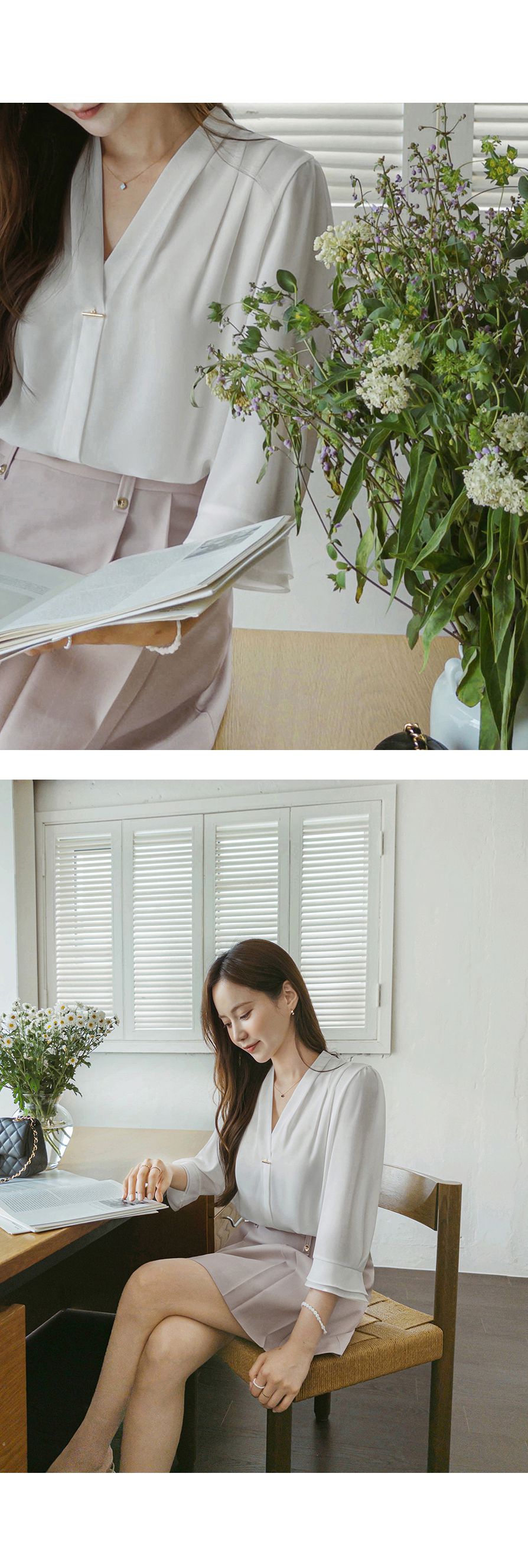 公主袖/寬袖/金屬雕墜V領/雙層花瓣袖口/弧形下襬/交疊衣襟 - 休閒婚禮OL上班族簡約百搭素面抓褶肩雪紡衫雪紡上衣雪紡襯衫上衣七分袖上衣黑色白色天藍色