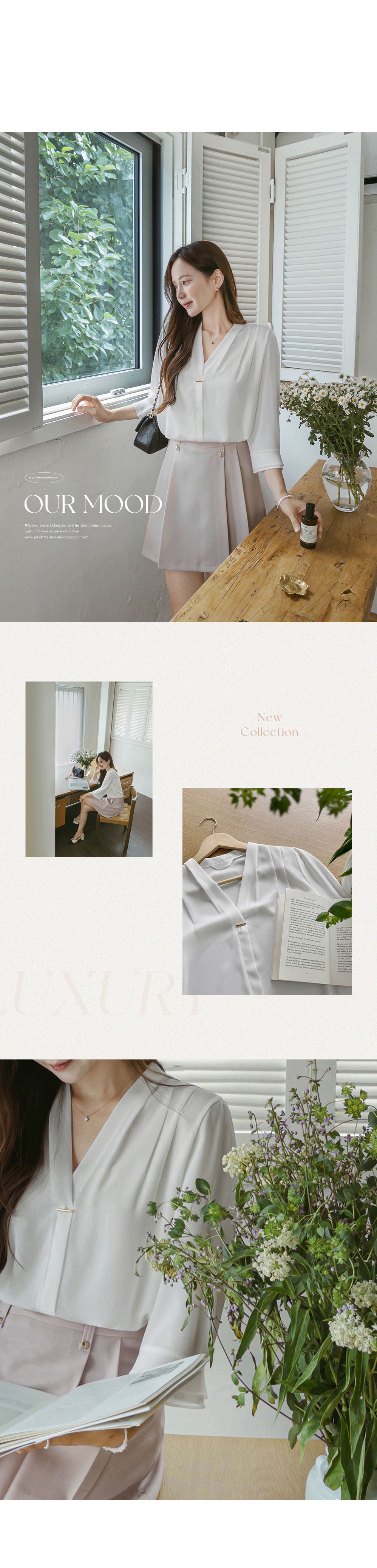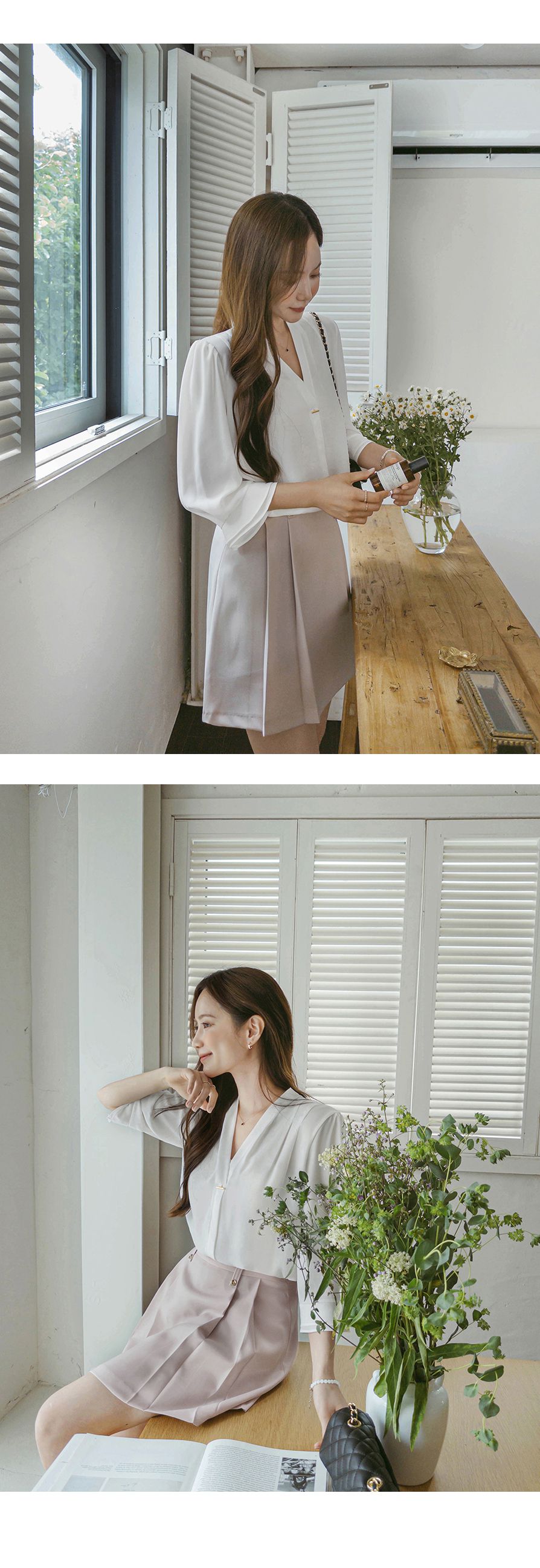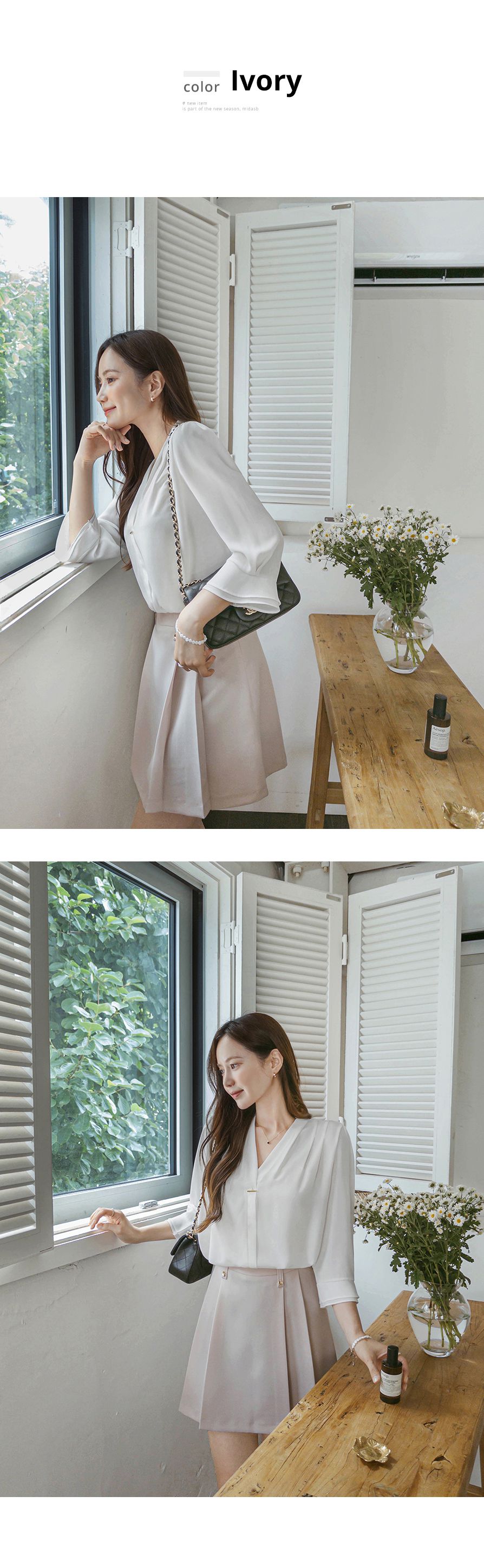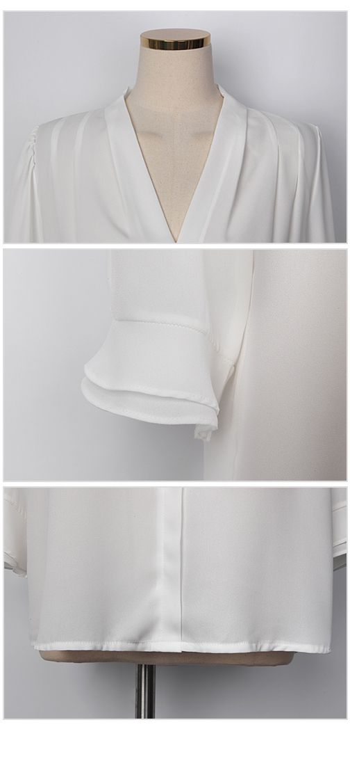 【C55265】韓國MID 抓褶肩雪紡衫-素面寬袖V領雙層花瓣七分袖上衣★★