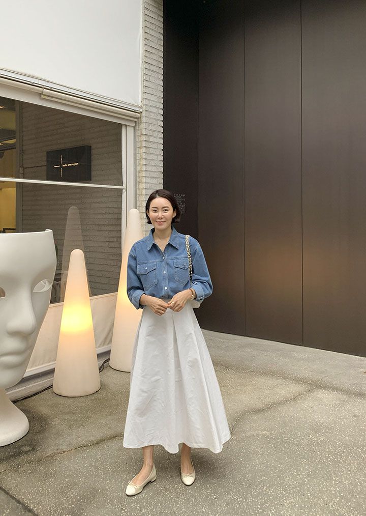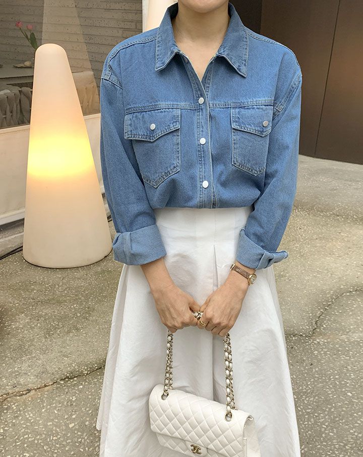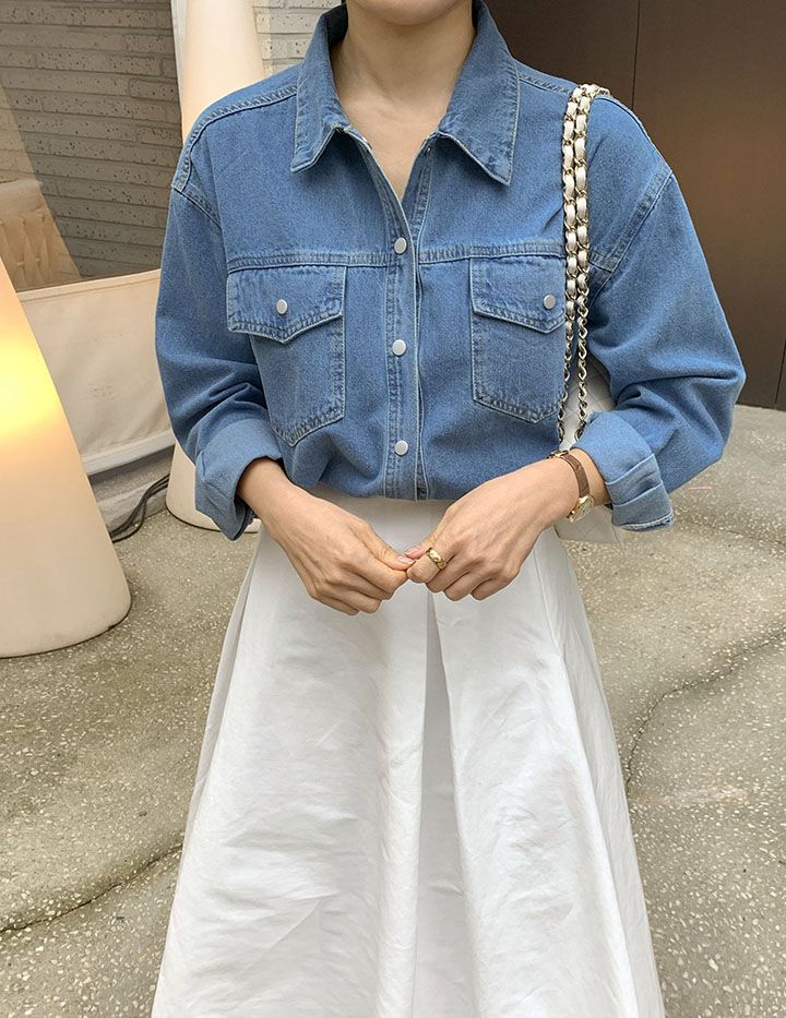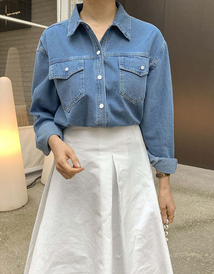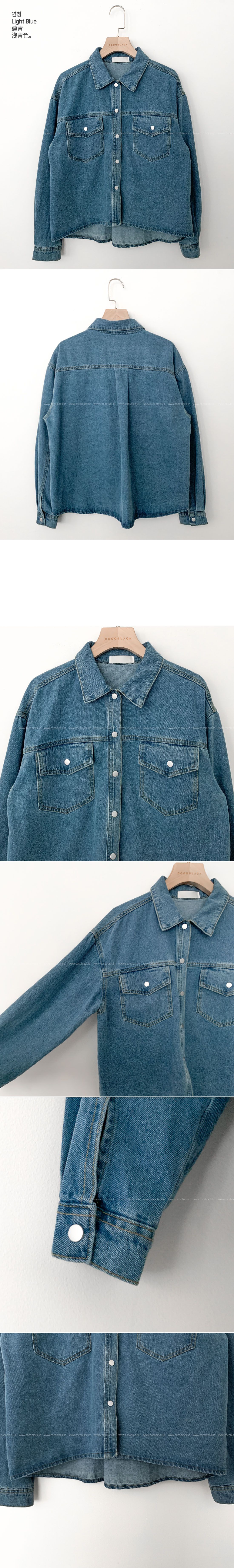 中厚面料/信封雙口袋/跳色車線/開襟排釦/四合釦/弧形下襬/後背抓褶/水洗色/前短後長 - 休閒居家簡約百搭素面雙口袋牛仔襯衫上衣牛仔外套襯衫外套長袖上衣外套藍色