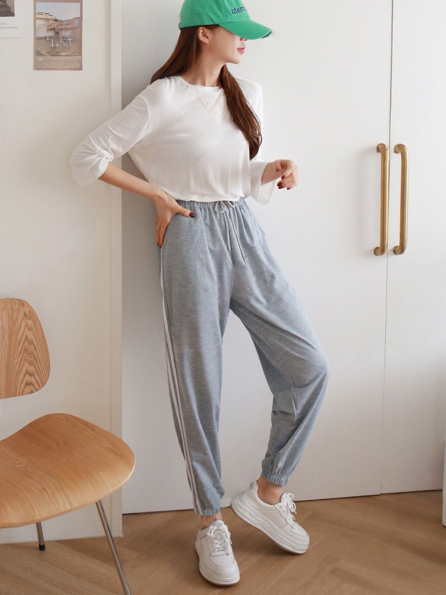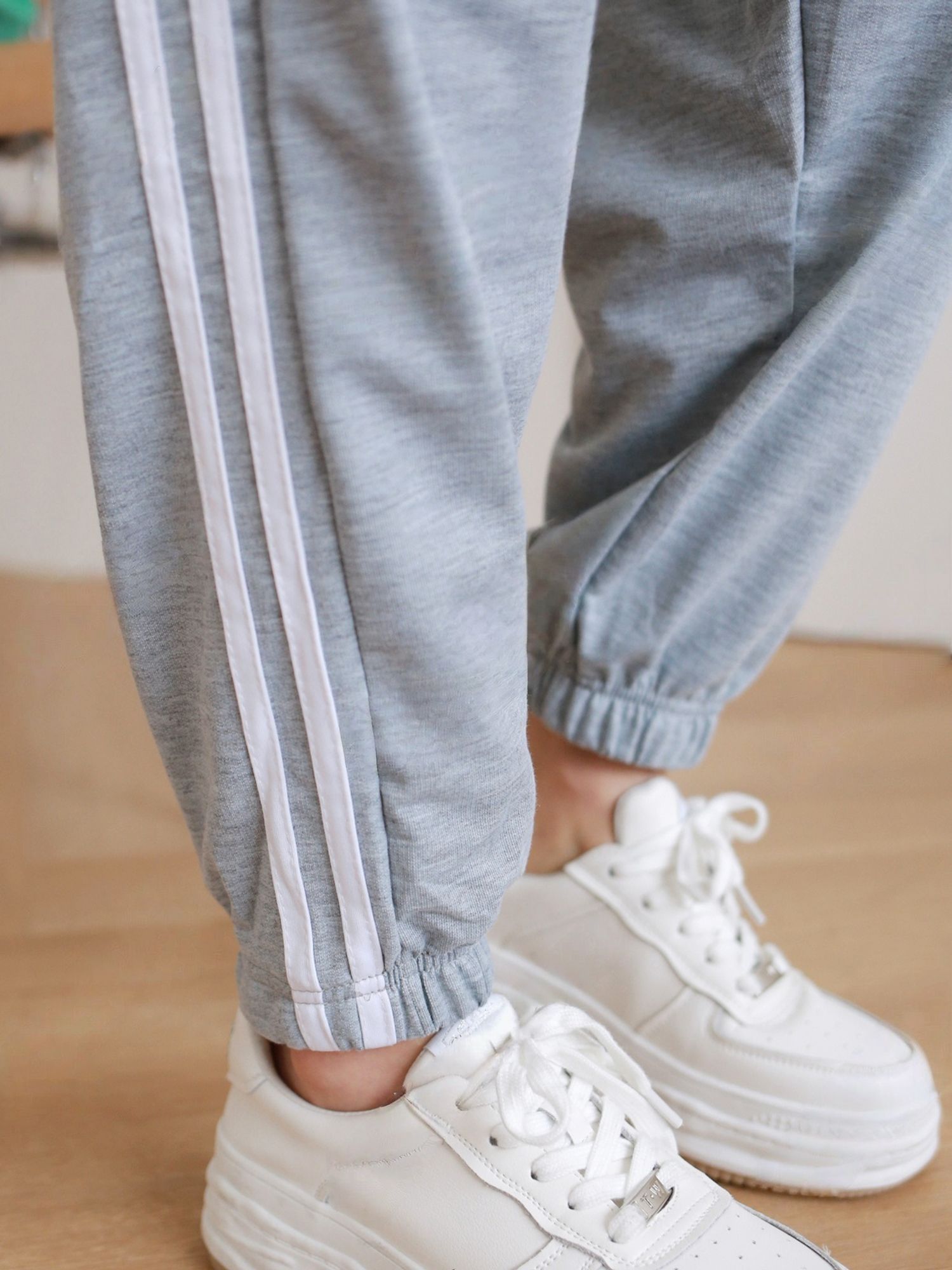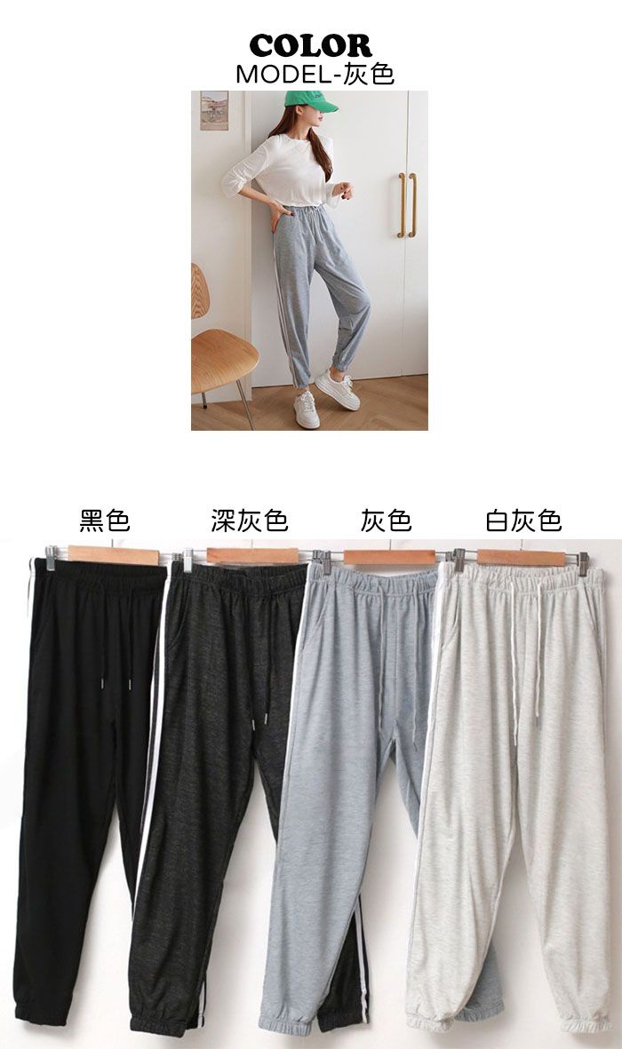 顯瘦版型/舒適也時尚/露出纖細腳踝-休閒居家簡約百搭側條紋運動口袋寬鬆束口褲管鬆緊腰綁帶素面九分褲錐形褲灰色深灰色黑色白灰色