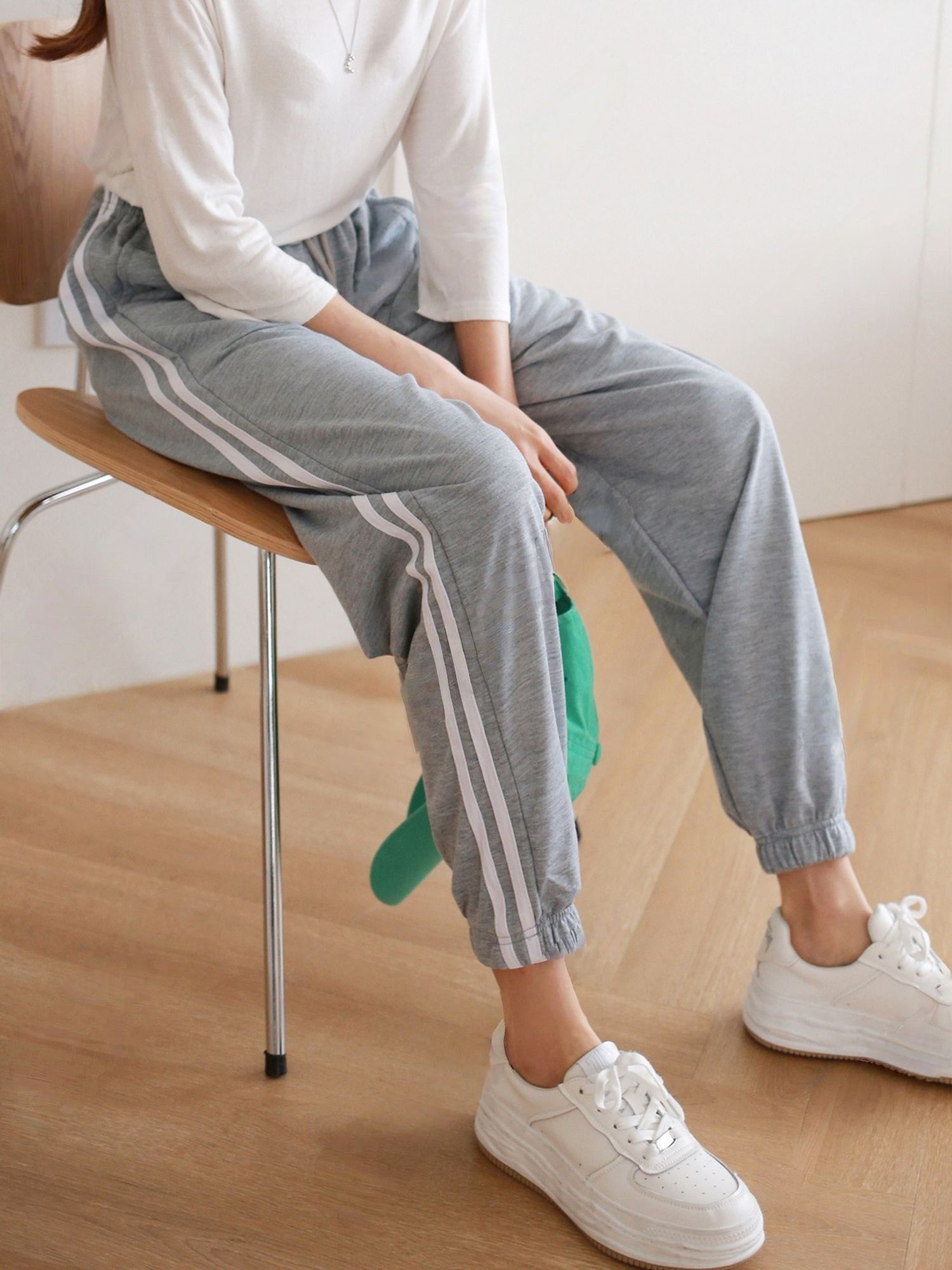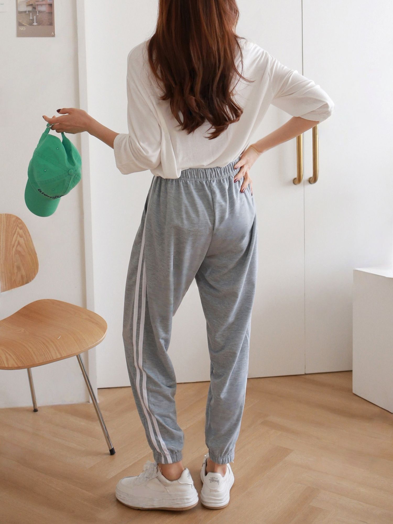 【C55279】韓國SEW 側條紋錐形褲-運動束口褲管寬鬆綁帶九分褲★★