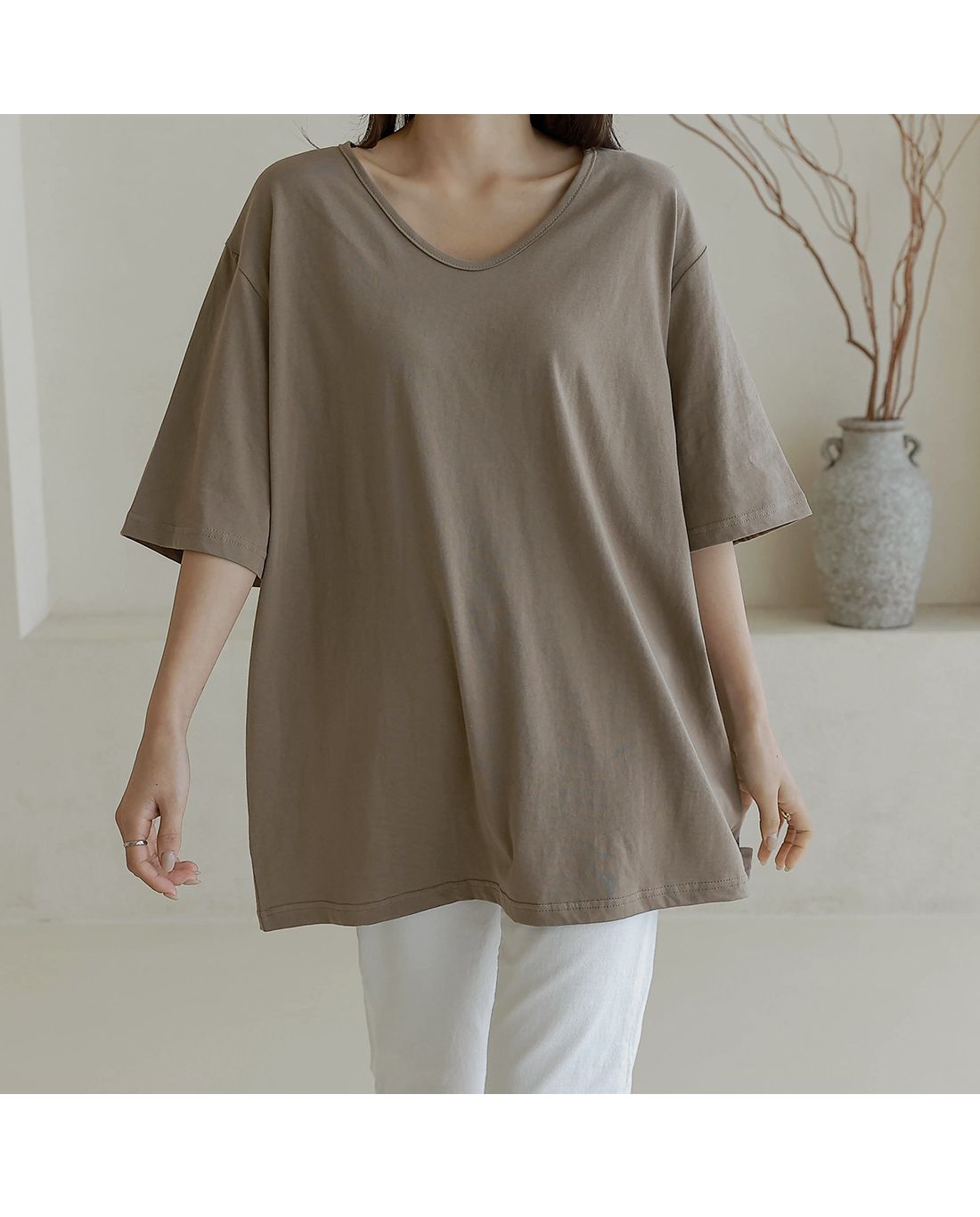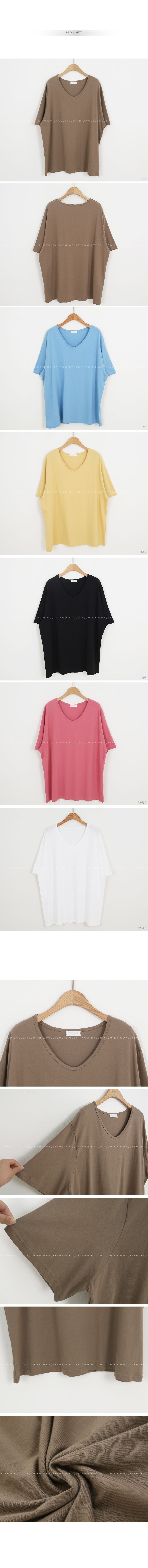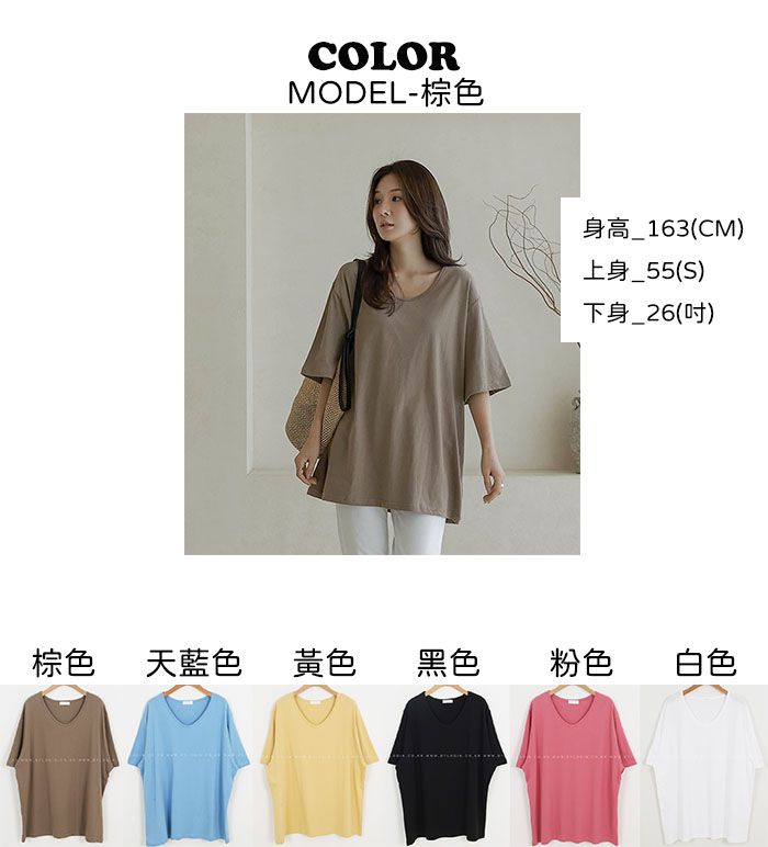 大V領/寬鬆大尺碼上衣/長版上衣/棉質/直筒版型/寬袖 - 休閒居家簡約百搭素面長版U領上衣七分袖上衣七分袖T恤棕色天藍色黃色黑色粉色象牙色白色