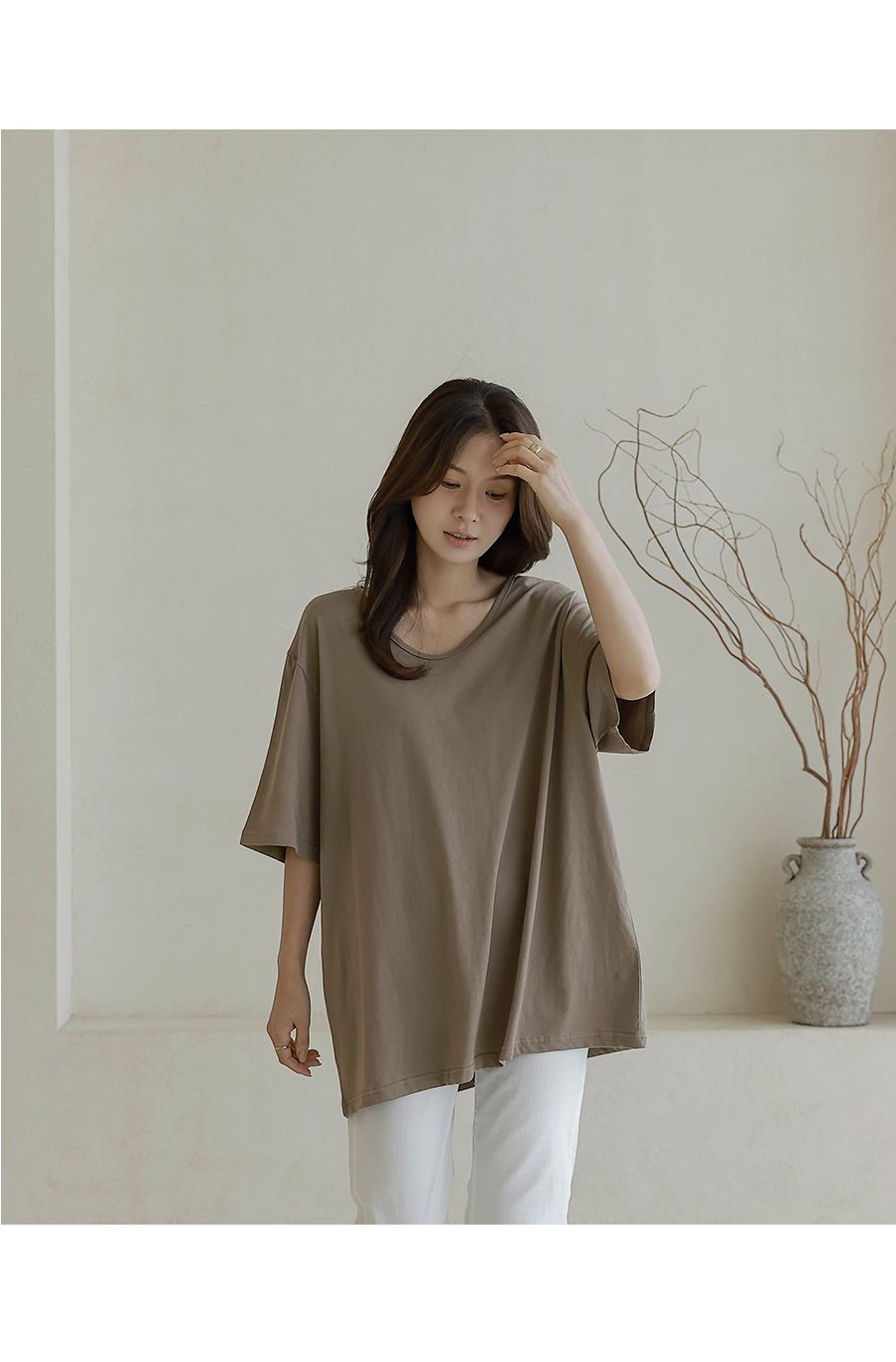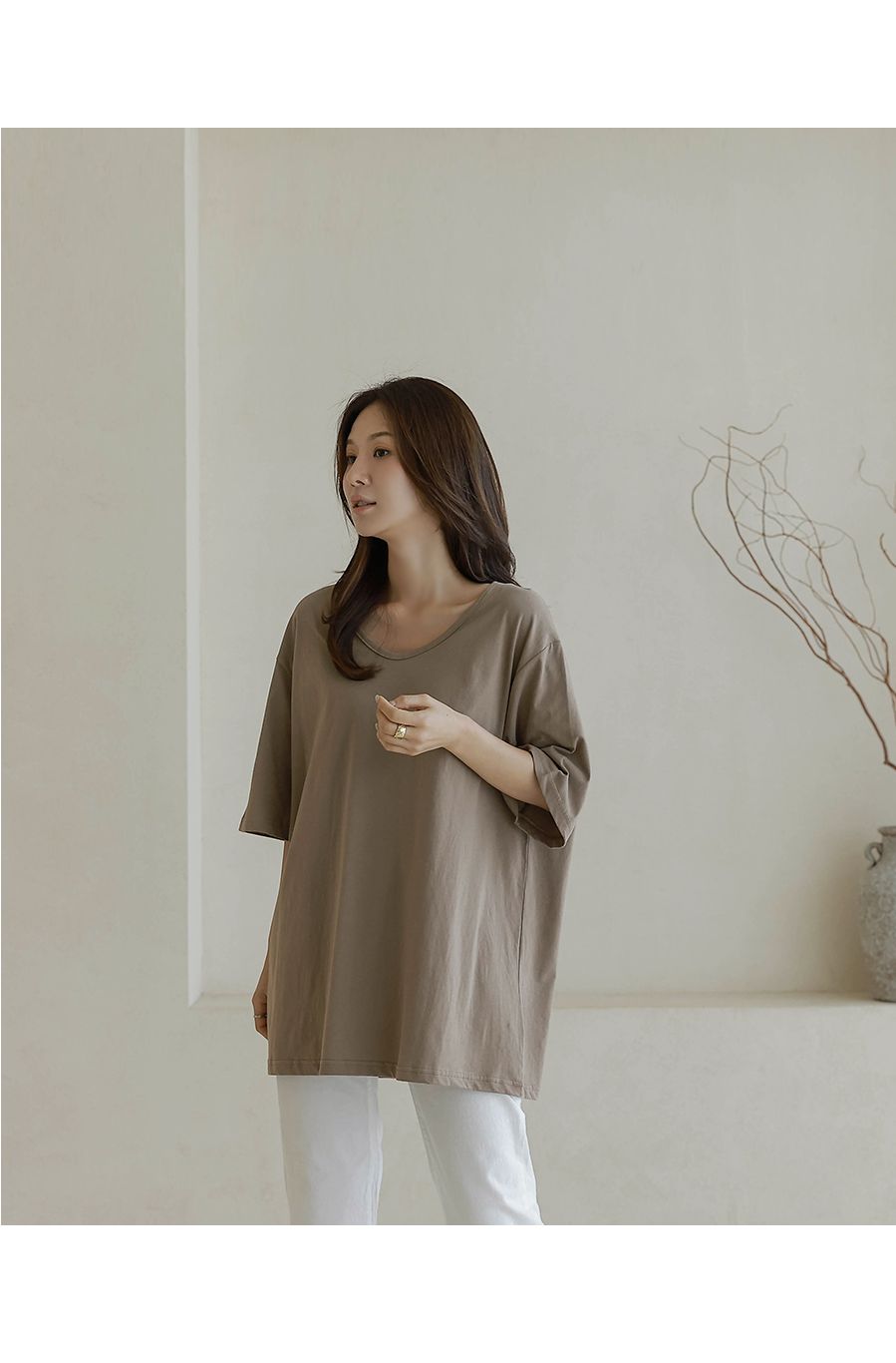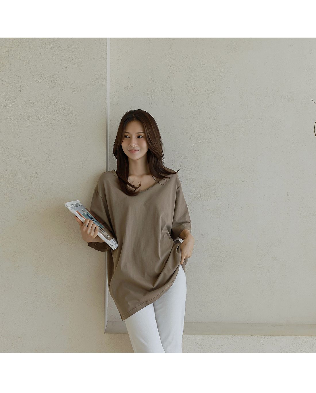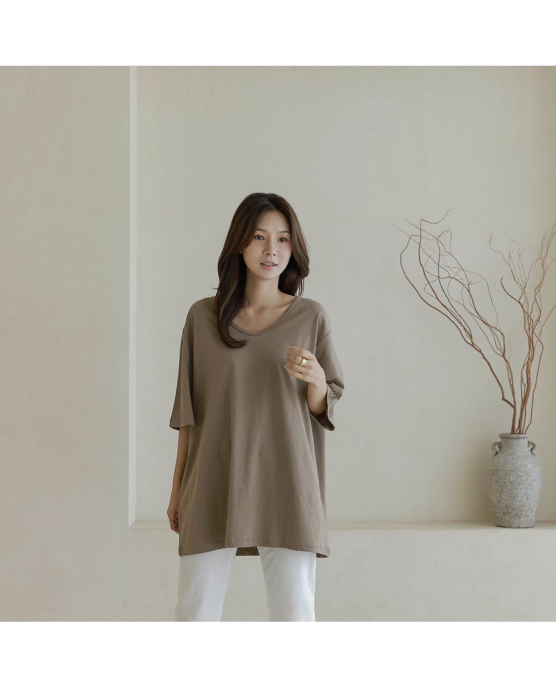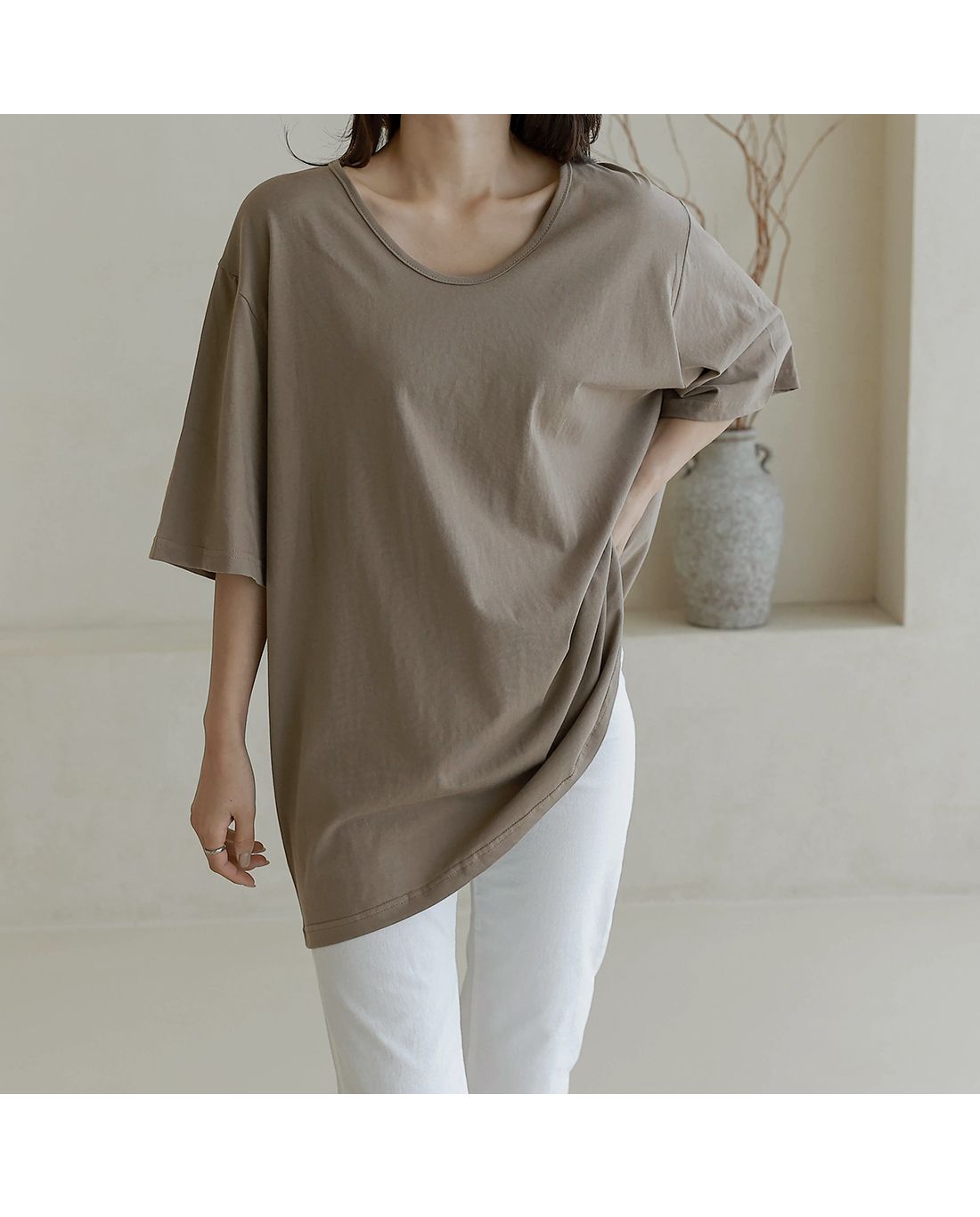 【C55287】韓國BLG 長版U領上衣-寬鬆素面棉質直筒寬袖七分袖T恤★★
