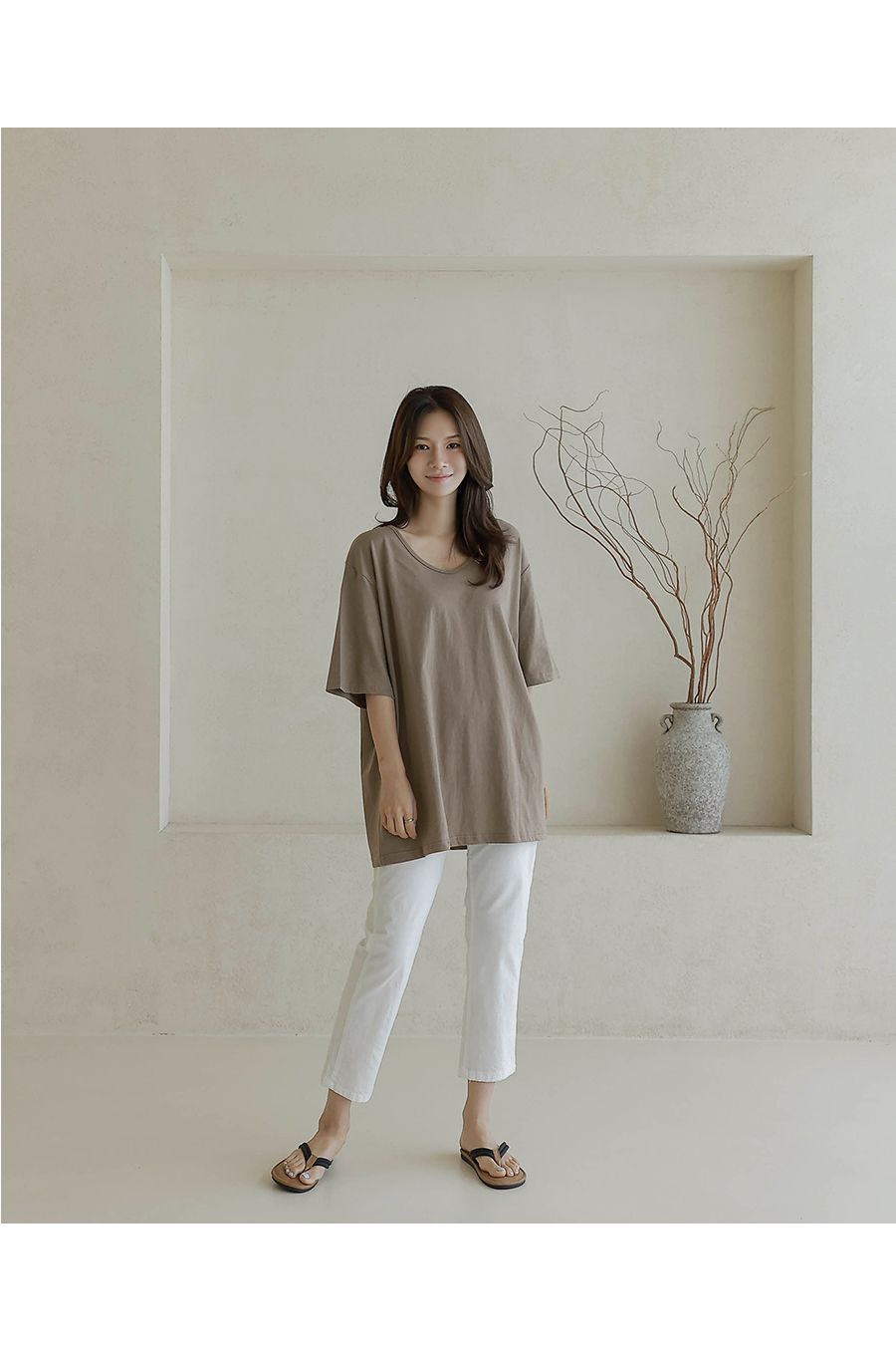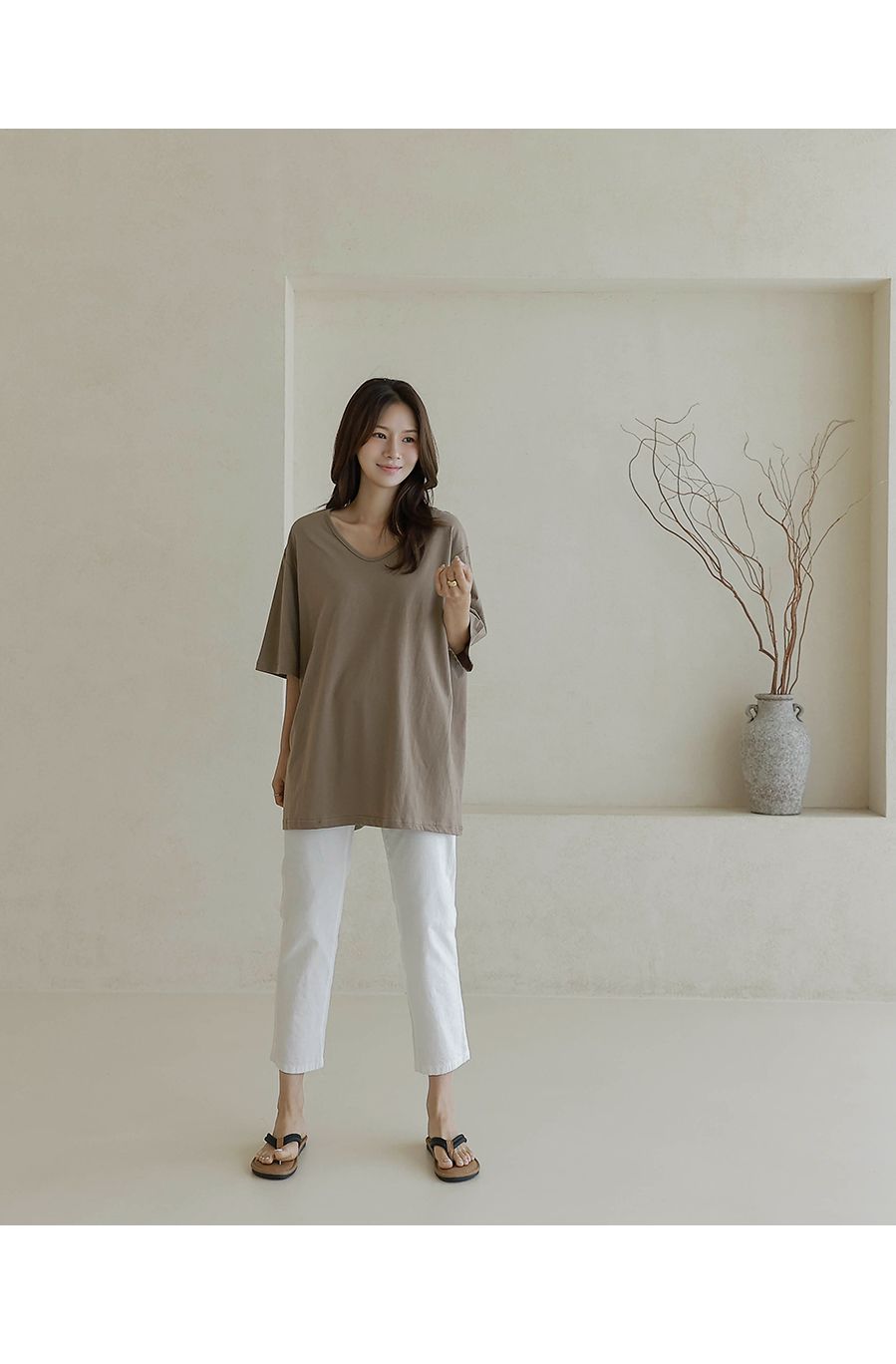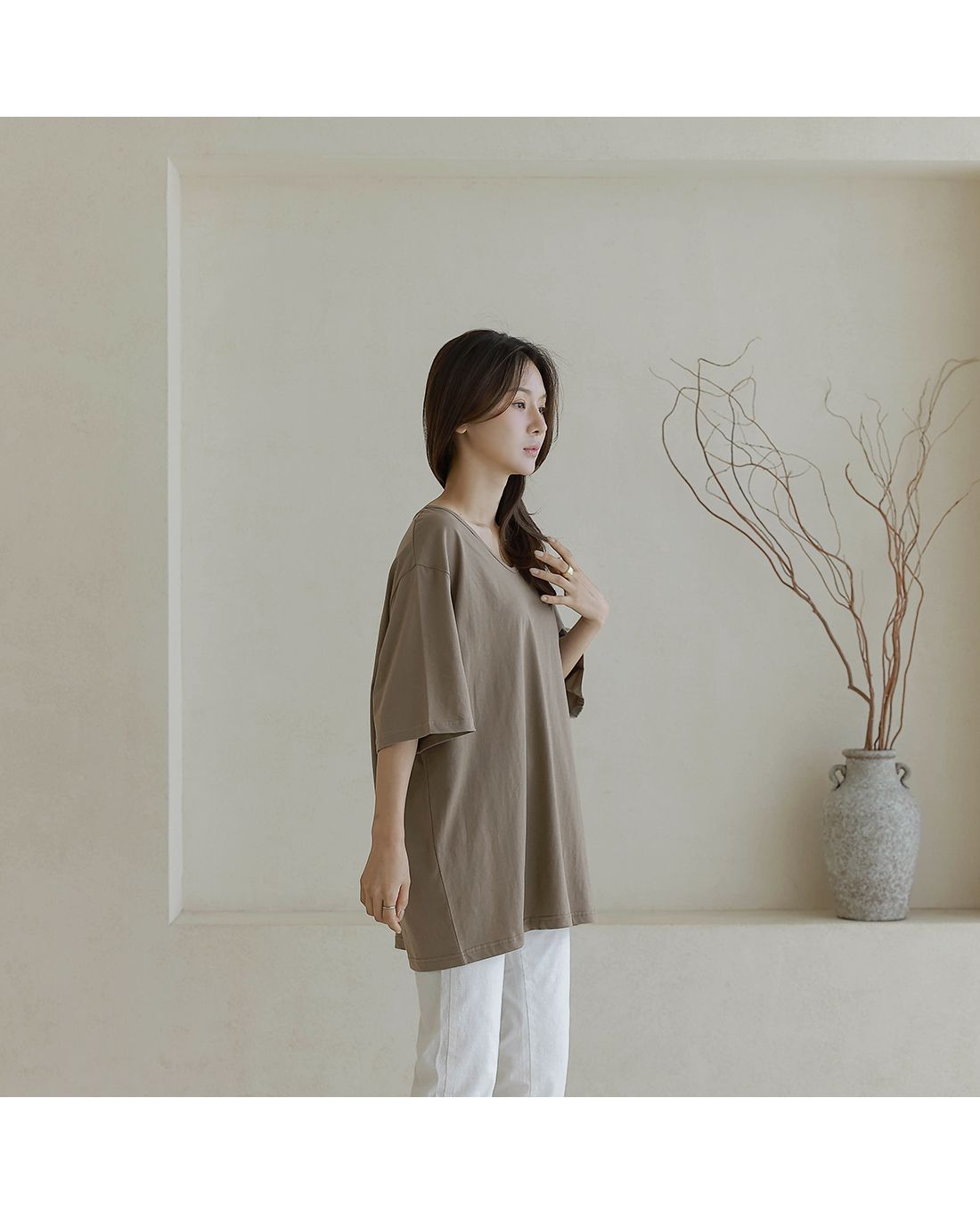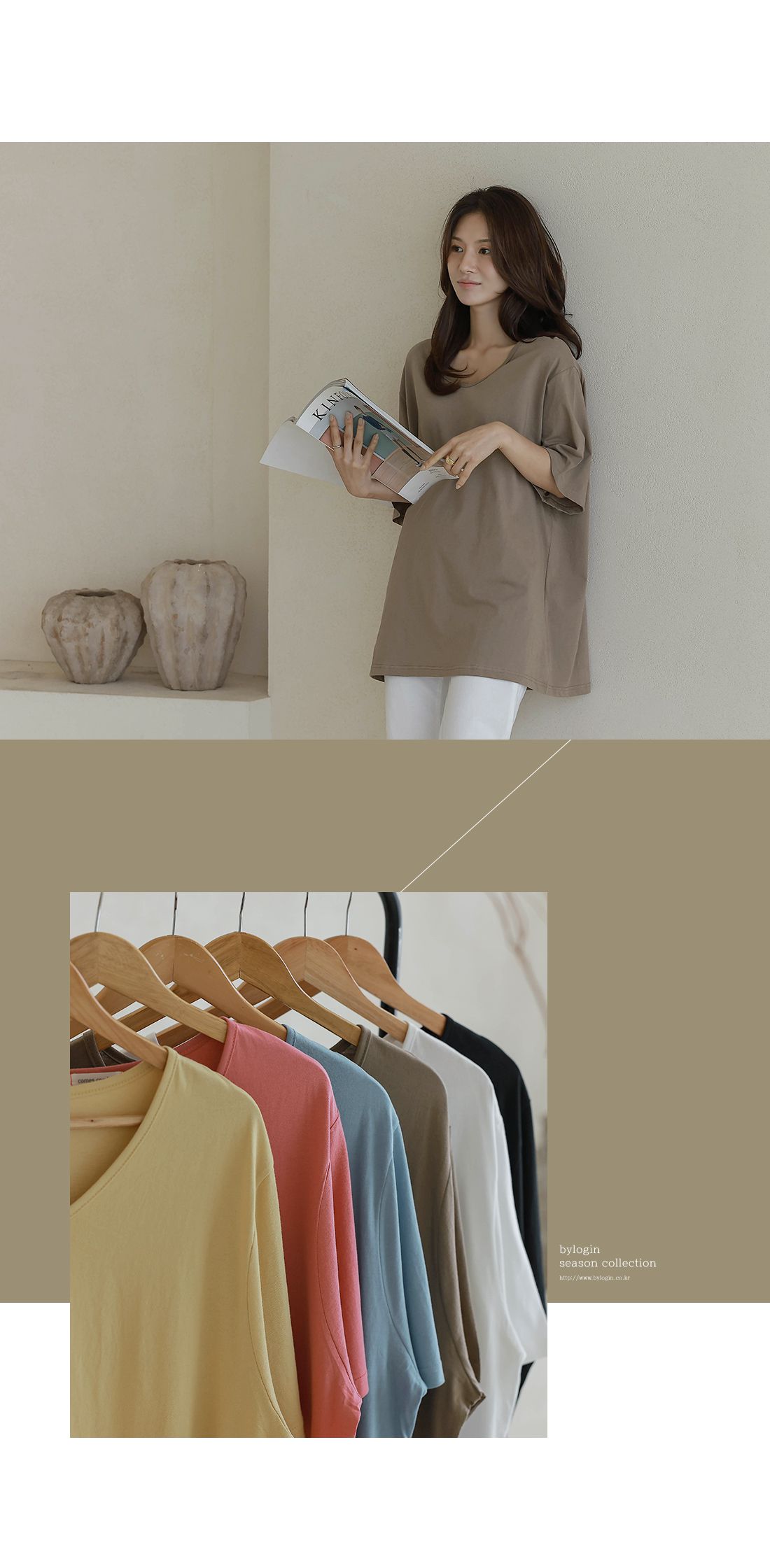 【C55287】韓國BLG 長版U領上衣-寬鬆素面棉質直筒寬袖七分袖T恤★★