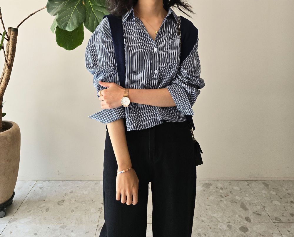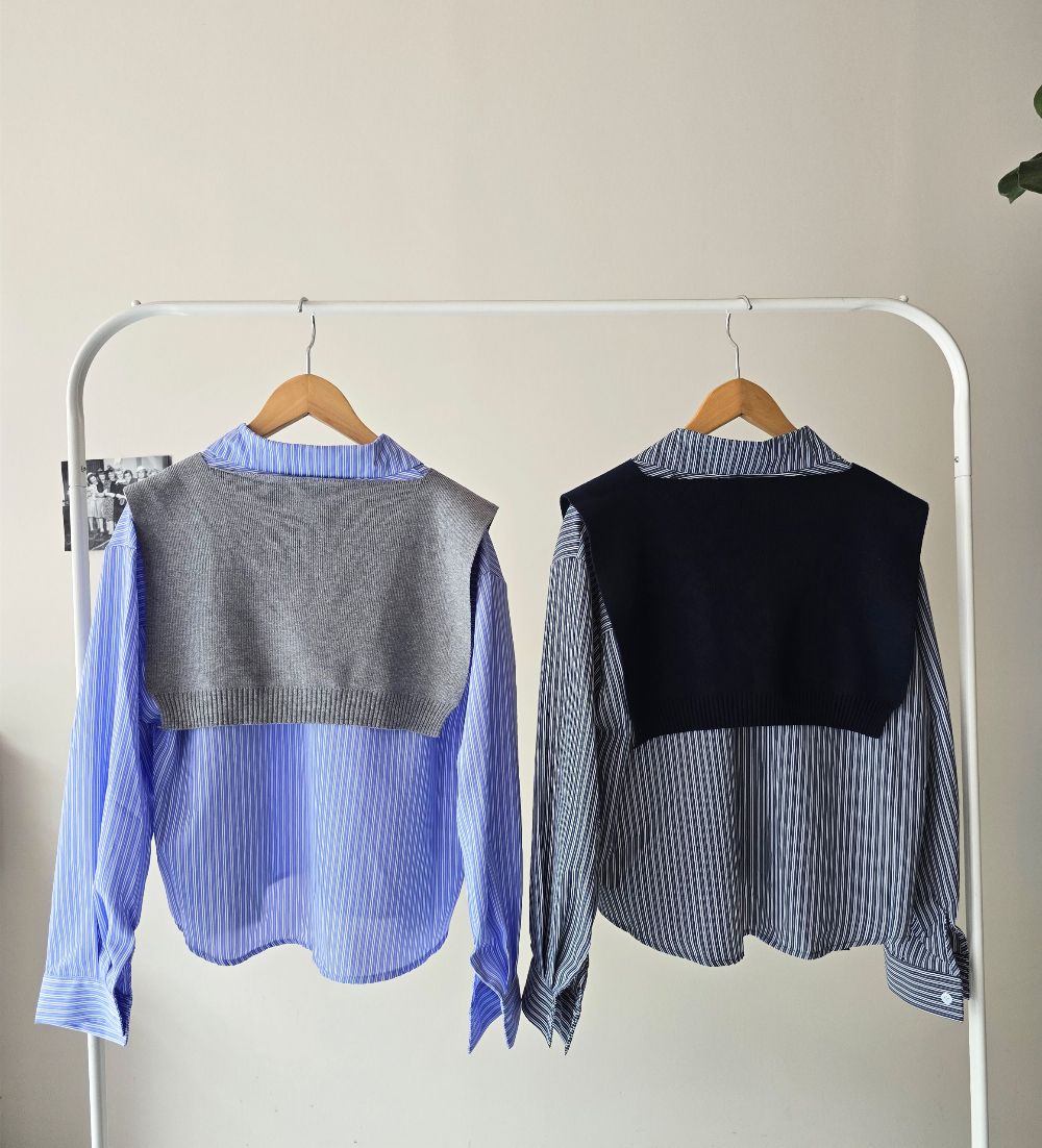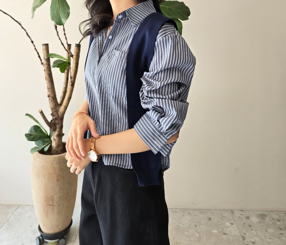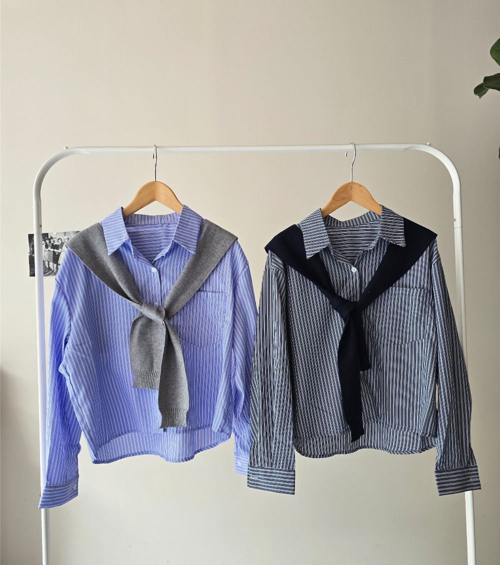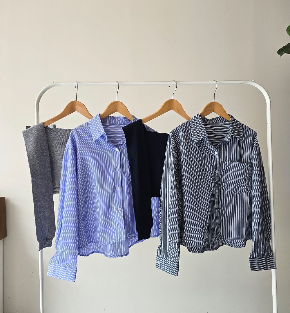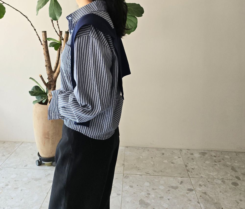 【C55290】韓國OHM 披肩襯衫套裝-條紋短版口袋長袖上衣+針織披肩