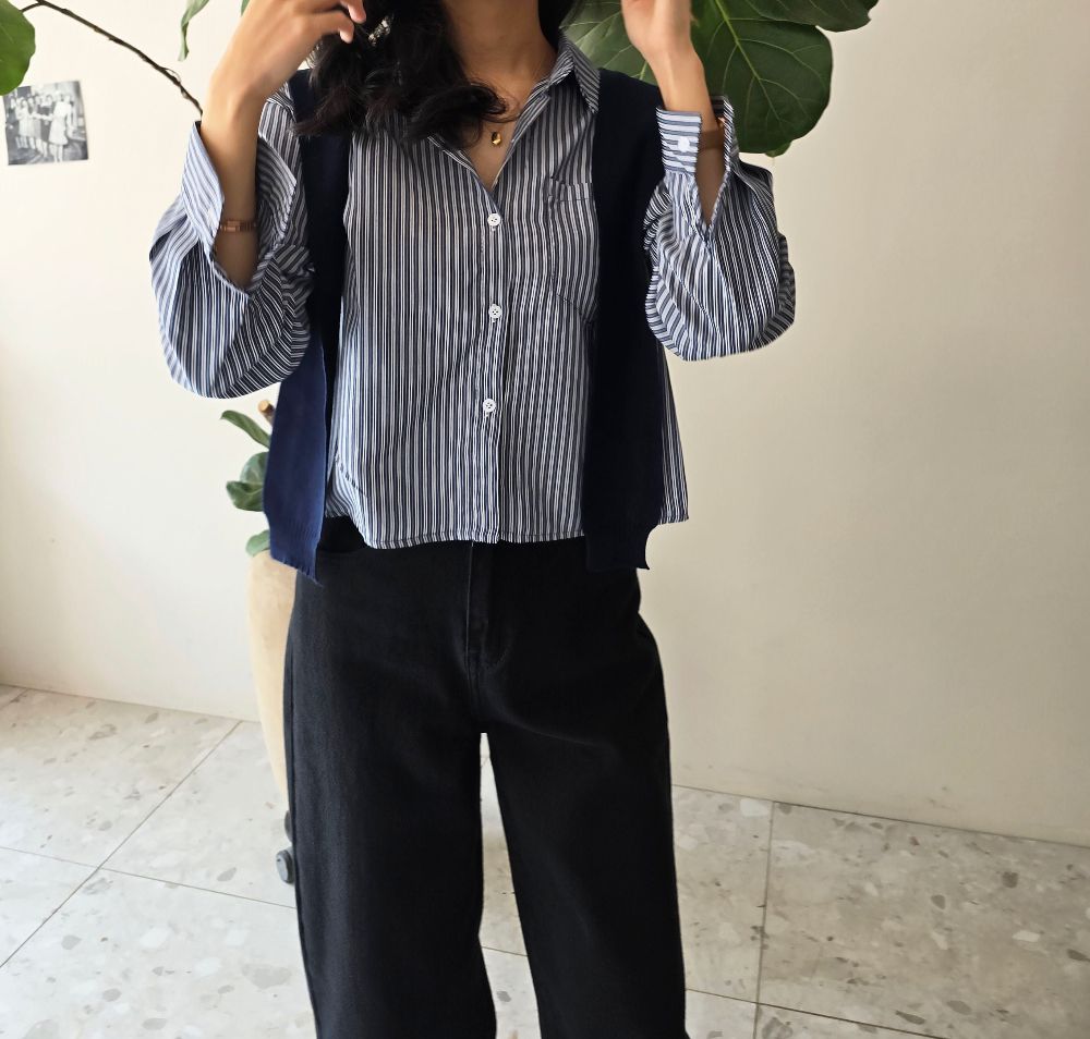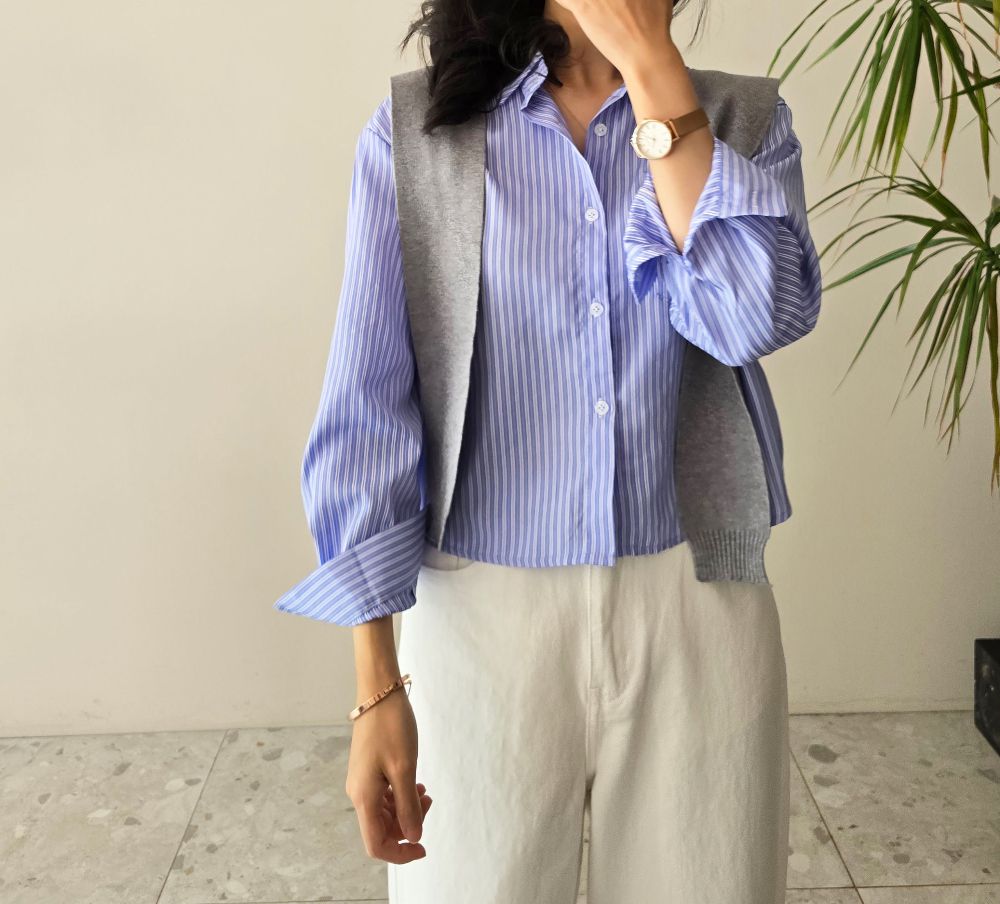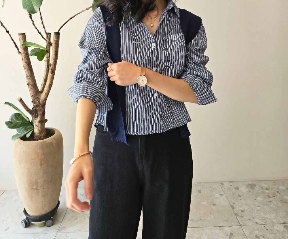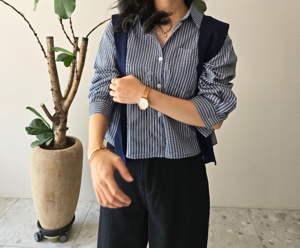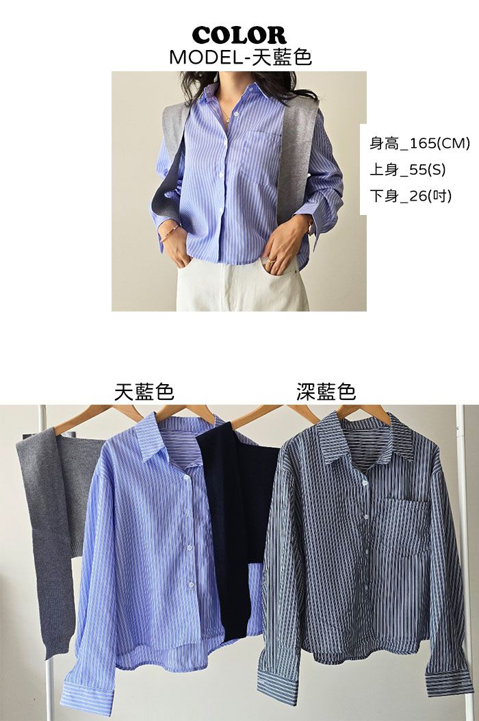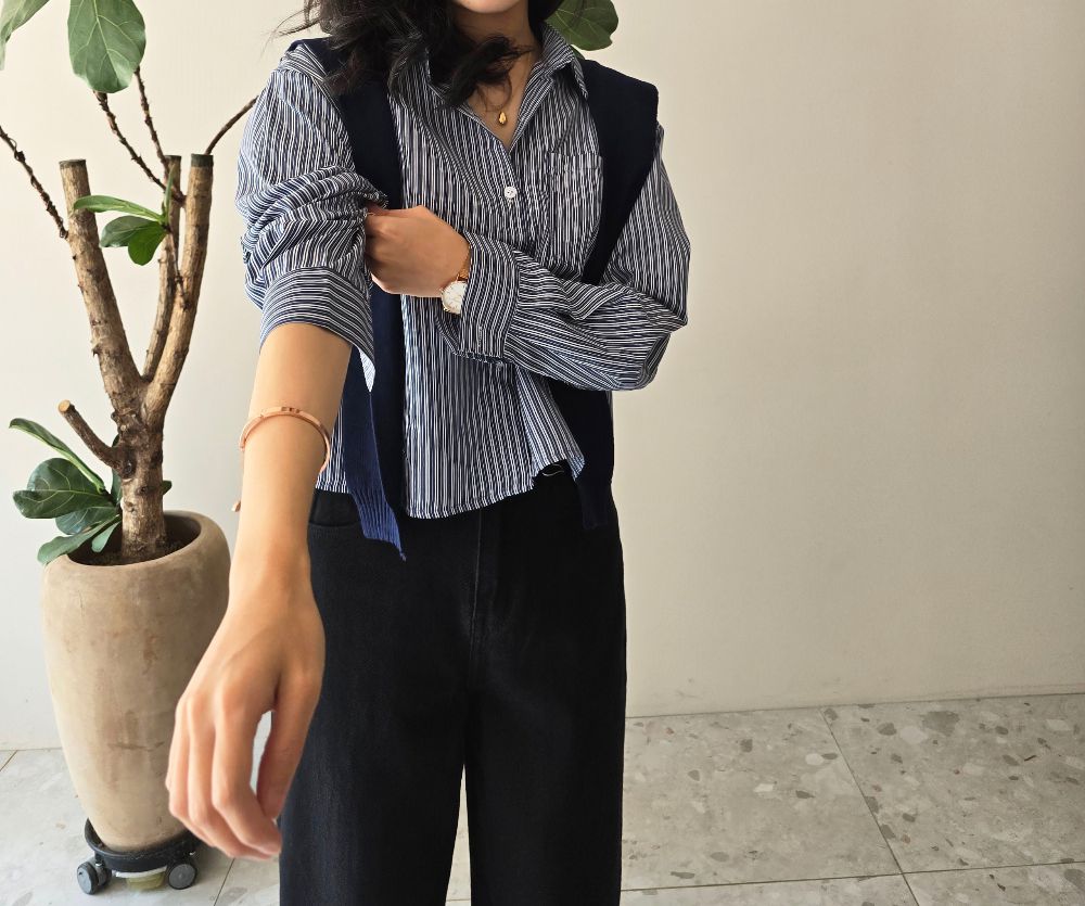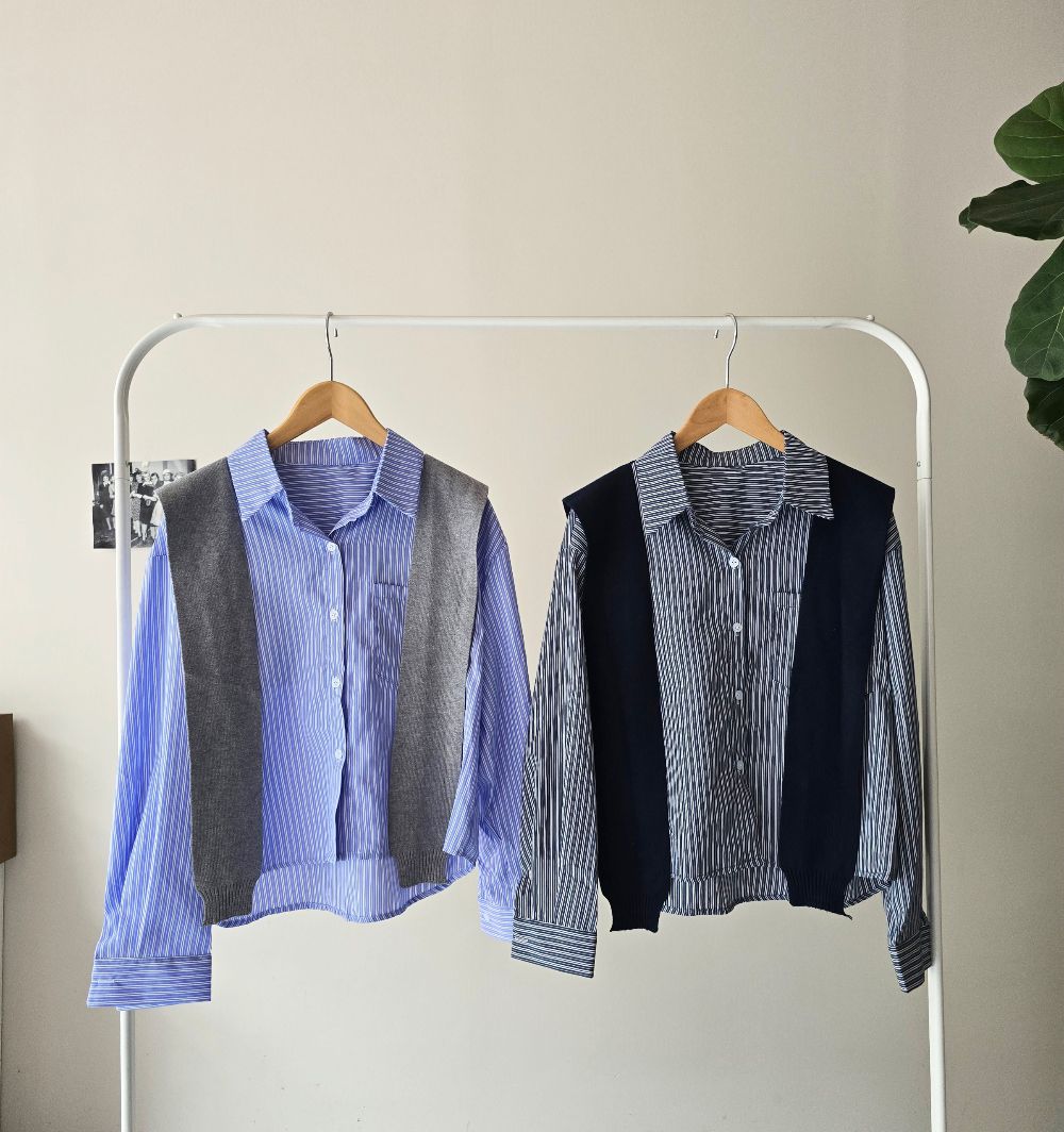 【C55290】韓國OHM 披肩襯衫套裝-條紋短版口袋長袖上衣+針織披肩