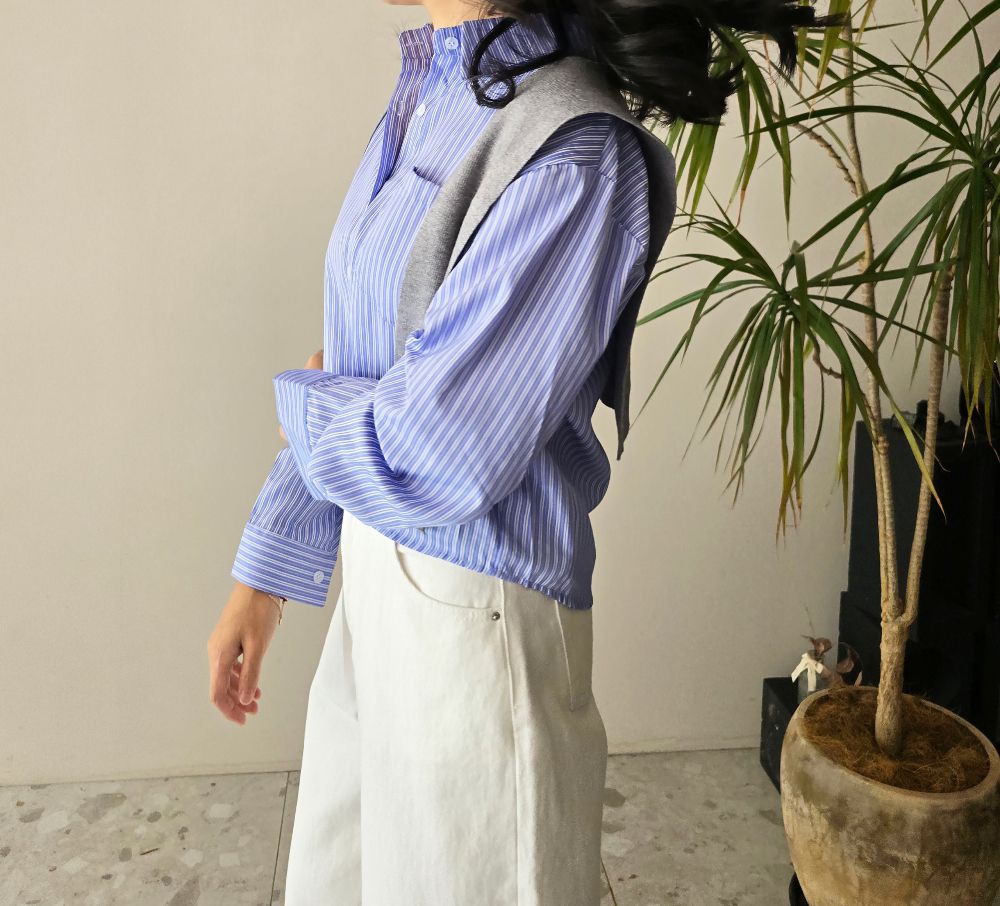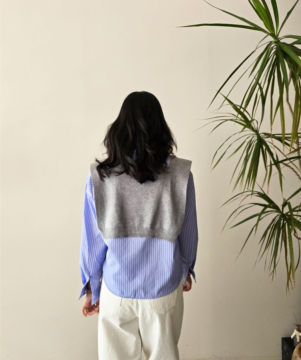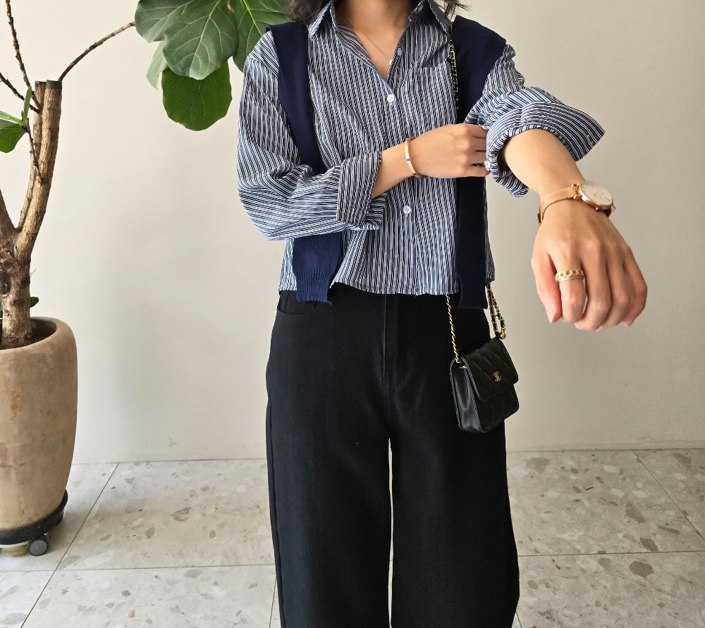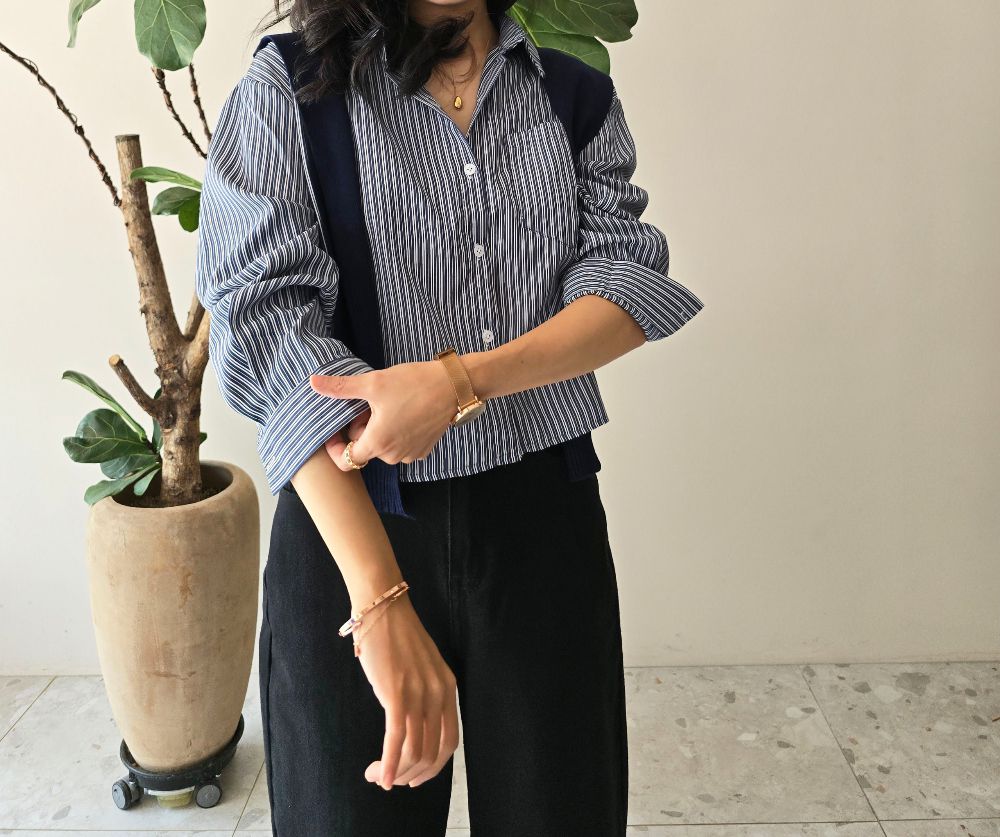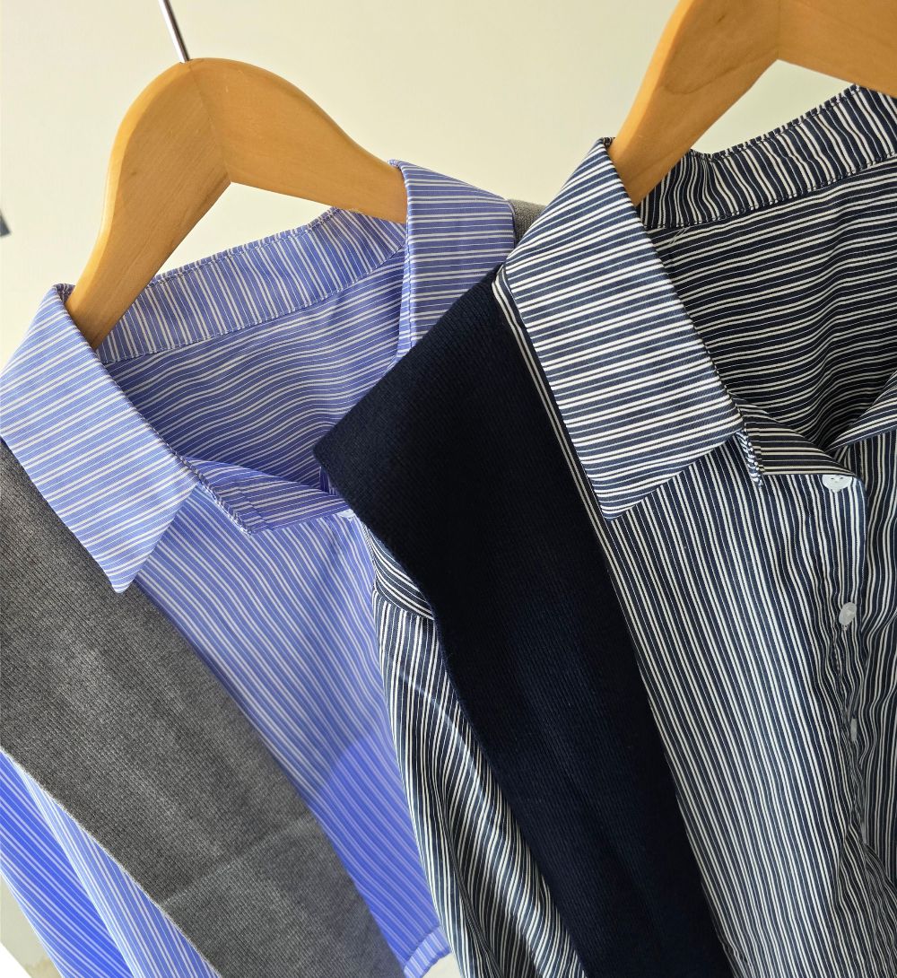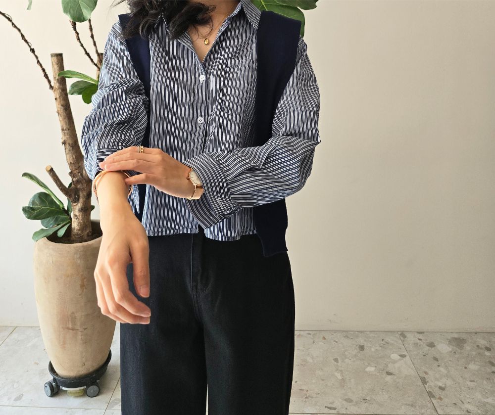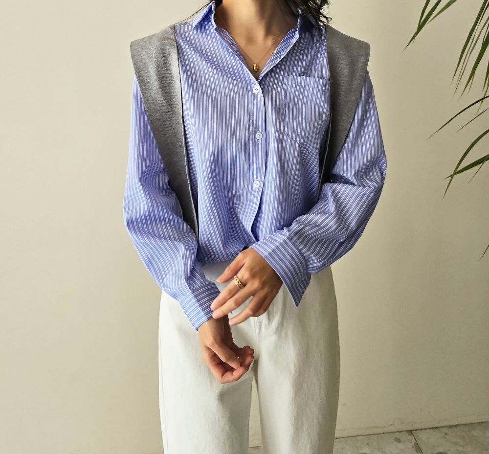 【C55290】韓國OHM 披肩襯衫套裝-條紋短版口袋長袖上衣+針織披肩