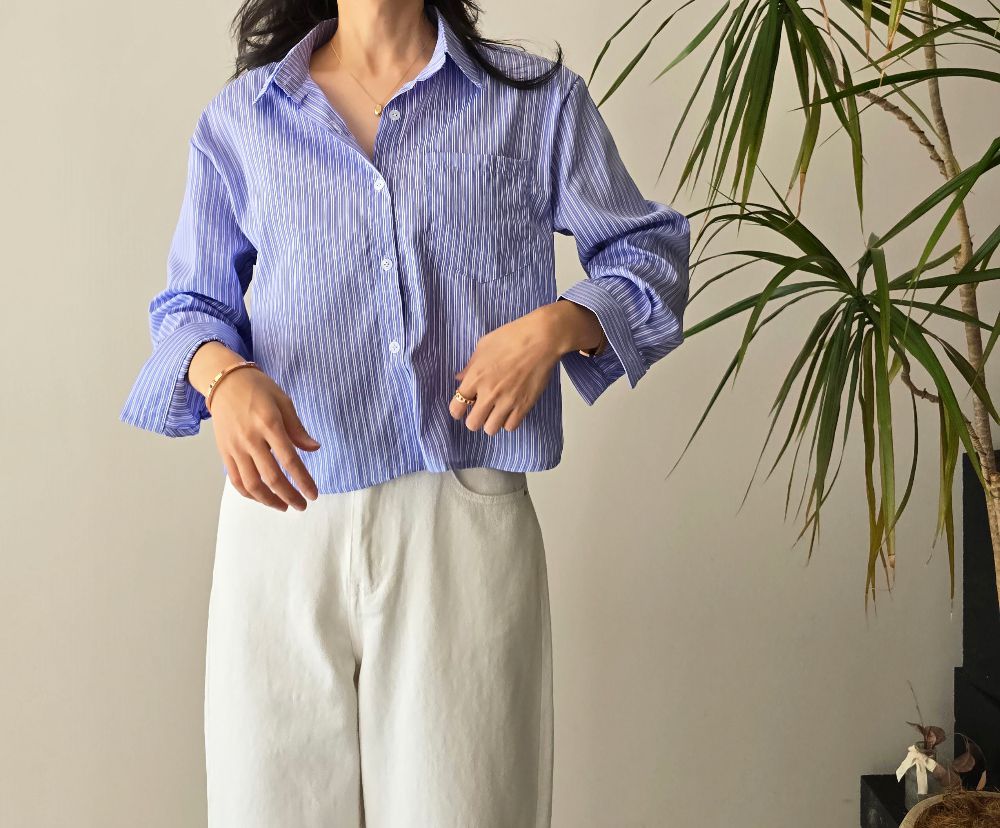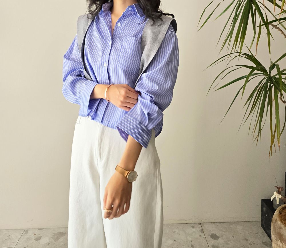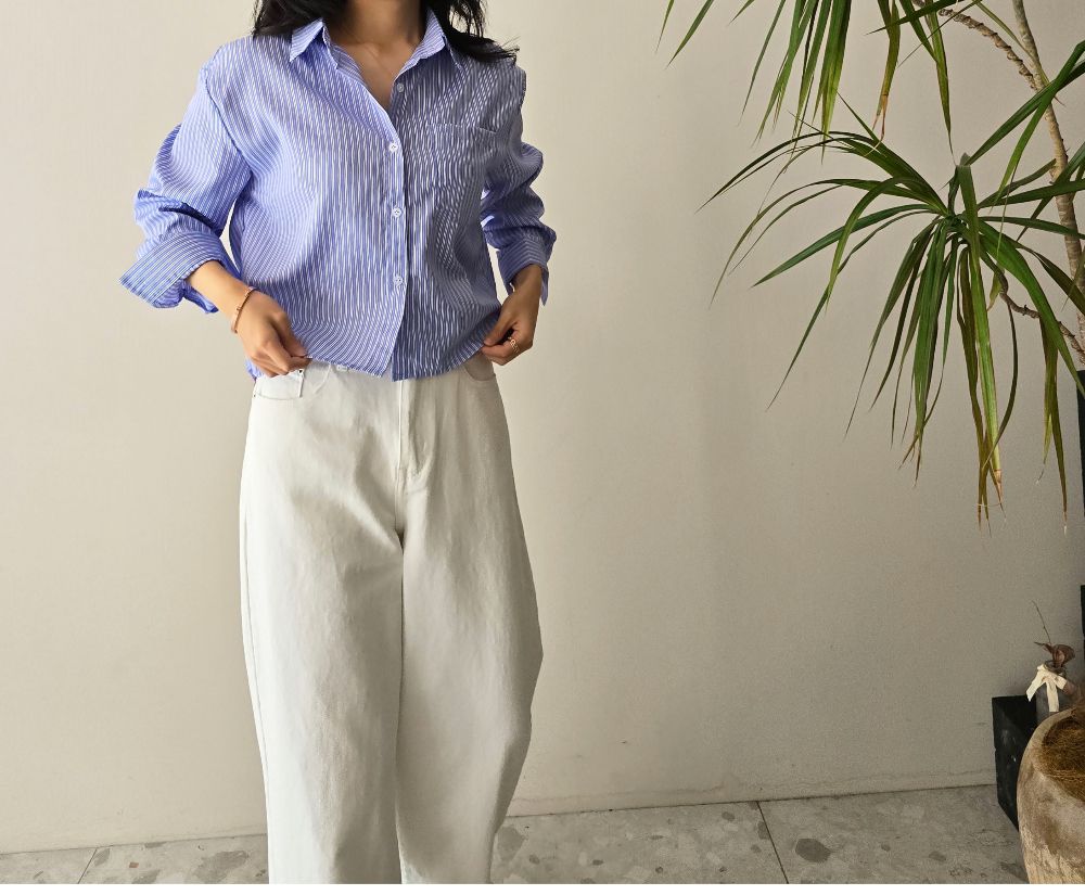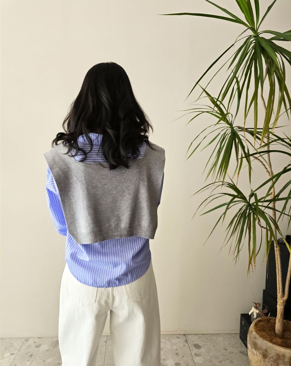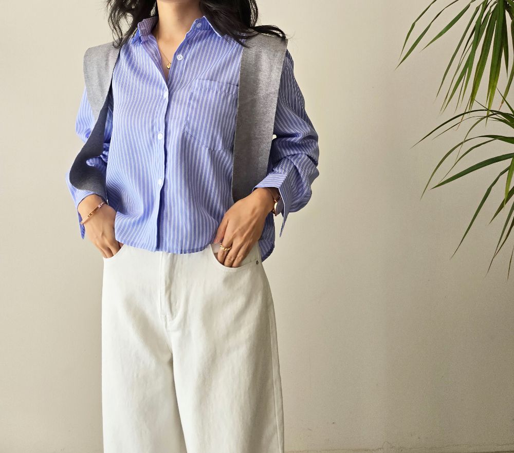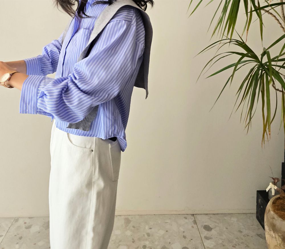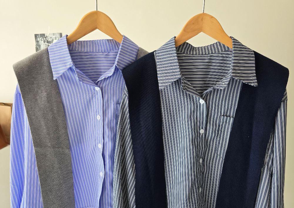 【C55290】韓國OHM 披肩襯衫套裝-條紋短版口袋長袖上衣+針織披肩