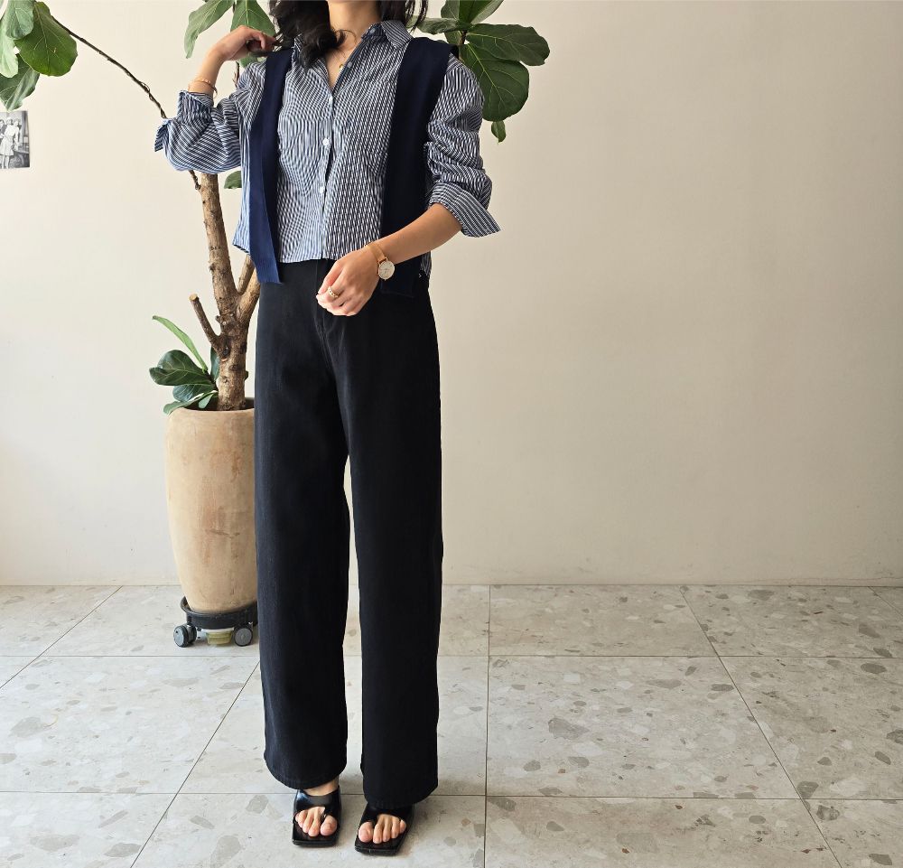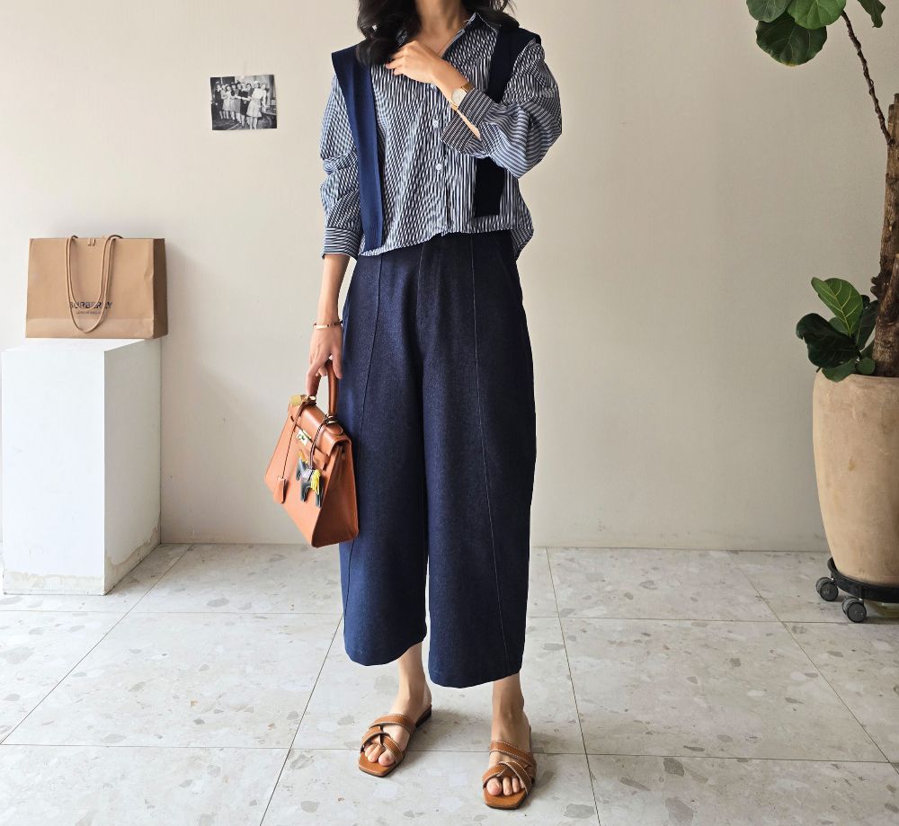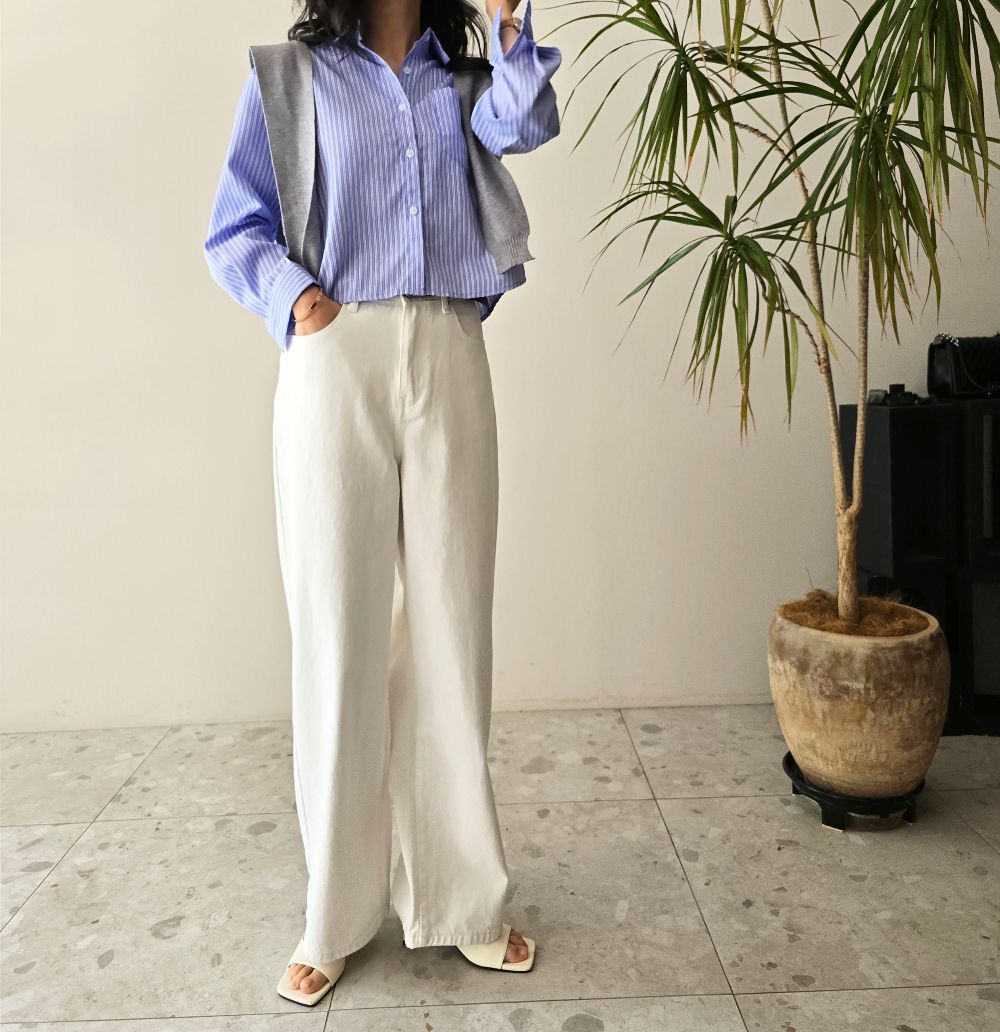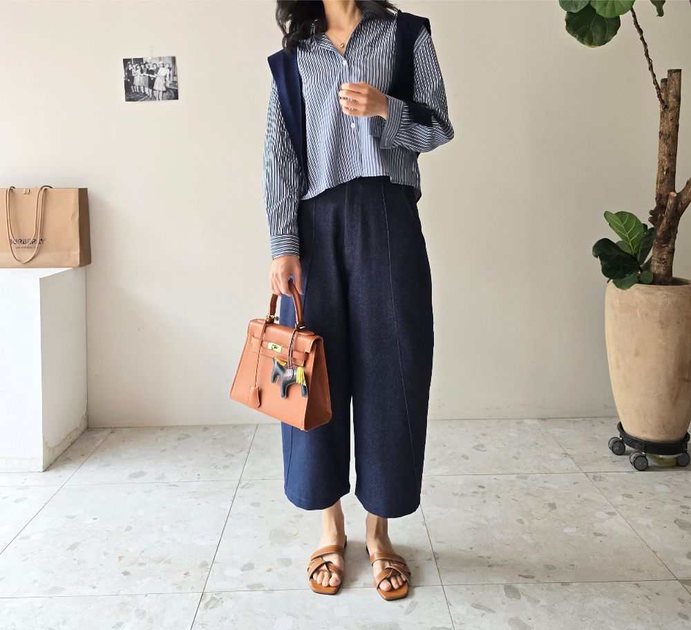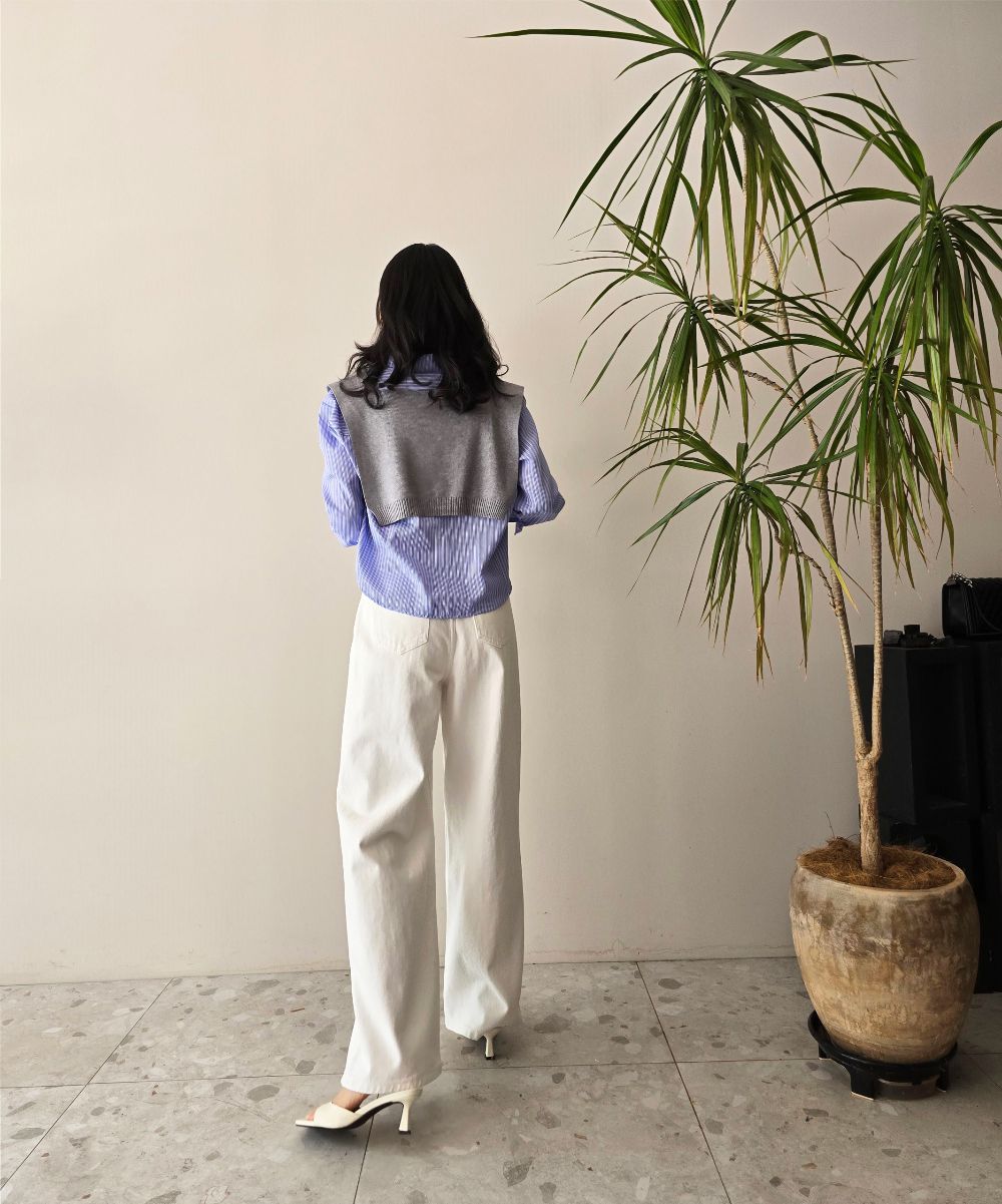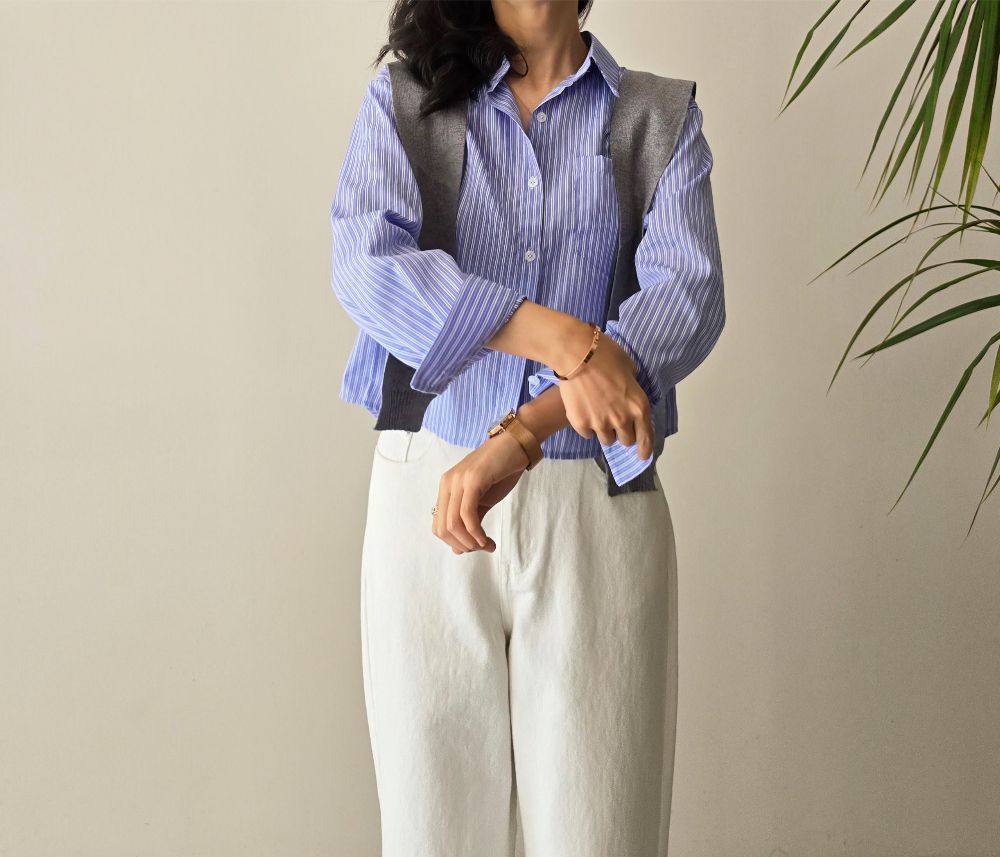 【C55290】韓國OHM 披肩襯衫套裝-條紋短版口袋長袖上衣+針織披肩