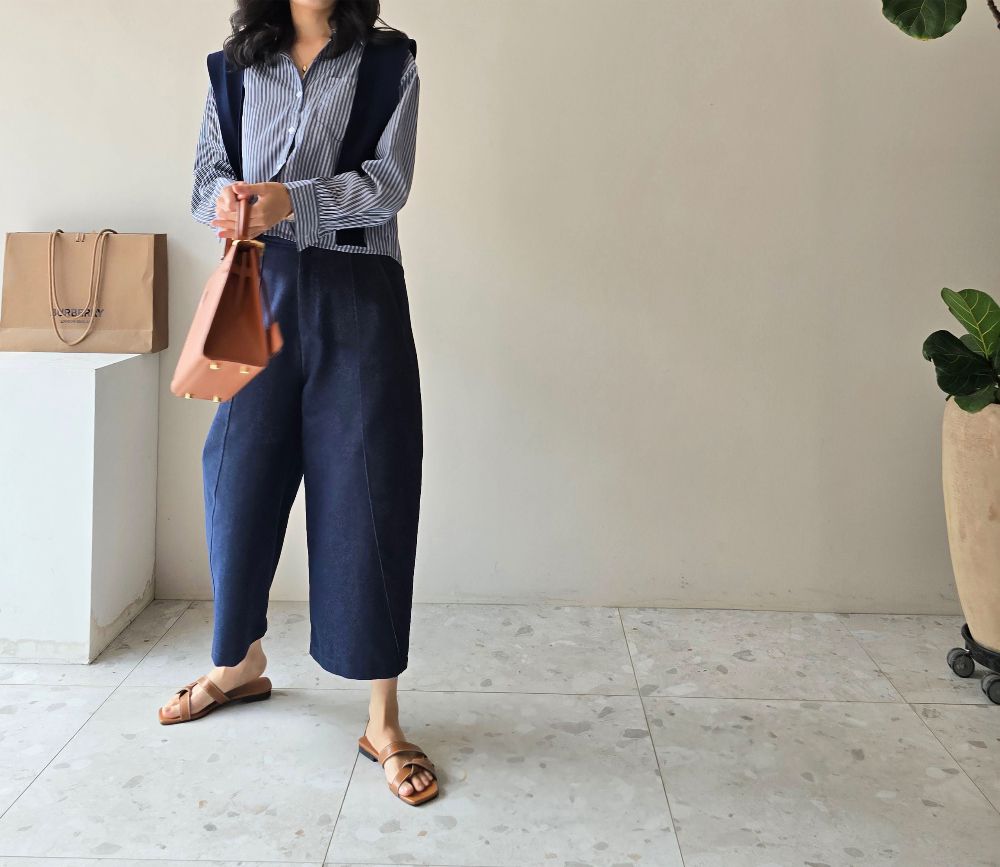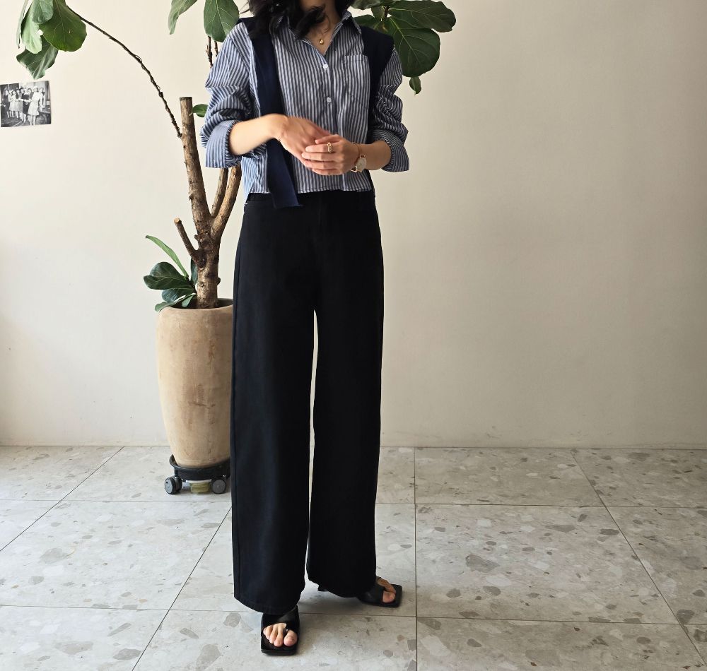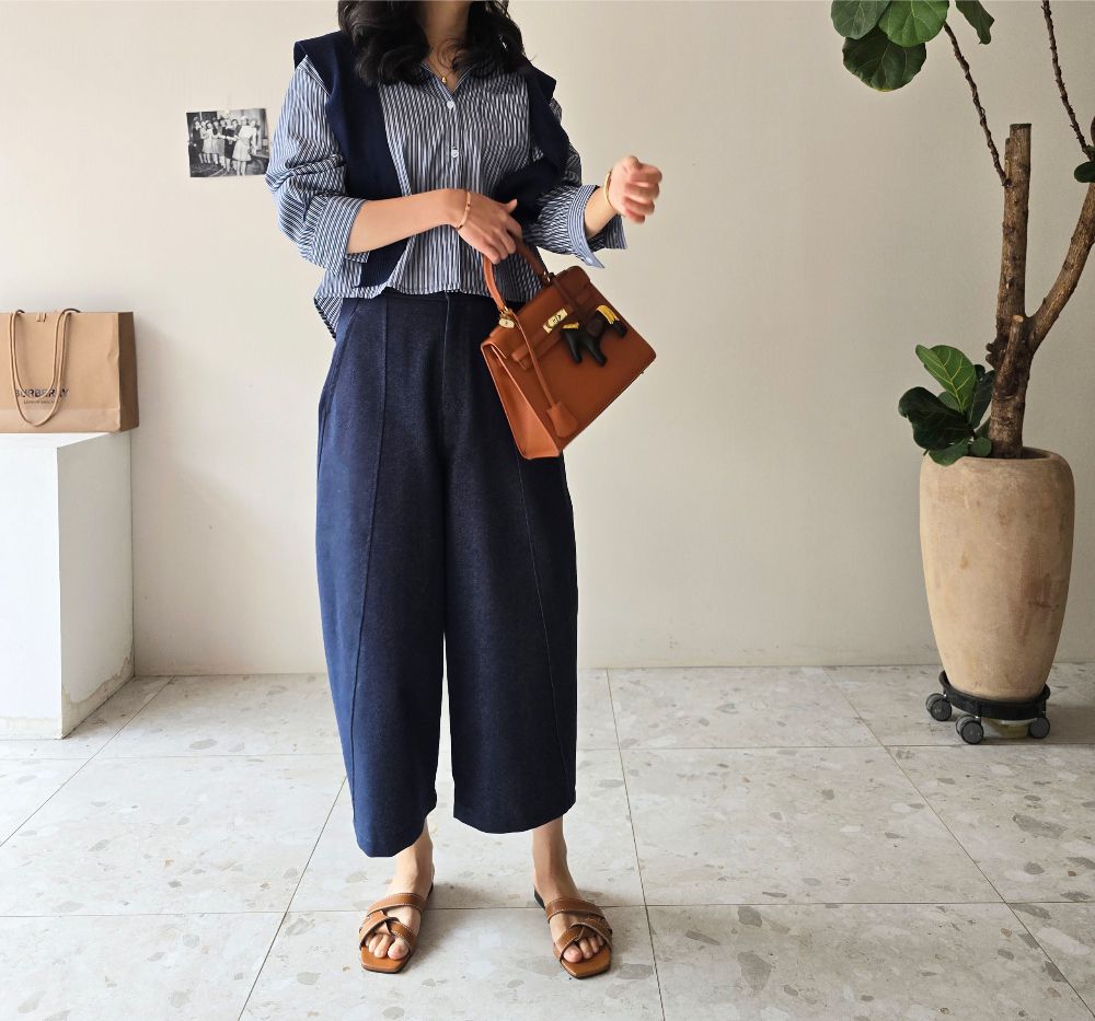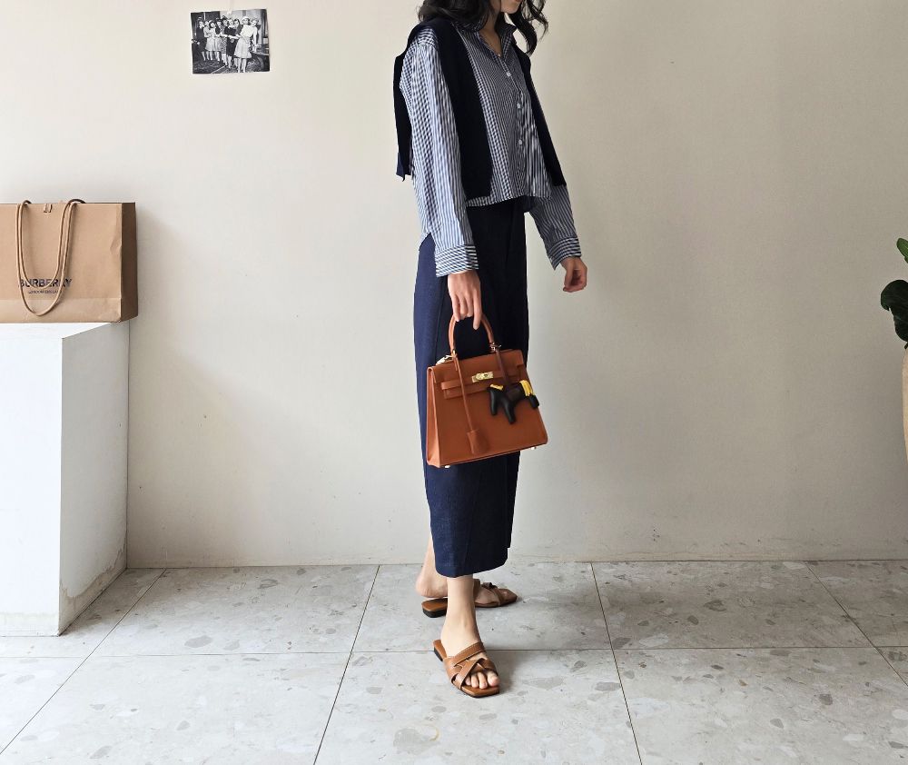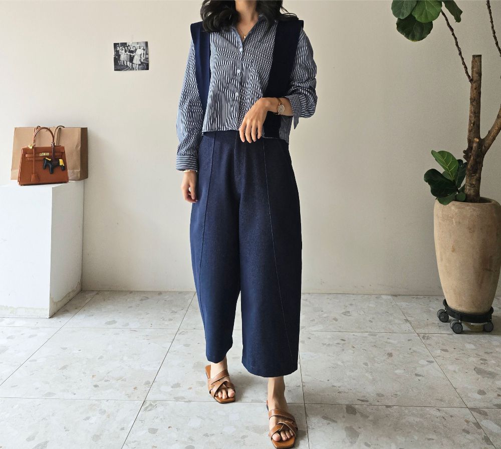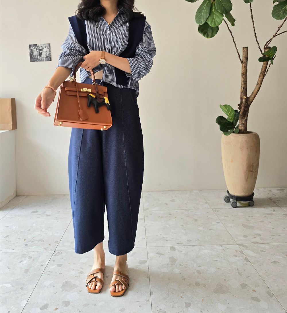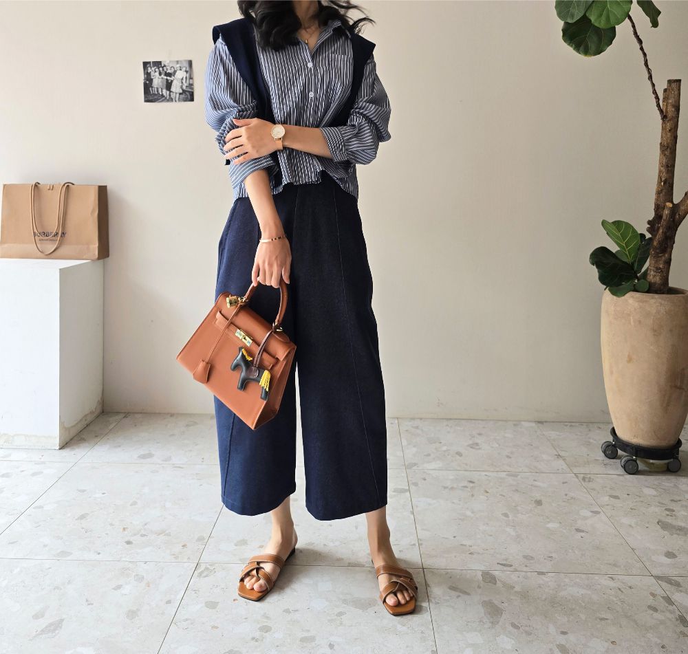 【C55290】韓國OHM 披肩襯衫套裝-條紋短版口袋長袖上衣+針織披肩