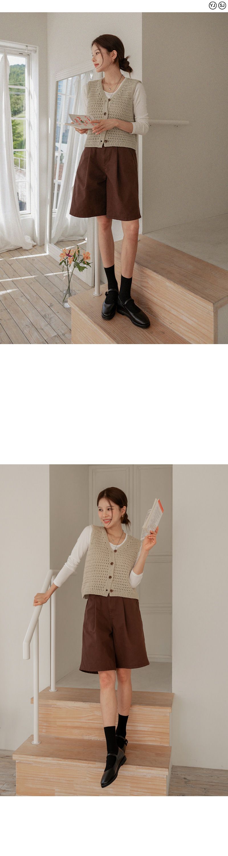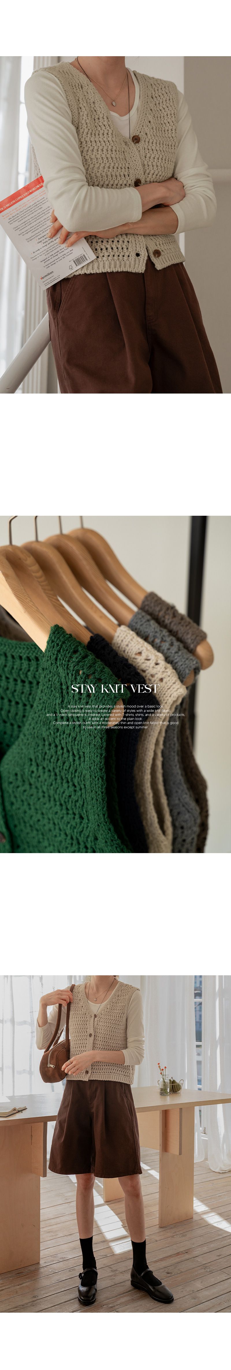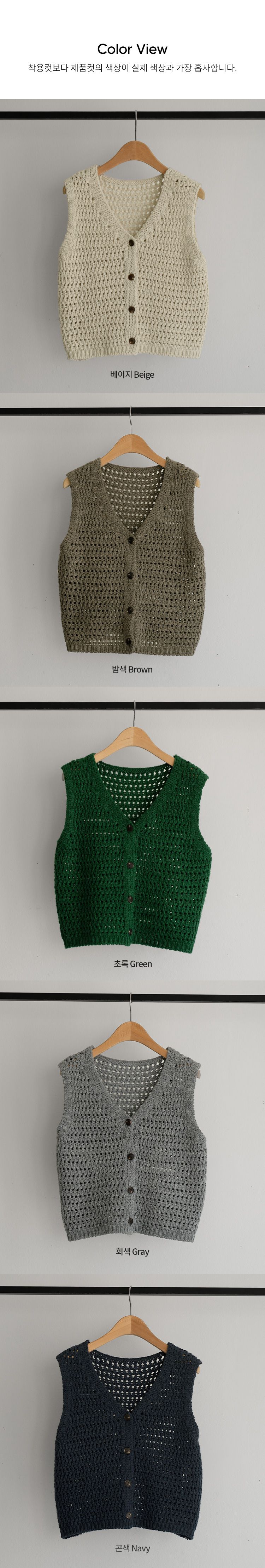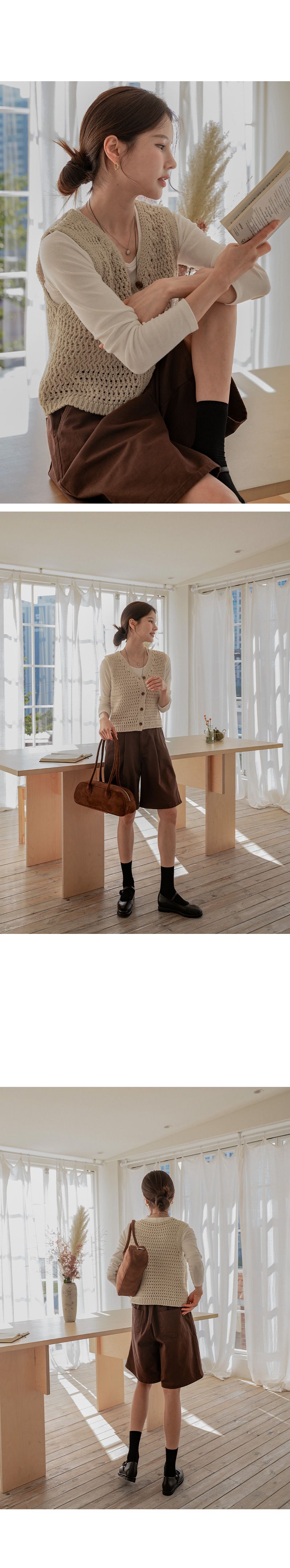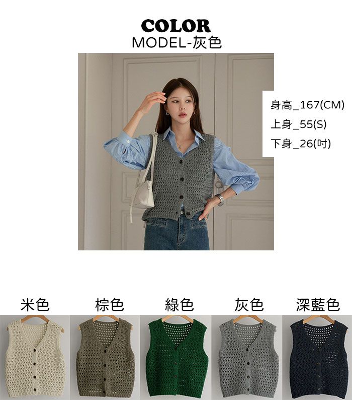粗鉤針編織/短版背心/V領/琥珀鈕釦/開襟排釦/寬肩無袖 - 休閒居家OL上班族簡約百搭素面蓬鬆鉤針背心外套針織背心無袖針織外套米色棕色綠色灰色深藍色