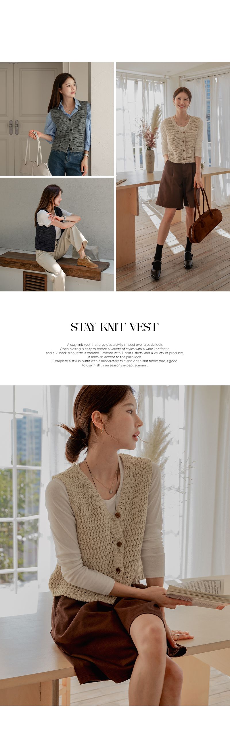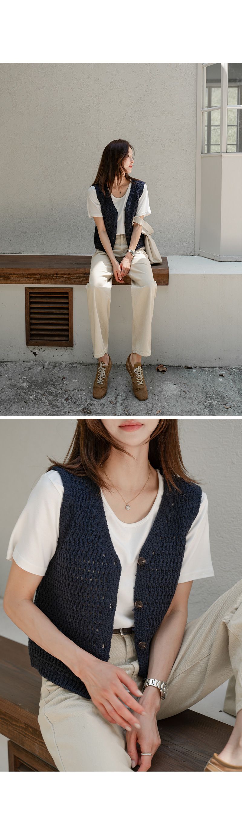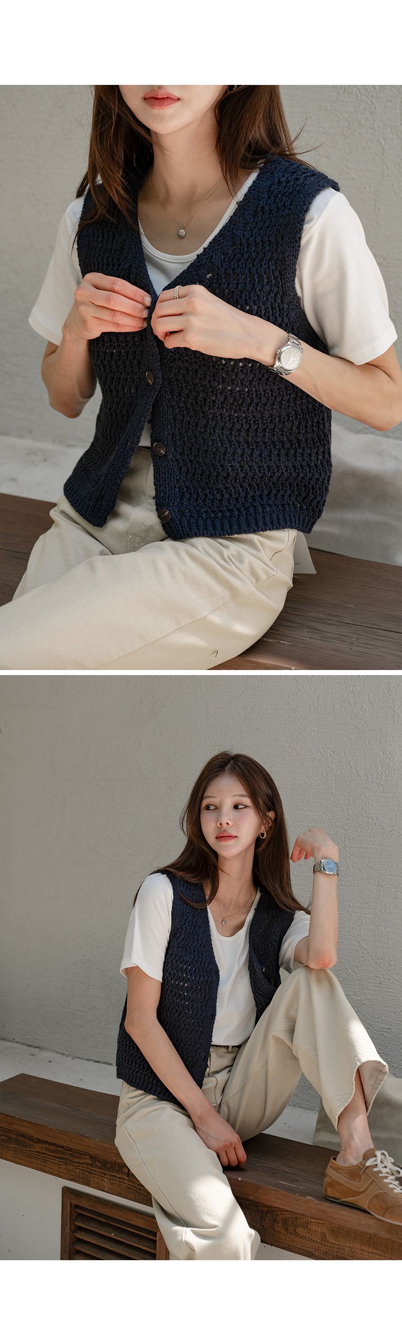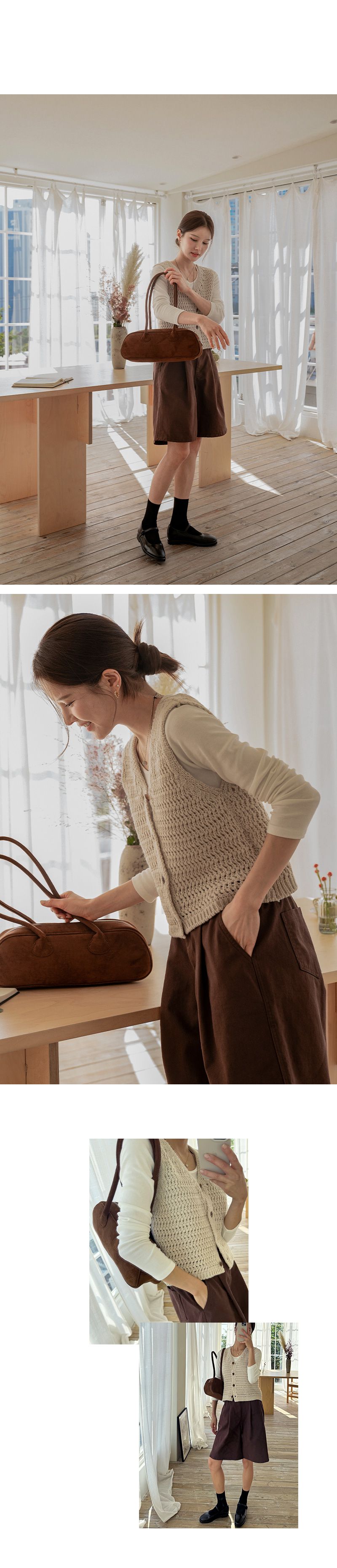 粗鉤針編織/短版背心/V領/琥珀鈕釦/開襟排釦/寬肩無袖 - 休閒居家OL上班族簡約百搭素面蓬鬆鉤針背心外套針織背心無袖針織外套米色棕色綠色灰色深藍色