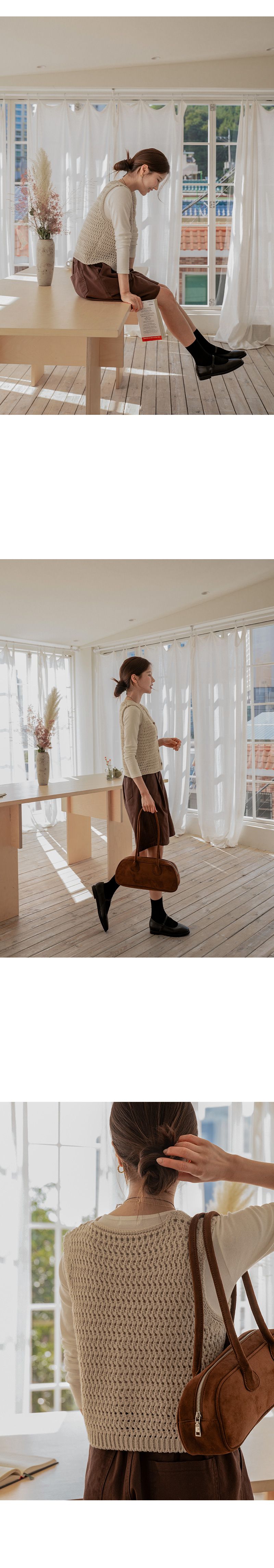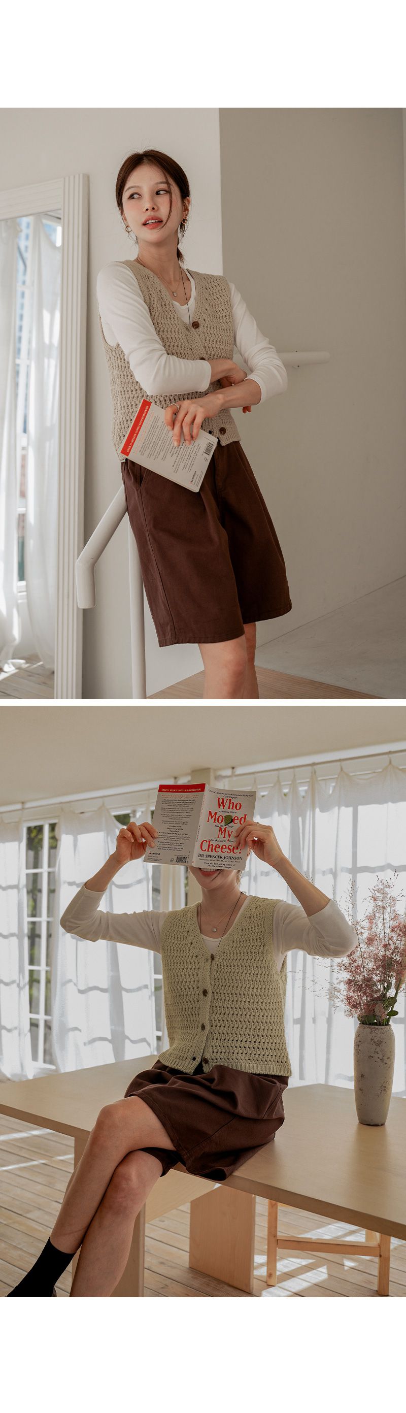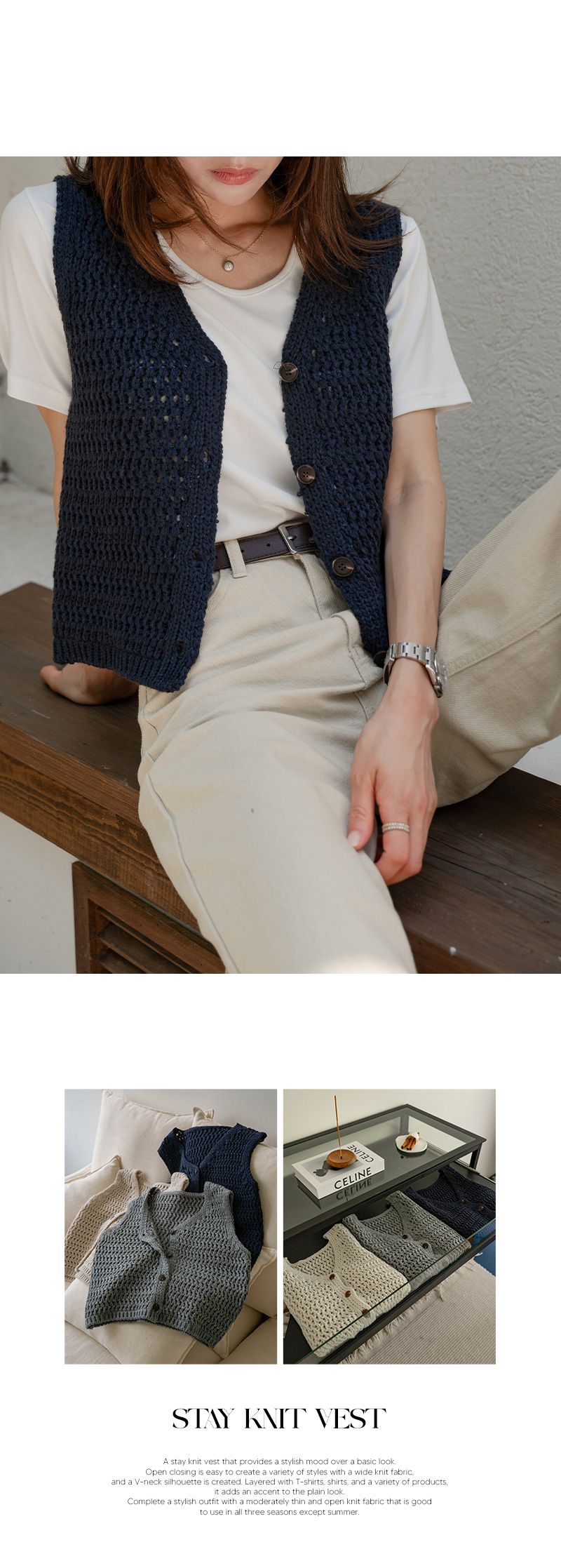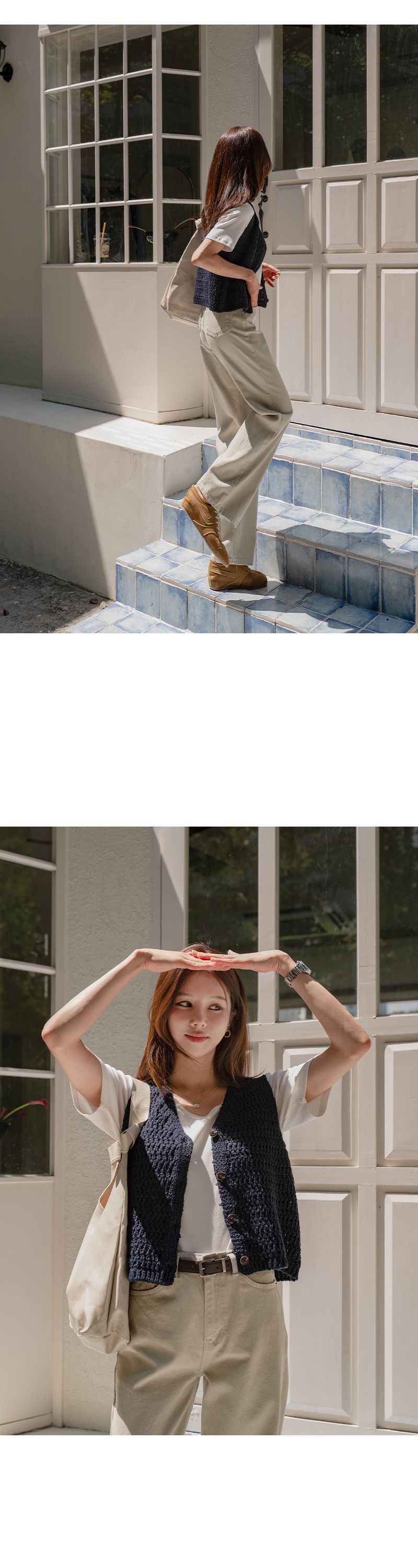 粗鉤針編織/短版背心/V領/琥珀鈕釦/開襟排釦/寬肩無袖 - 休閒居家OL上班族簡約百搭素面蓬鬆鉤針背心外套針織背心無袖針織外套米色棕色綠色灰色深藍色
