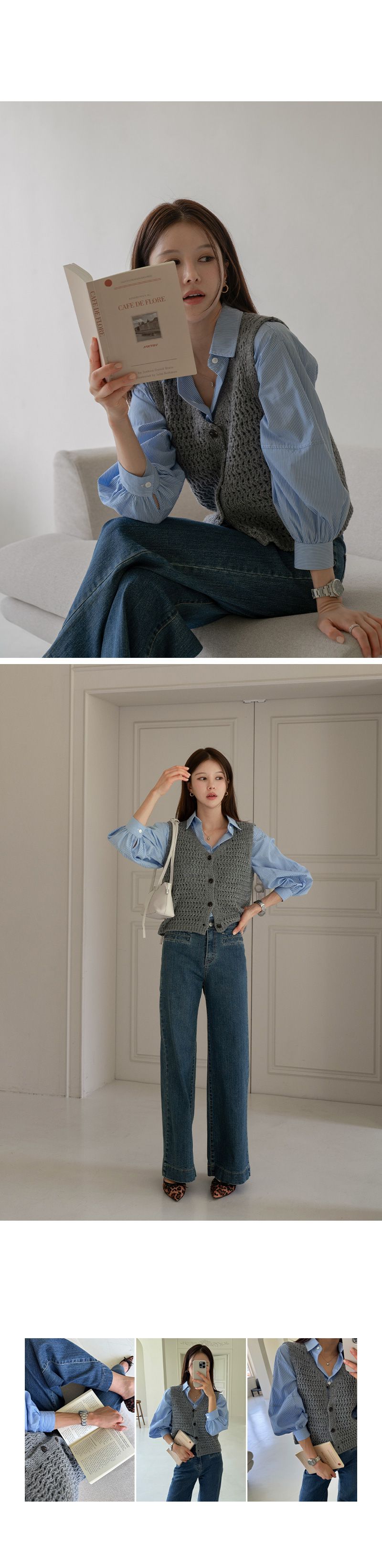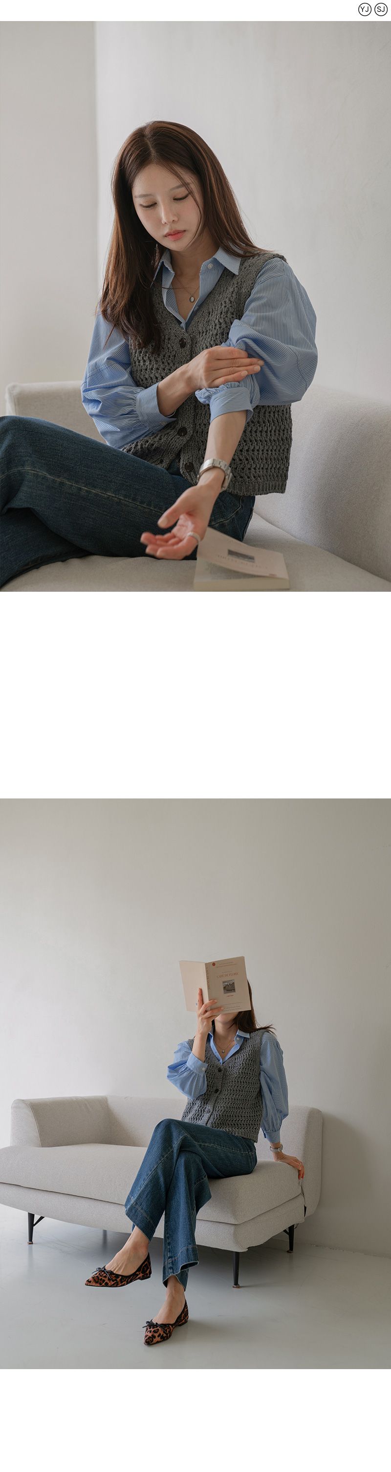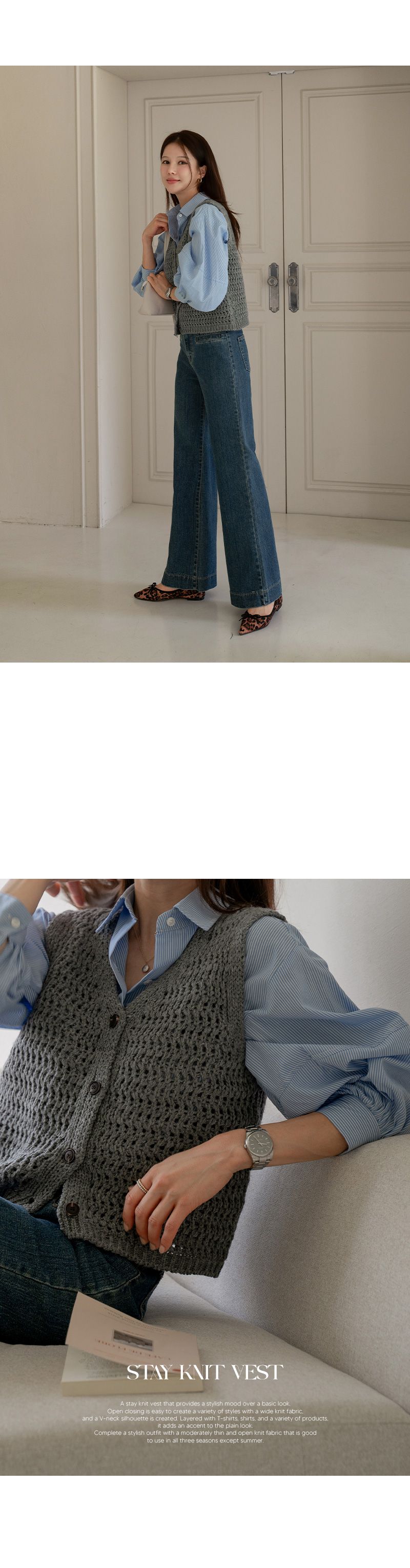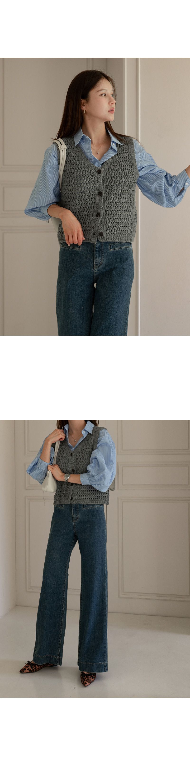 【C55295】韓國CAN 蓬鬆鉤針背心-短版素面V領琥珀排釦無袖針織外套★★
