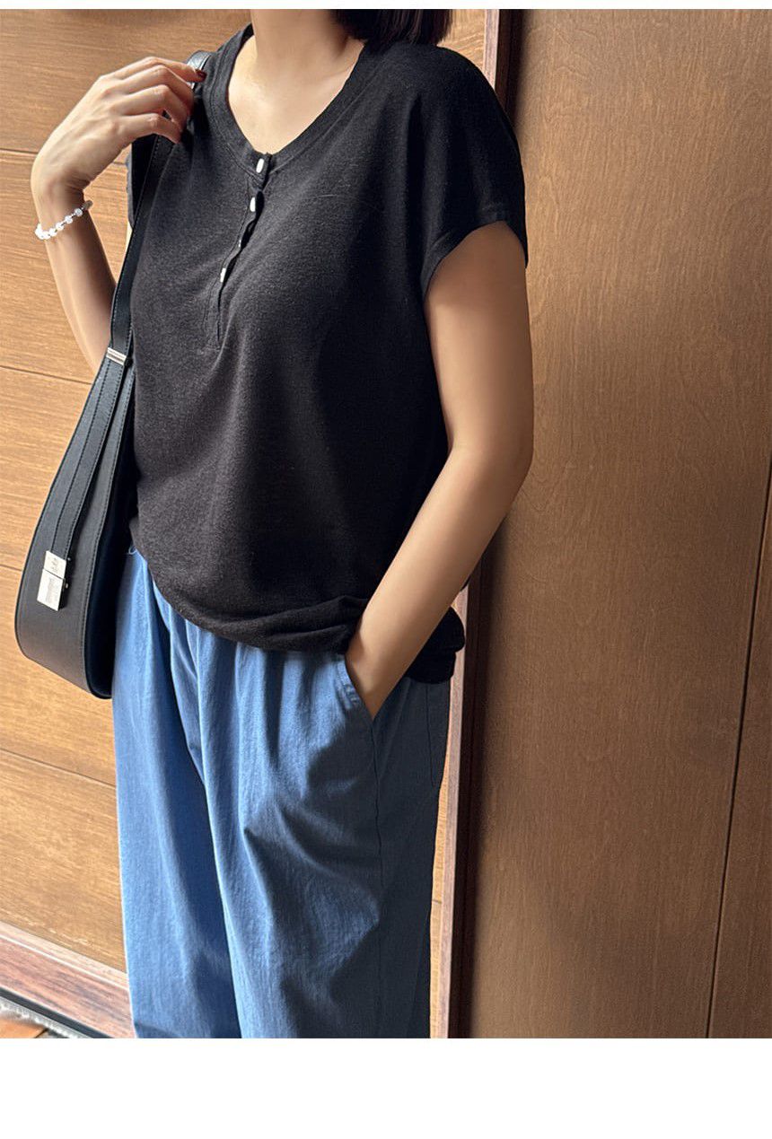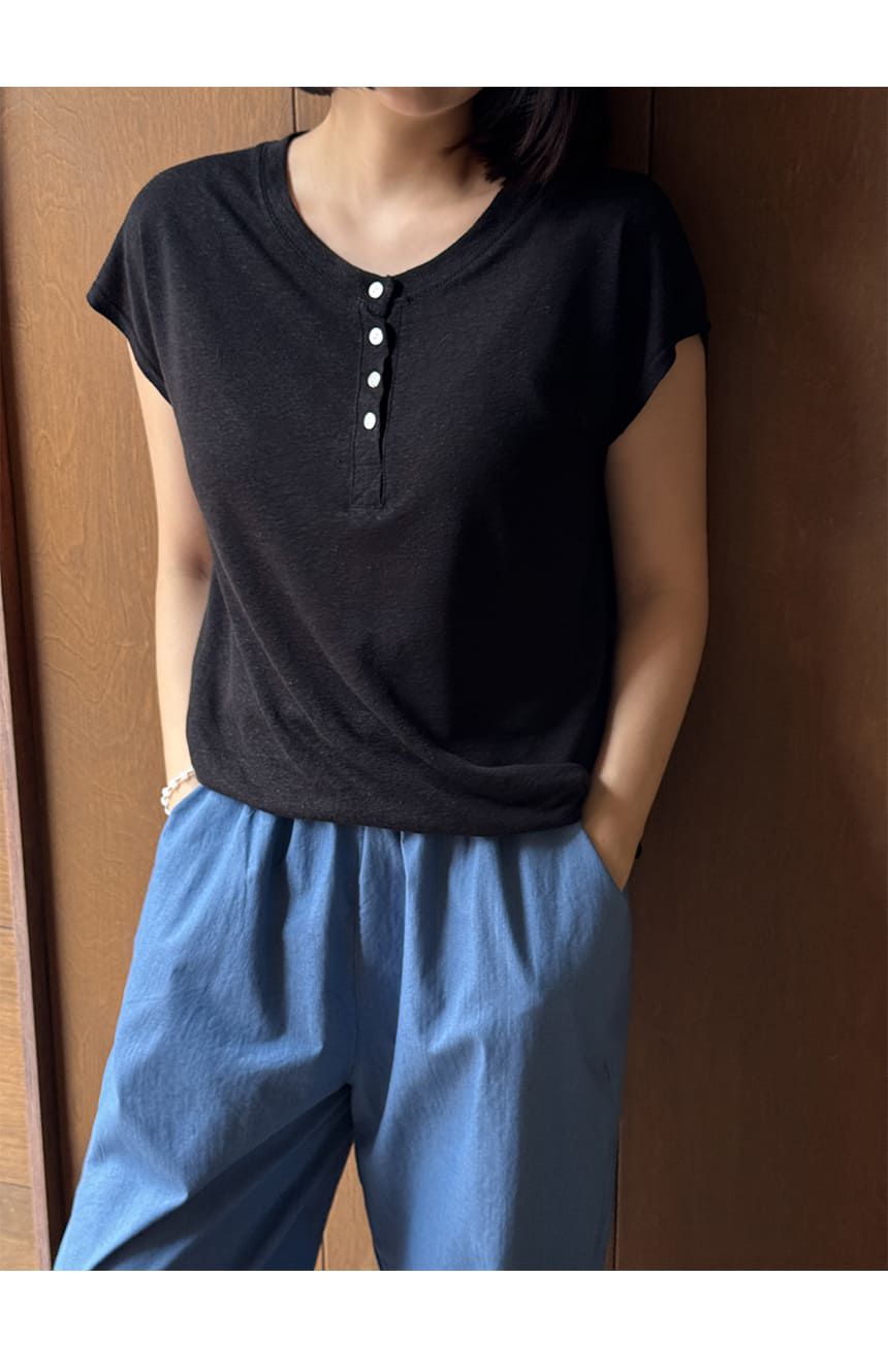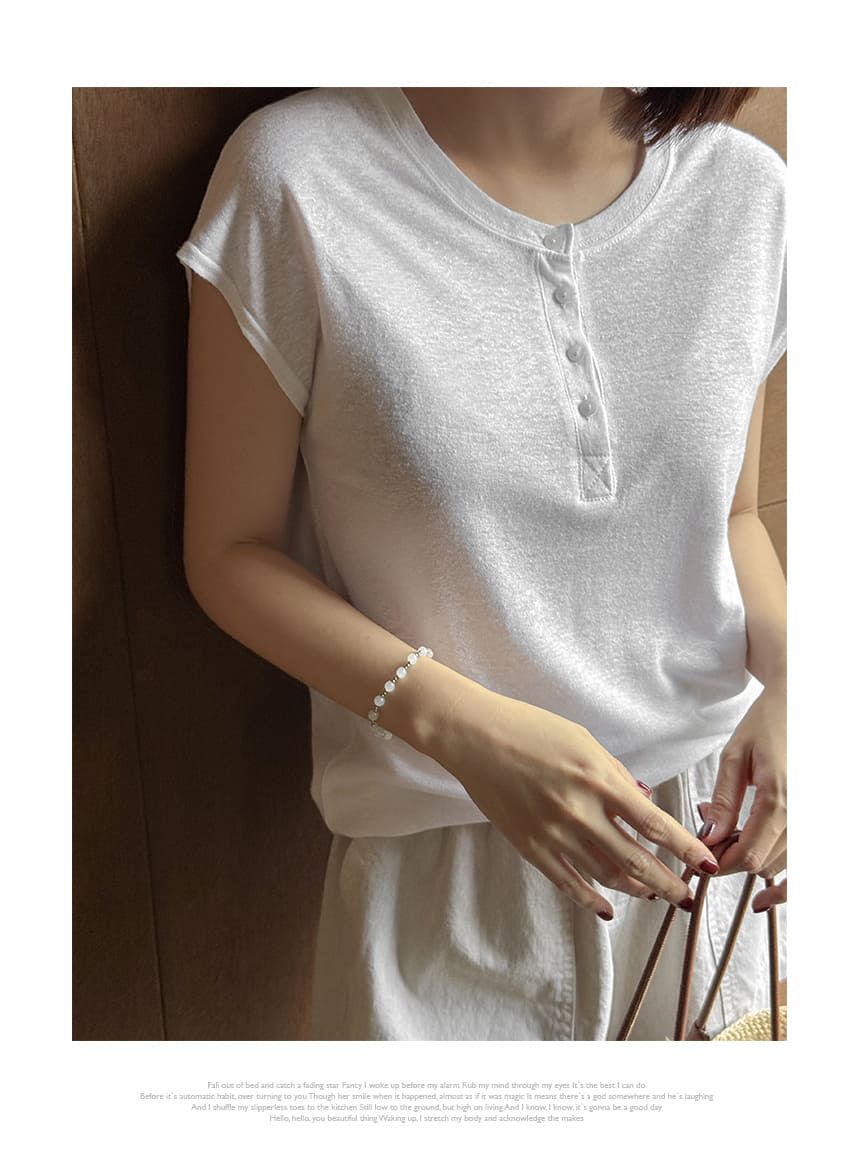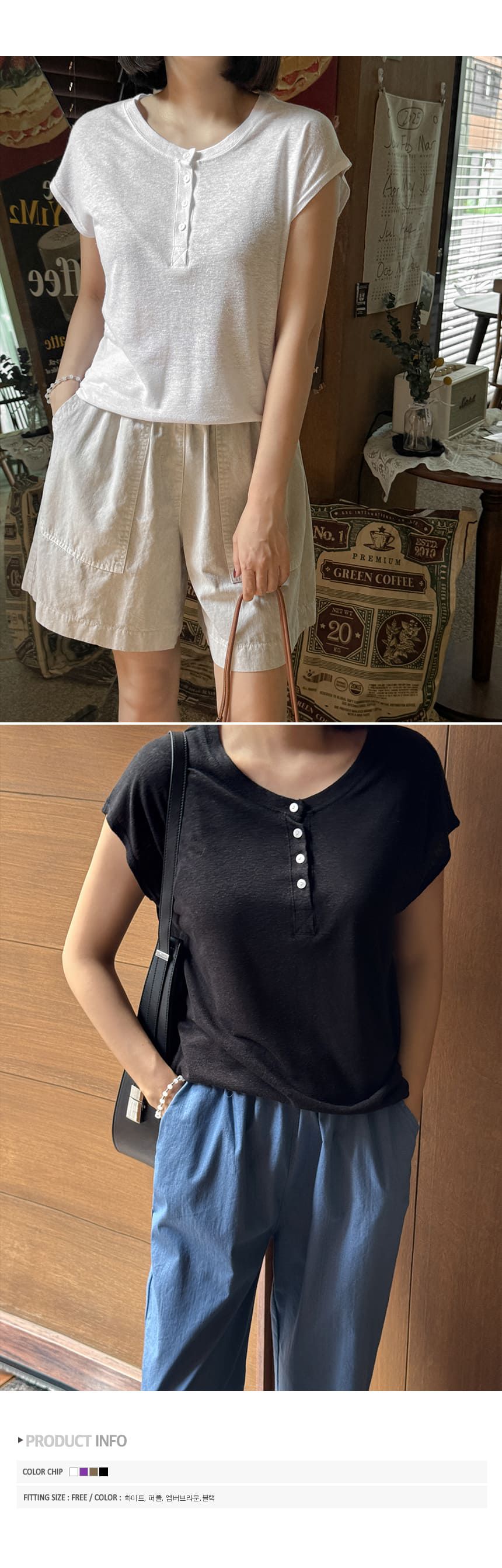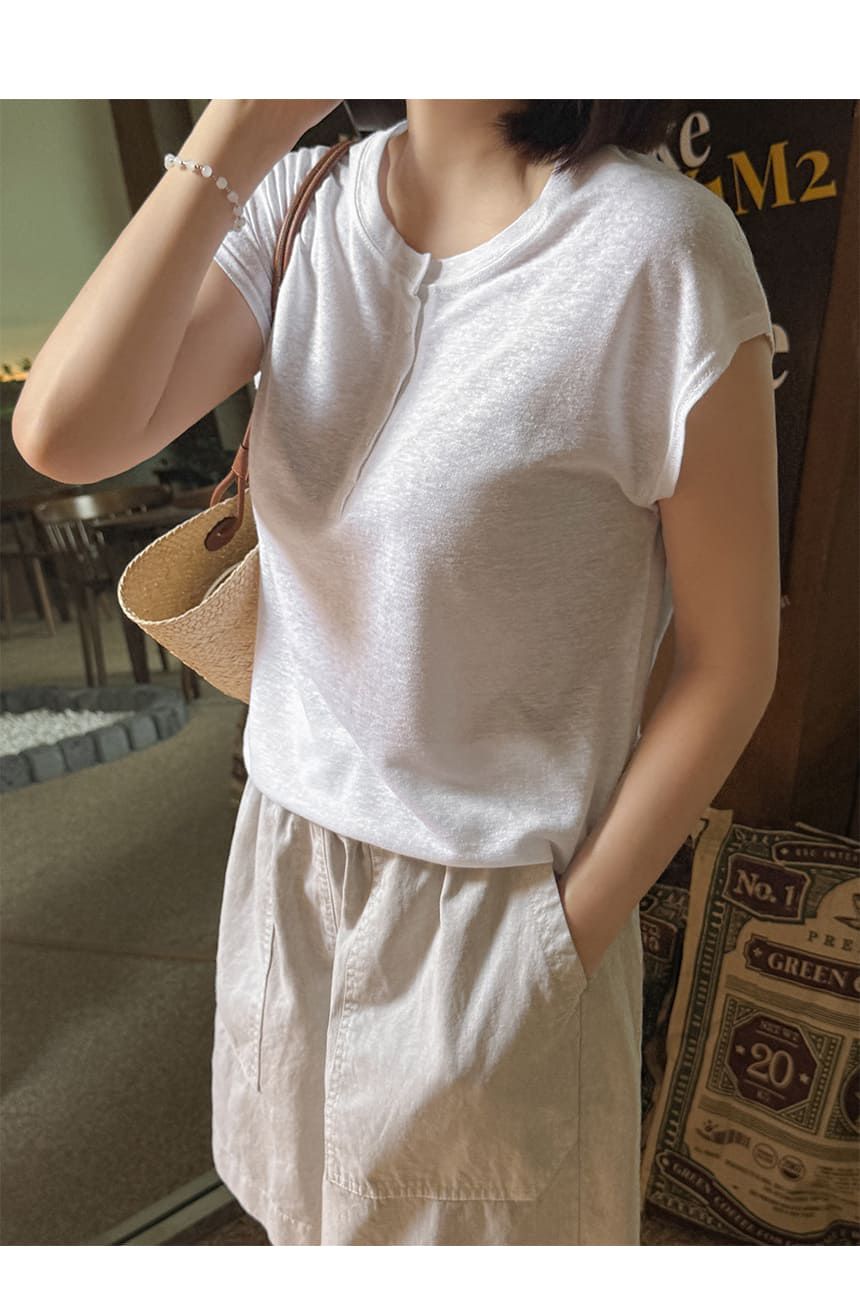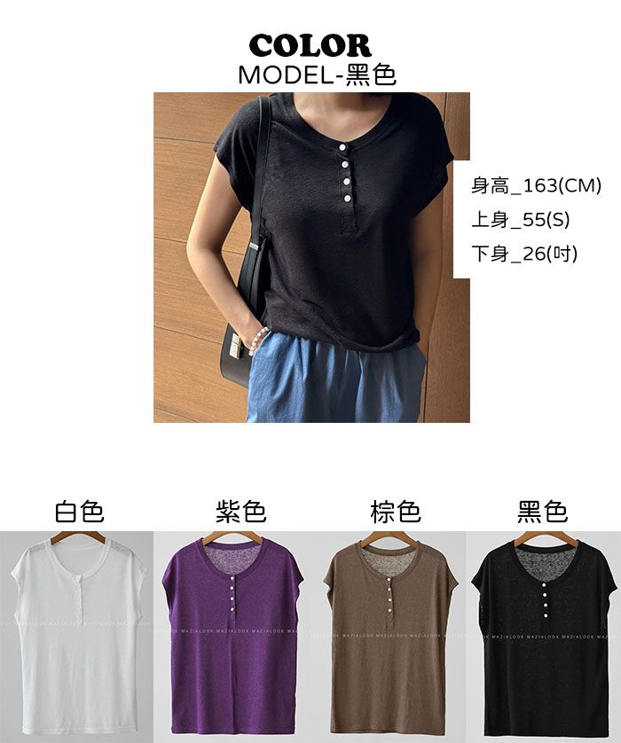 輕薄混亞麻上衣/半開襟排釦/圓領/連肩袖 - 休閒居家渡假簡約百搭素面混亞麻包肩上衣短袖T恤短袖上衣白色紫色棕色黑色
