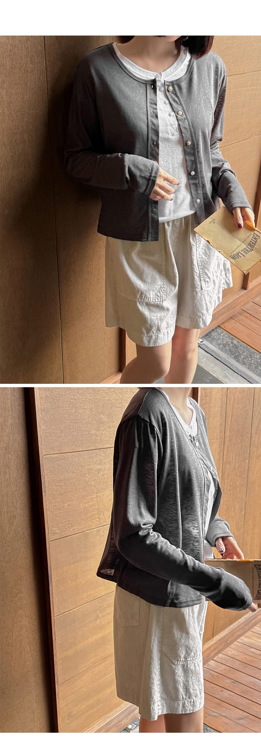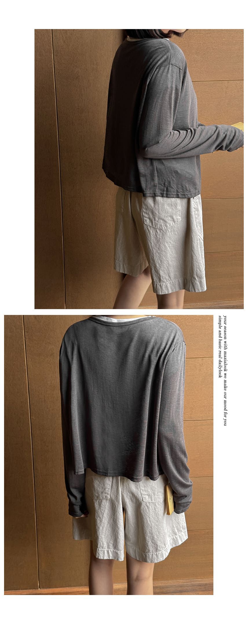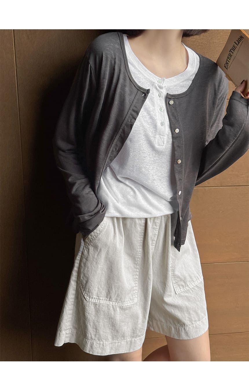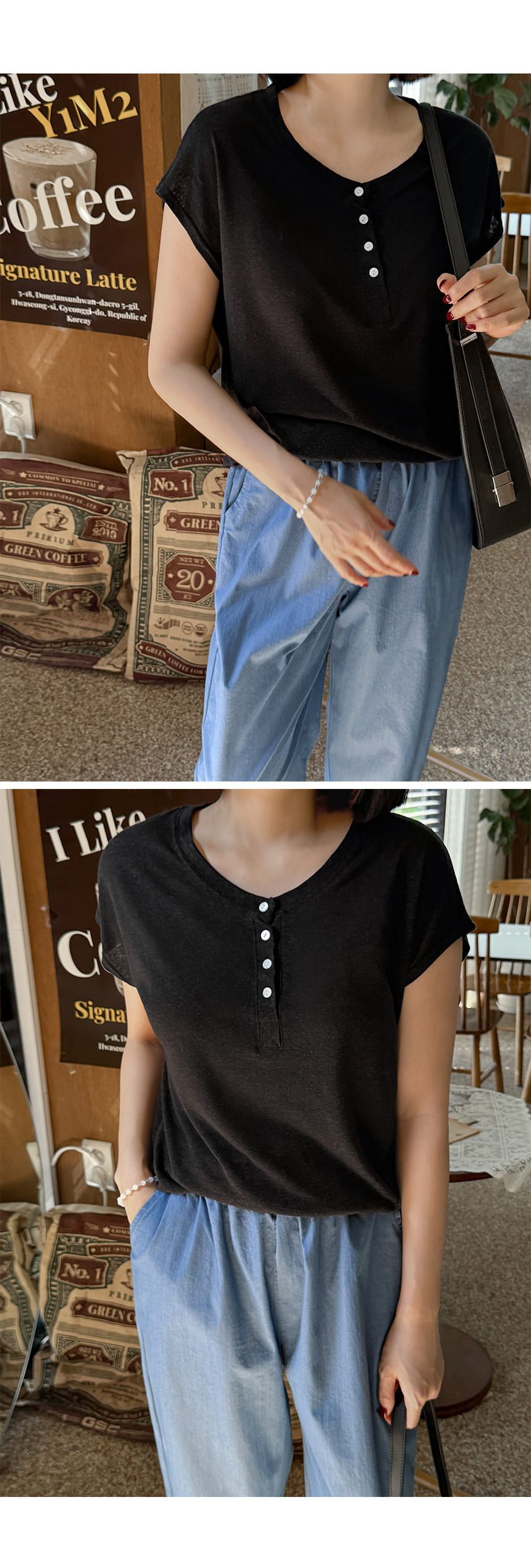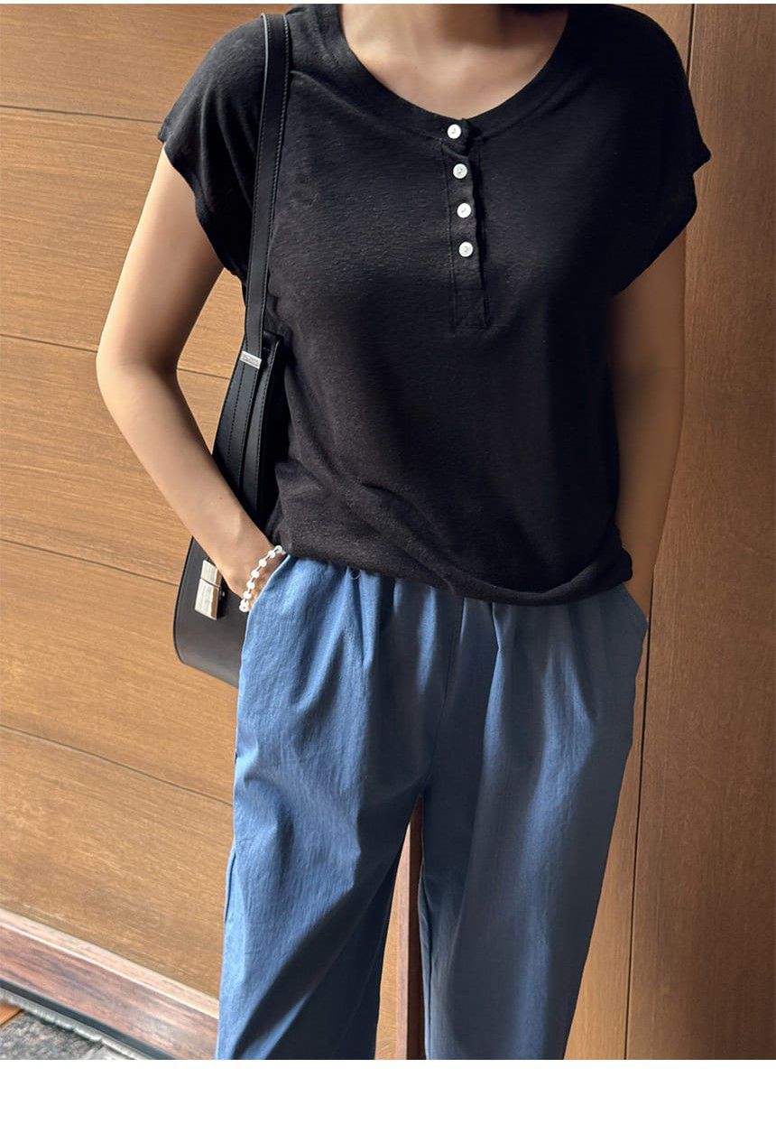 輕薄混亞麻上衣/半開襟排釦/圓領/連肩袖 - 休閒居家渡假簡約百搭素面混亞麻包肩上衣短袖T恤短袖上衣白色紫色棕色黑色