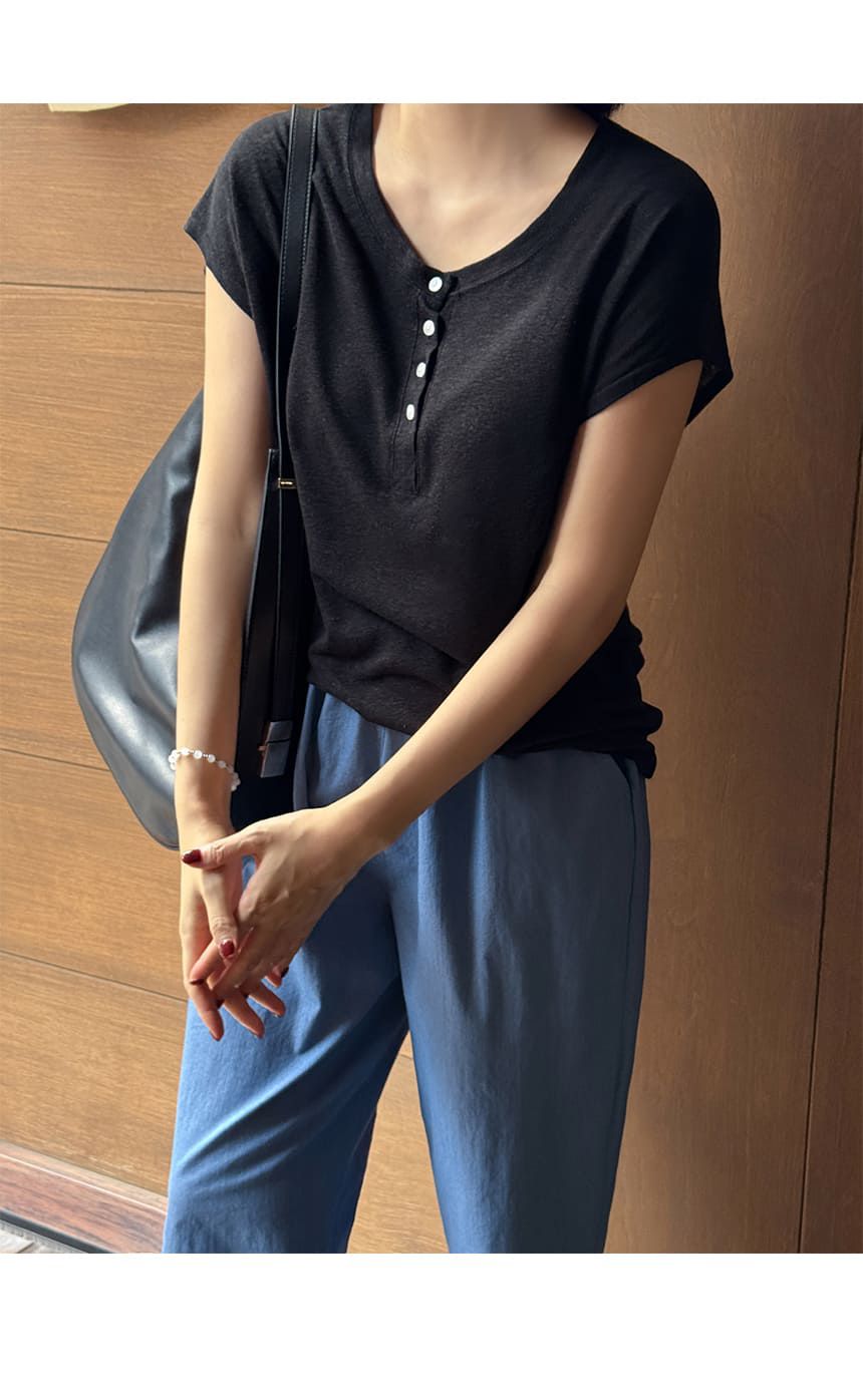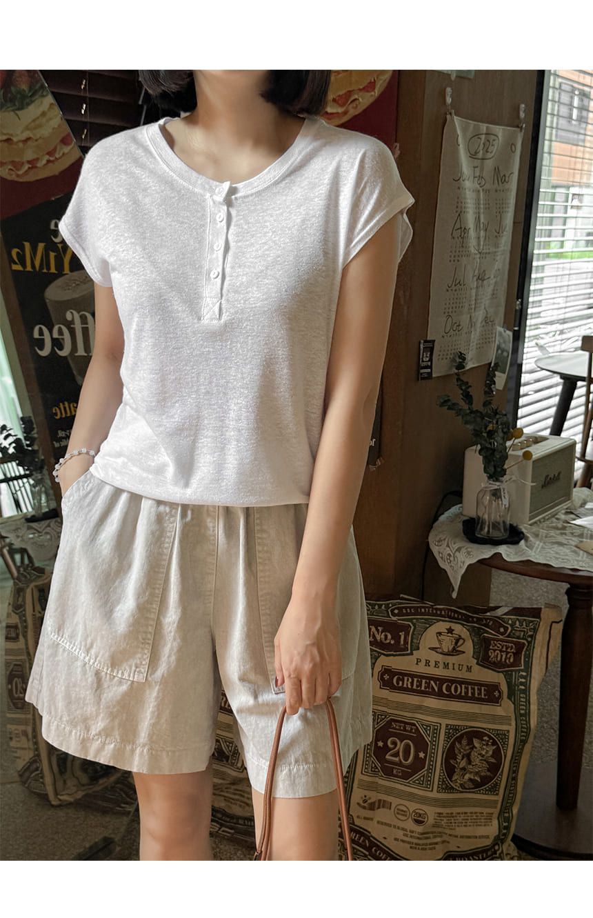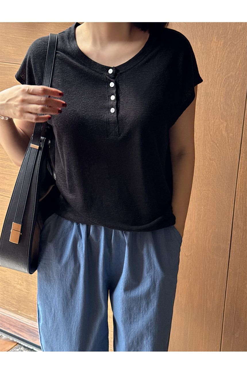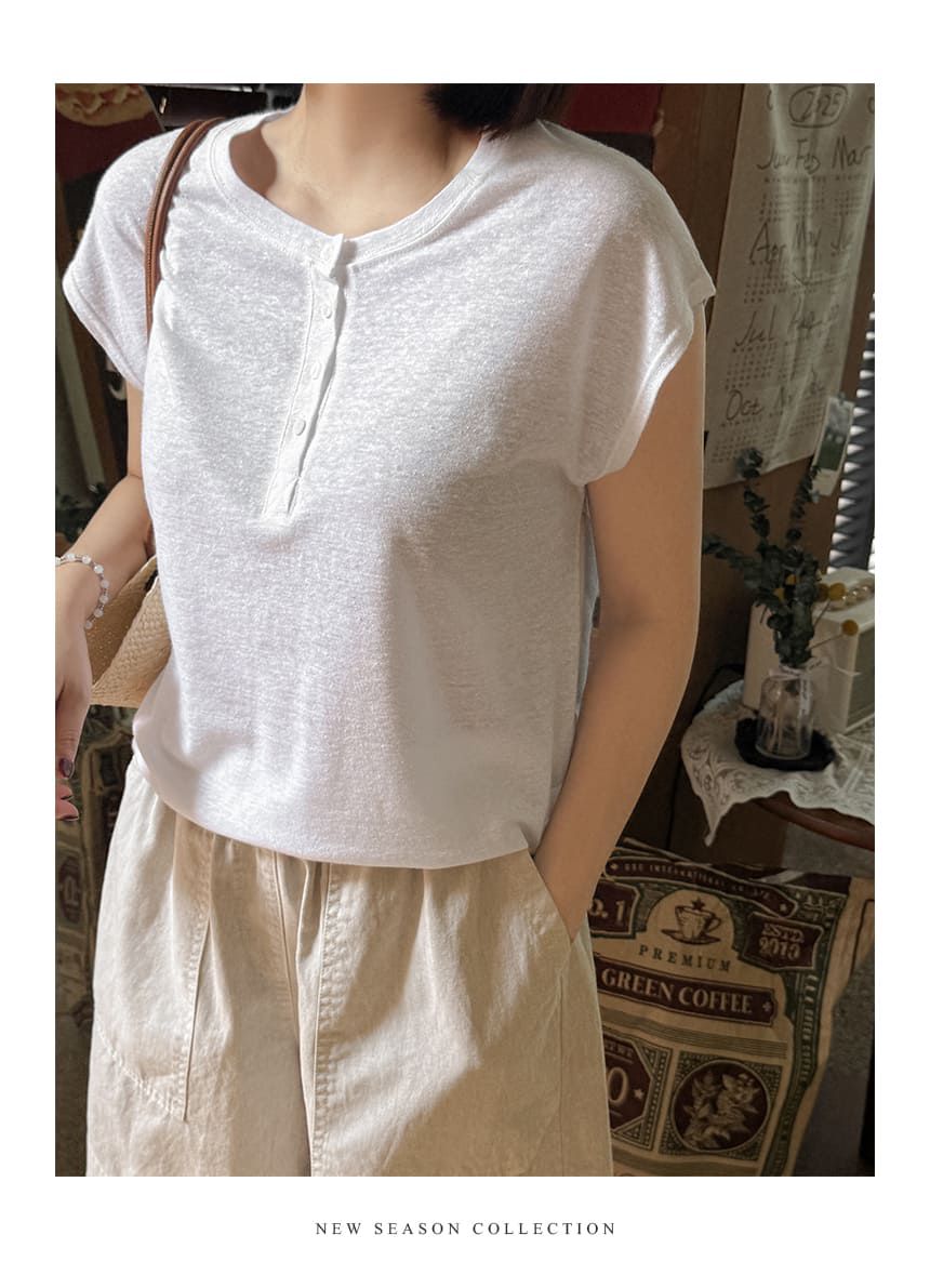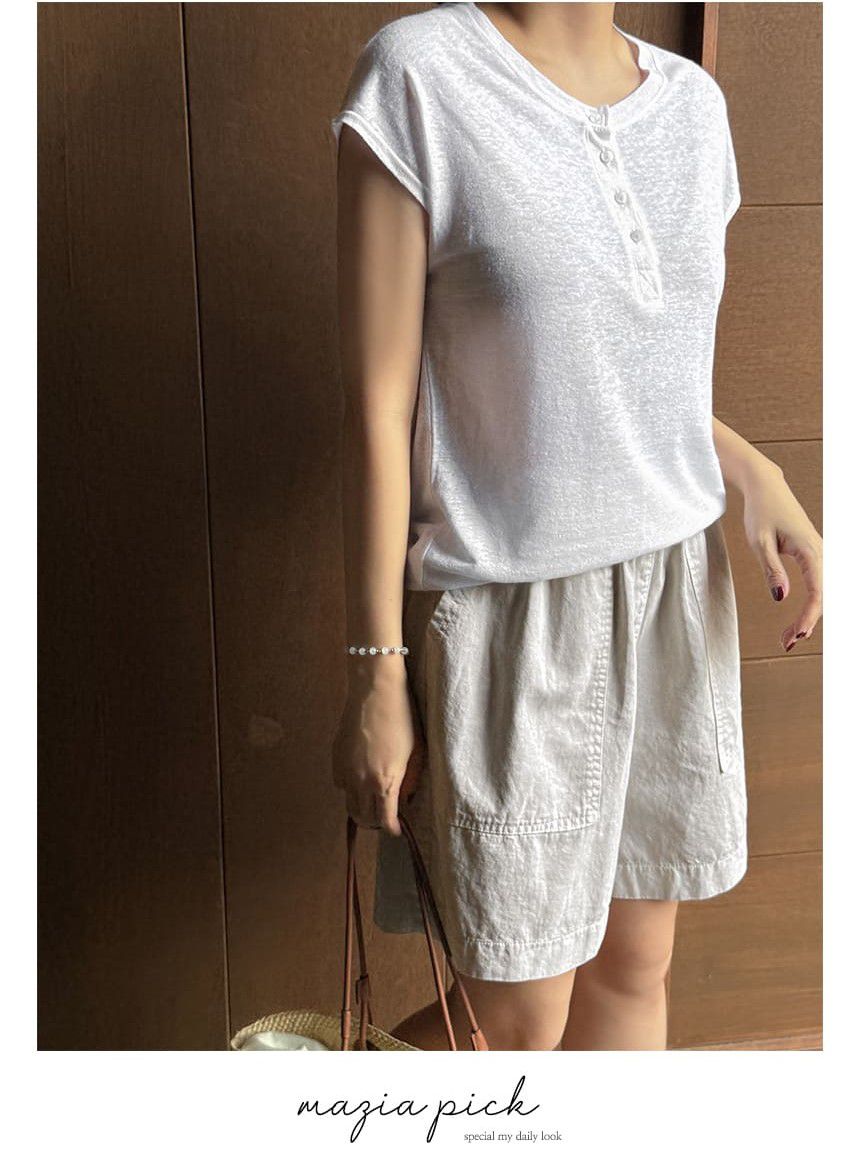 【C55299】韓國MAZ 混亞麻包肩上衣-素面半開襟圓領輕薄短袖T恤