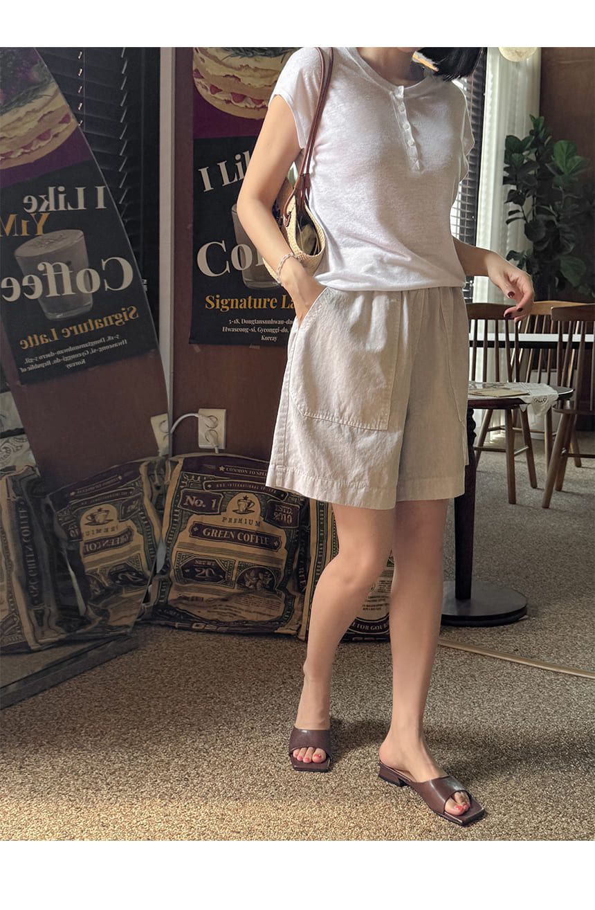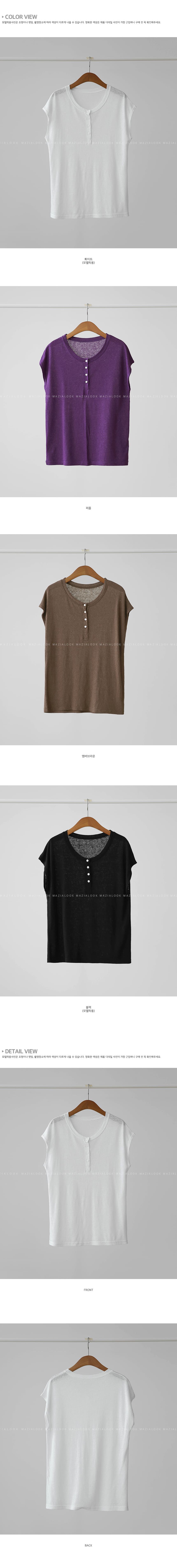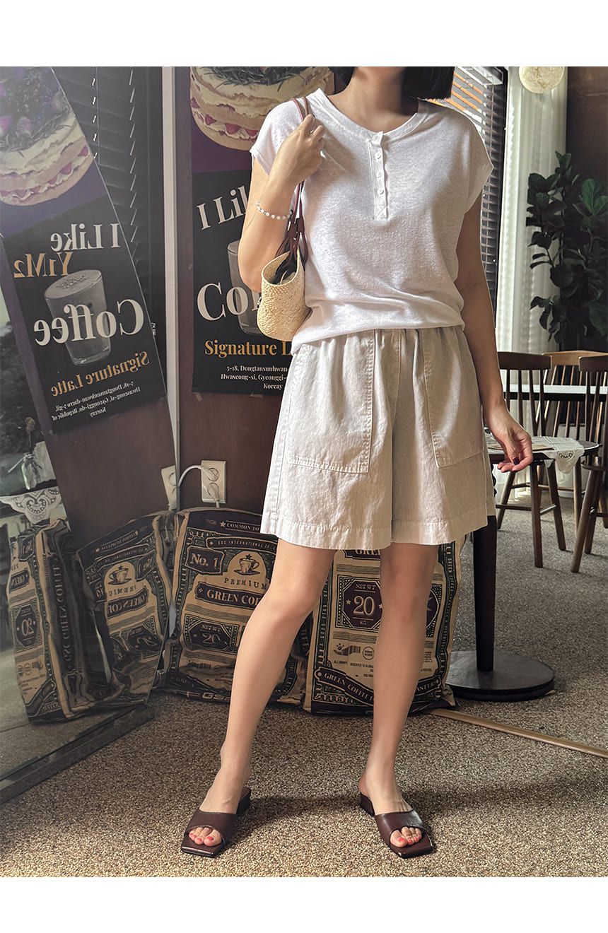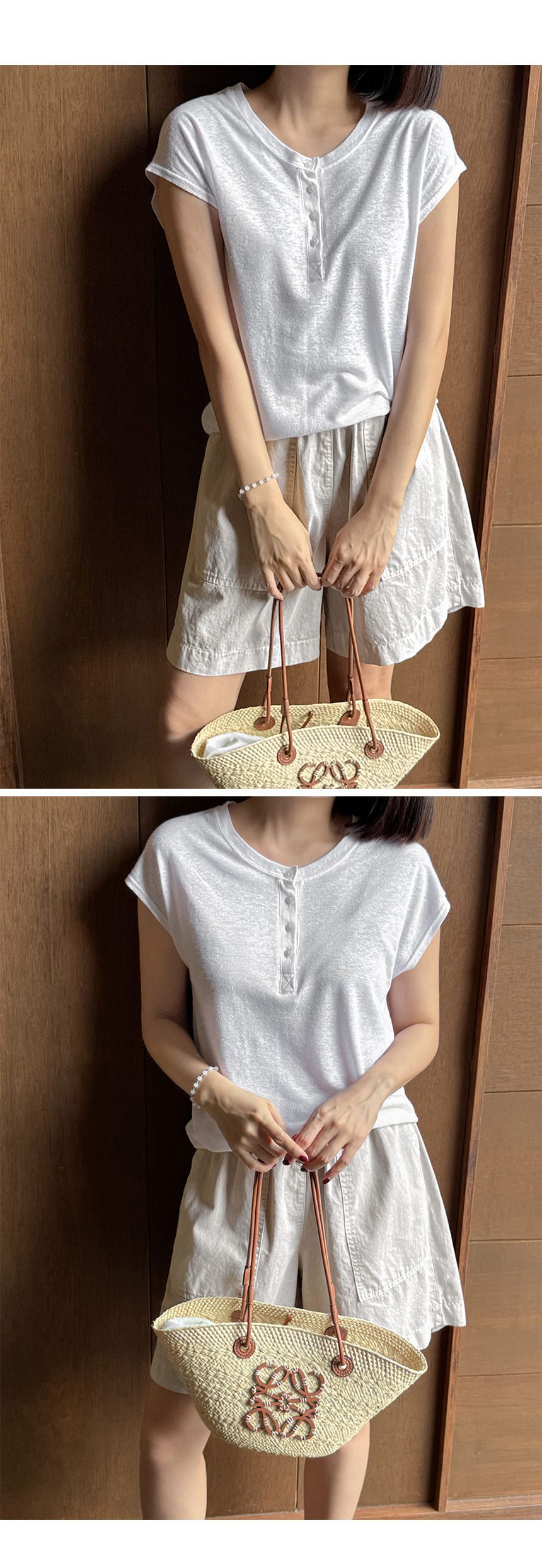 【C55299】韓國MAZ 混亞麻包肩上衣-素面半開襟圓領輕薄短袖T恤