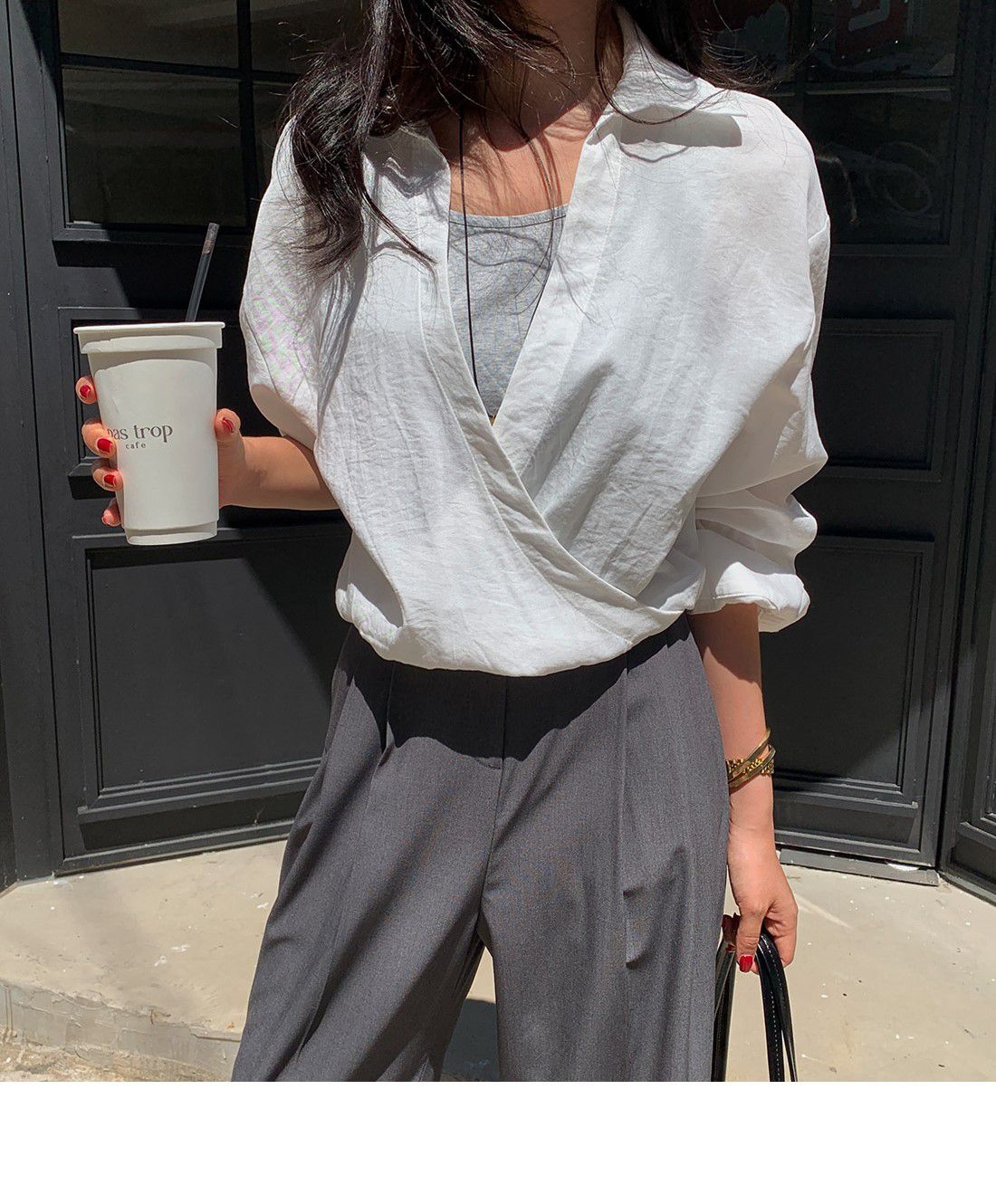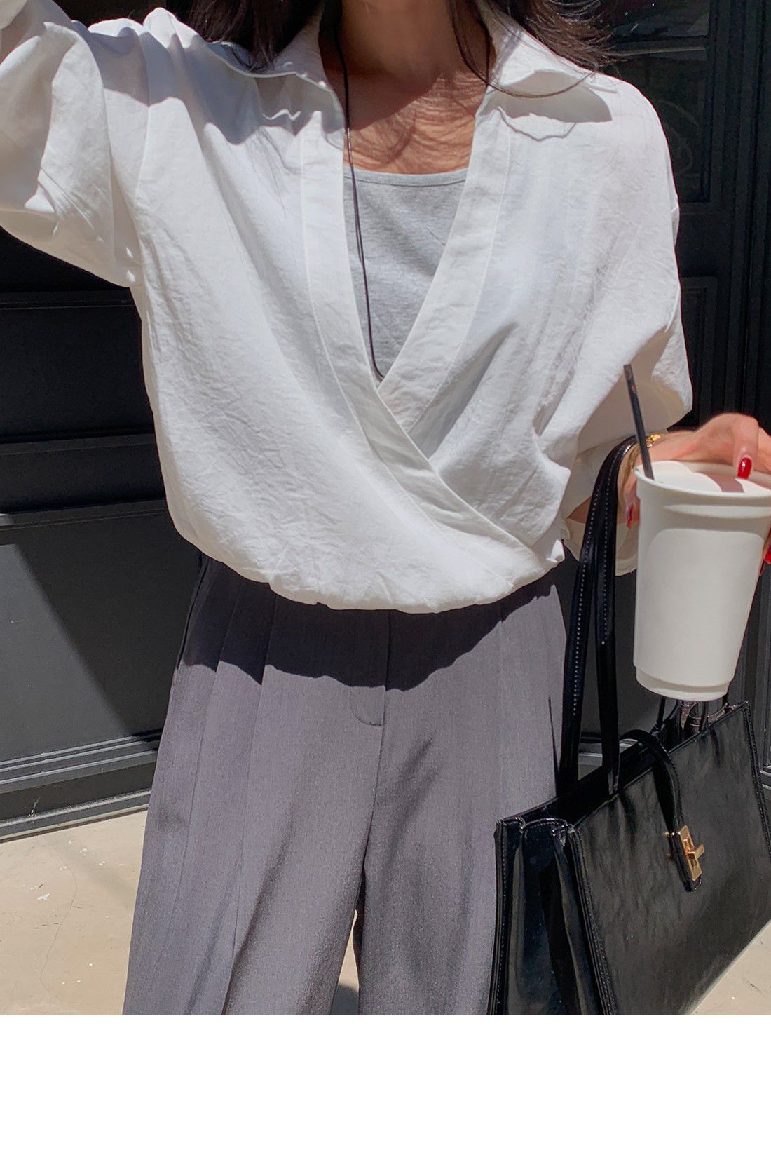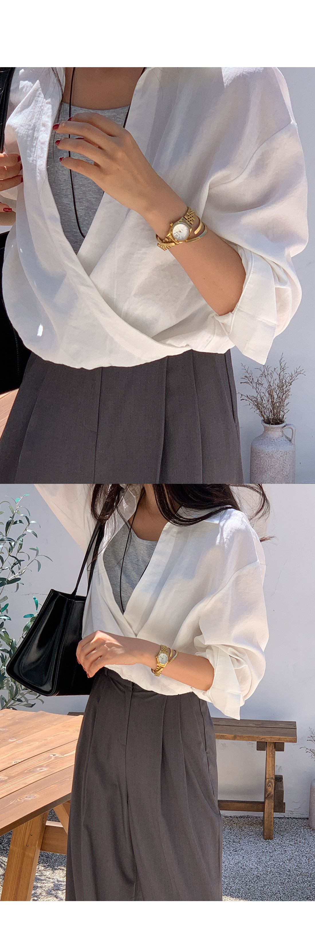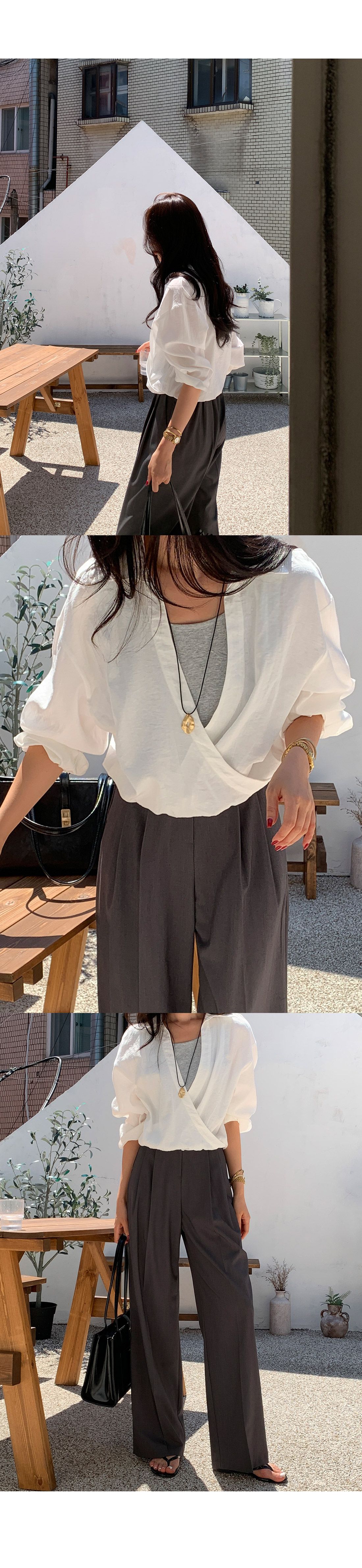 假兩件拼接/U領背心/交叉V領/鬆緊收腰/鬆緊下襬 - 休閒居家OL上班族簡約百搭素面假兩件交叉襯衫上衣長袖上衣白色