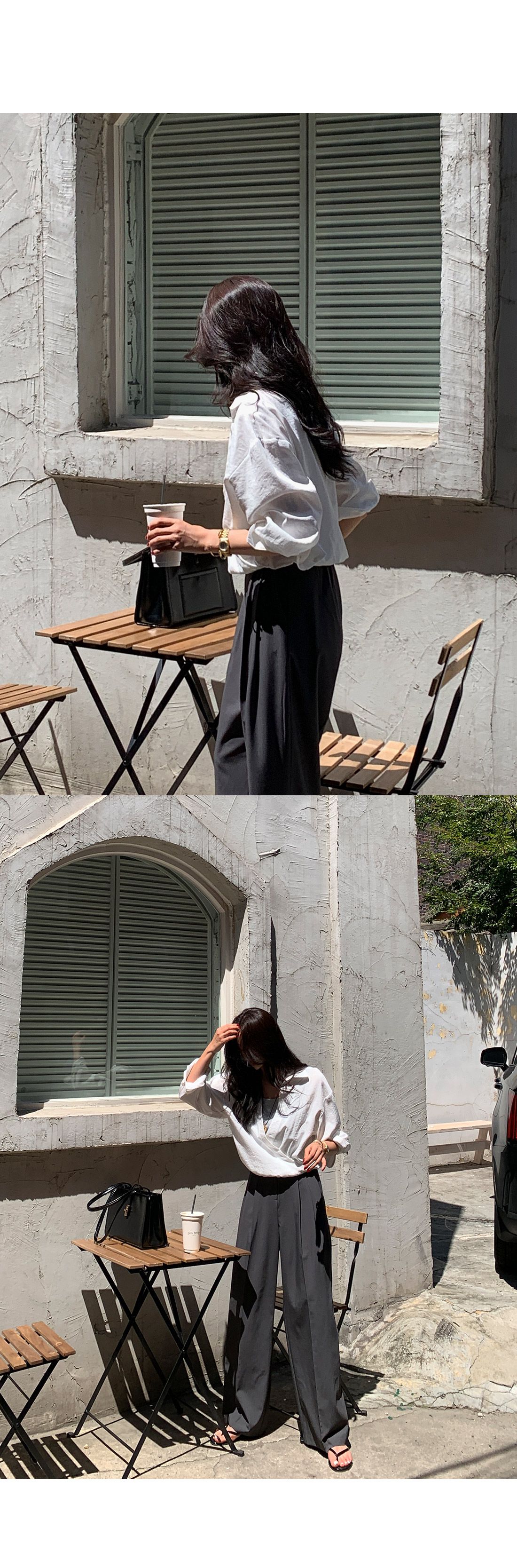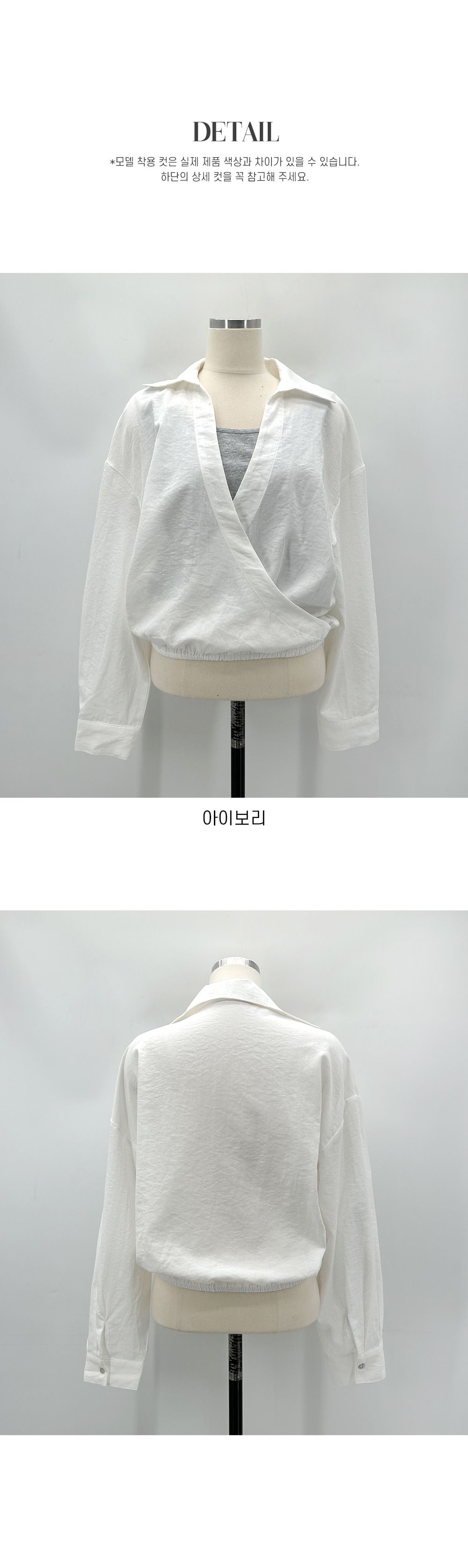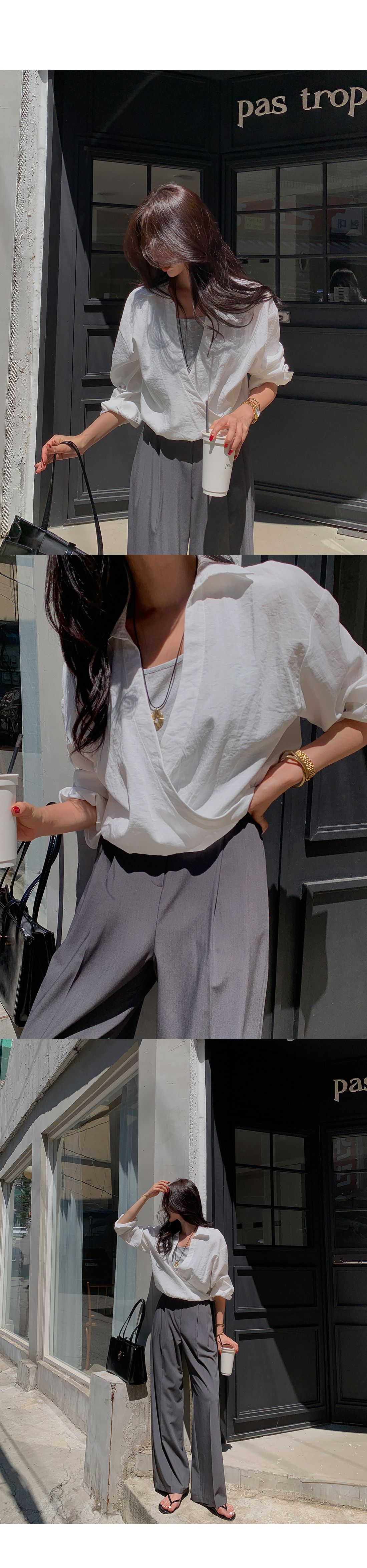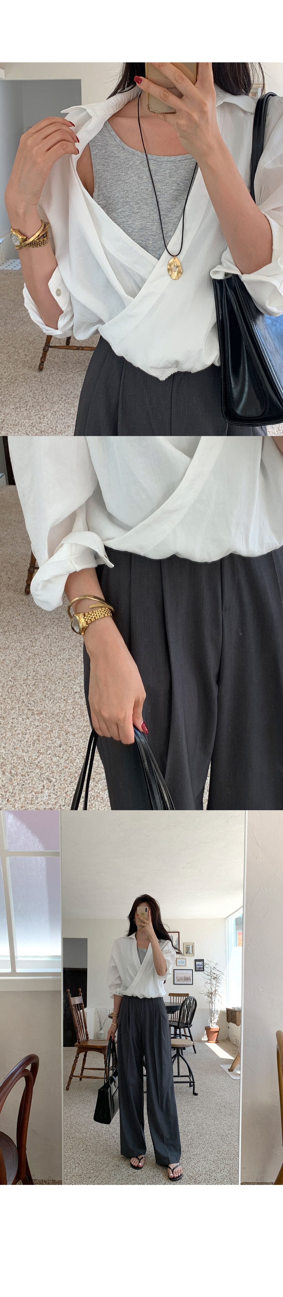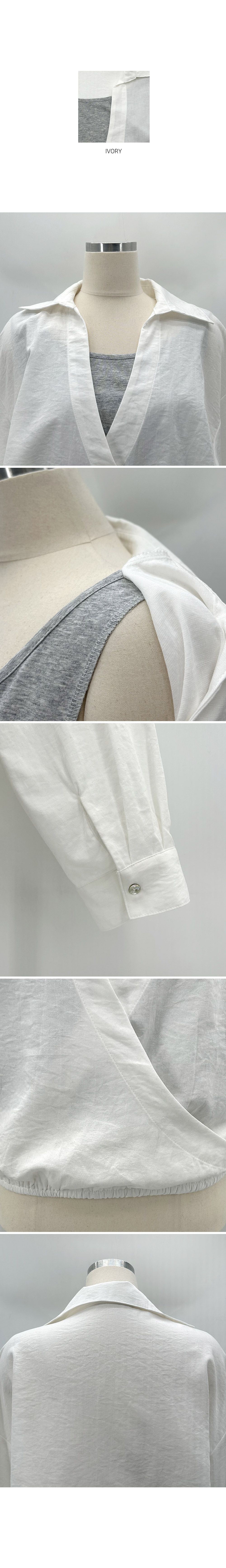 【C55303】韓國TMO 假兩件交叉襯衫-素面拼接U領鬆緊收腰長袖上衣★★