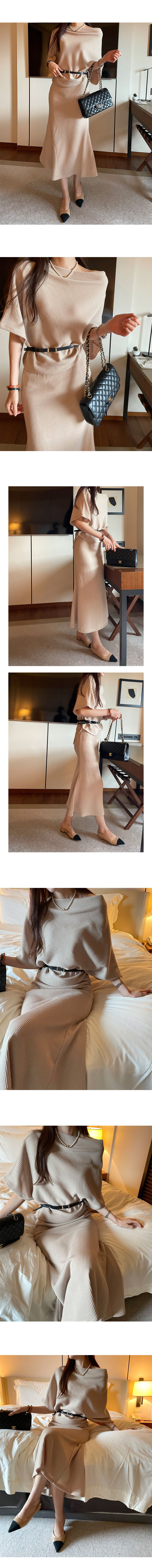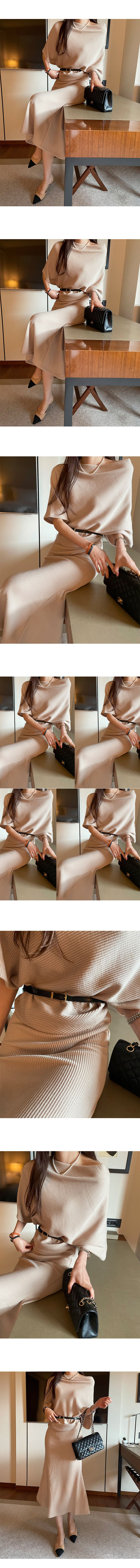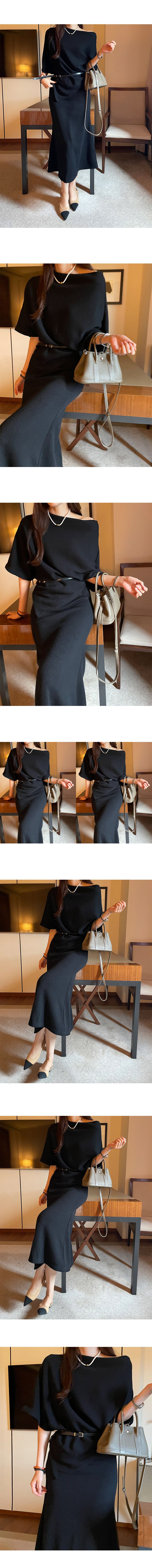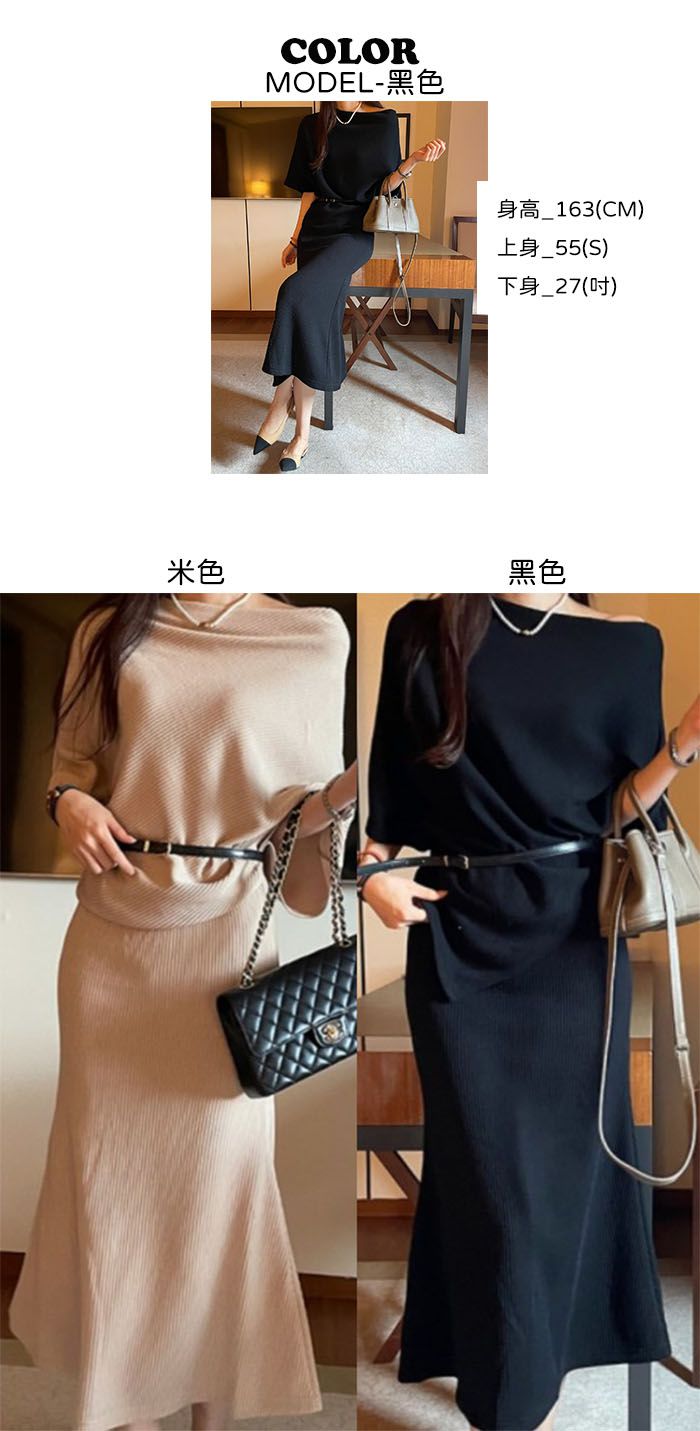 【C55316】韓國MNR 不對稱針織套裝-一字領連肩五分袖上衣+素面長裙