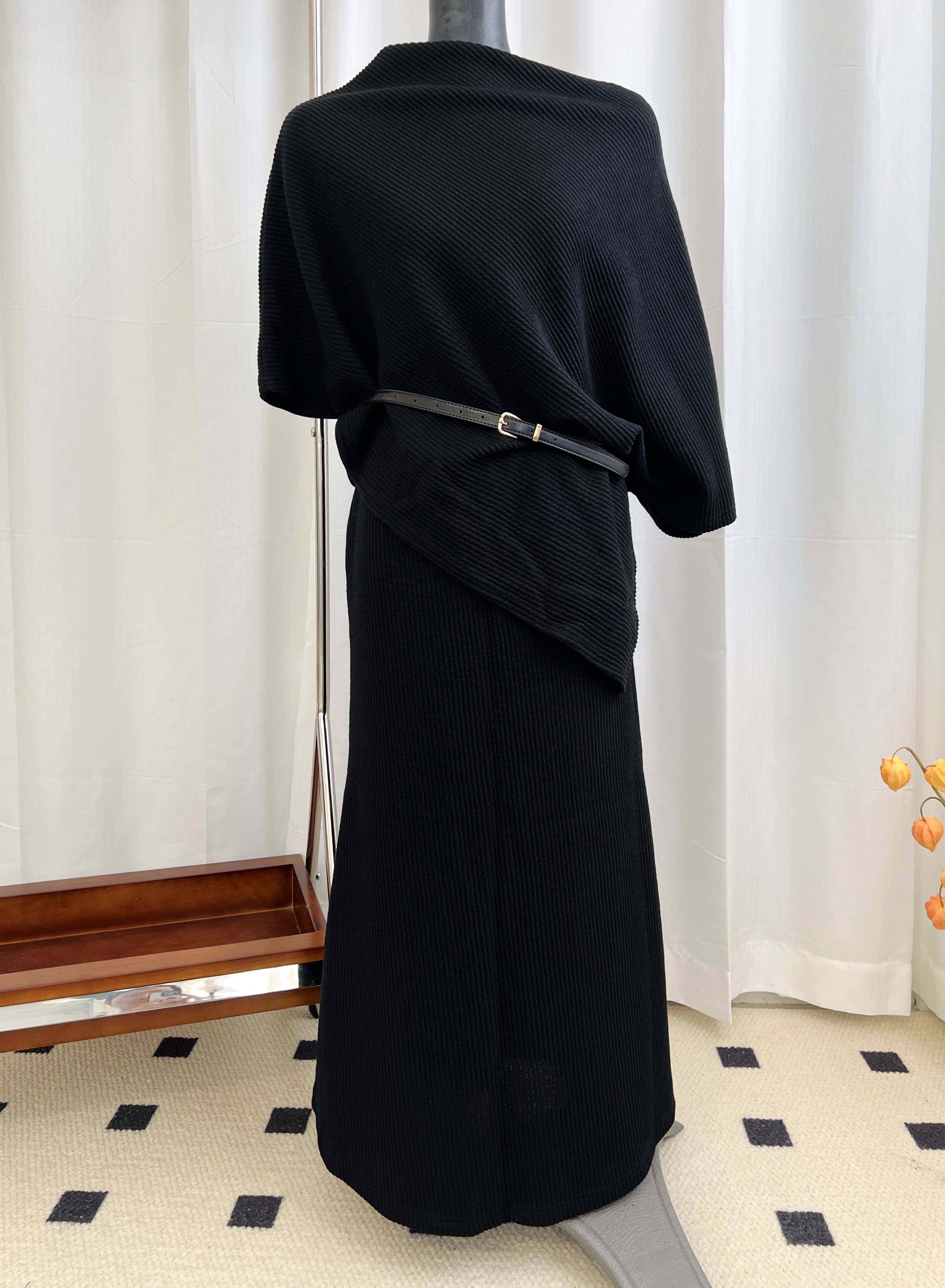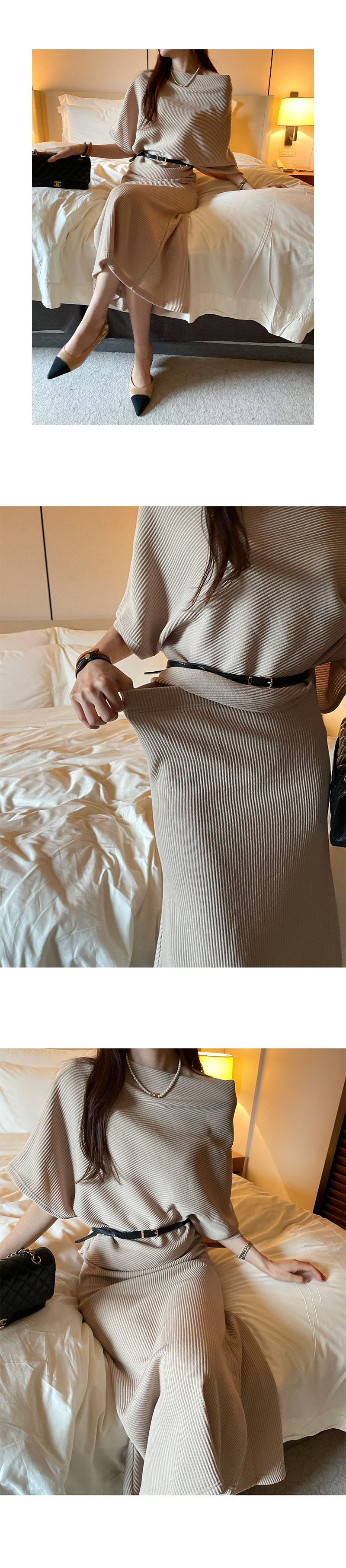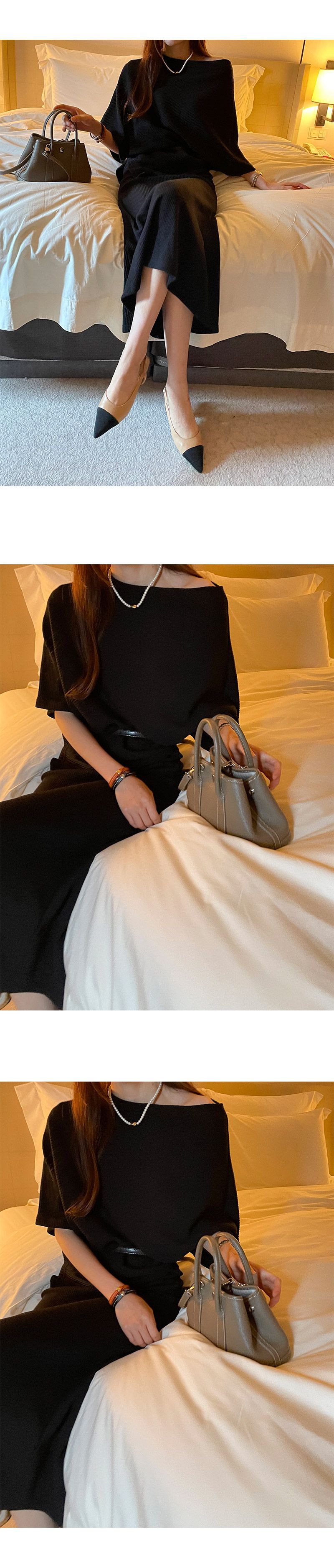 【C55316】韓國MNR 不對稱針織套裝-一字領連肩五分袖上衣+素面長裙
