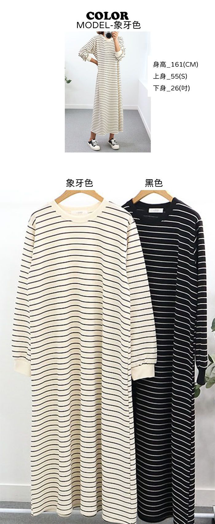 【C55320】韓國MIS 抗皺條紋洋裝-滾邊圓領休閒傘狀長袖連身裙★★