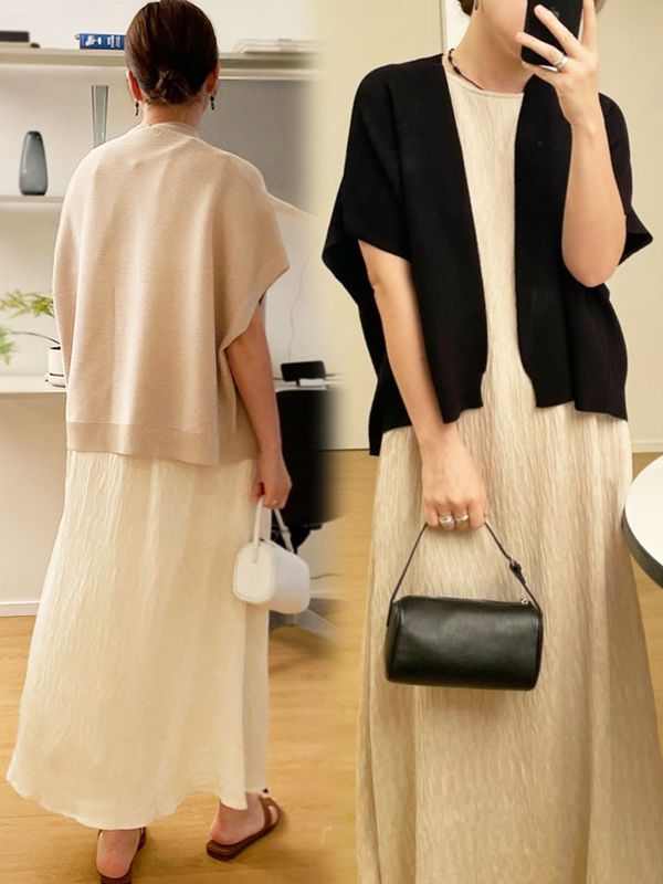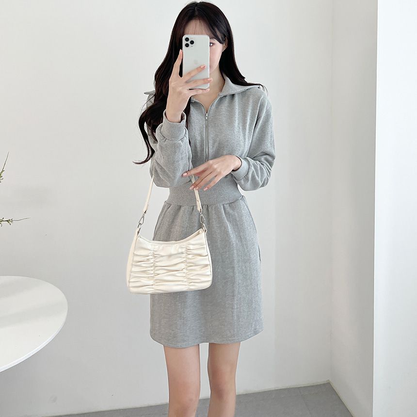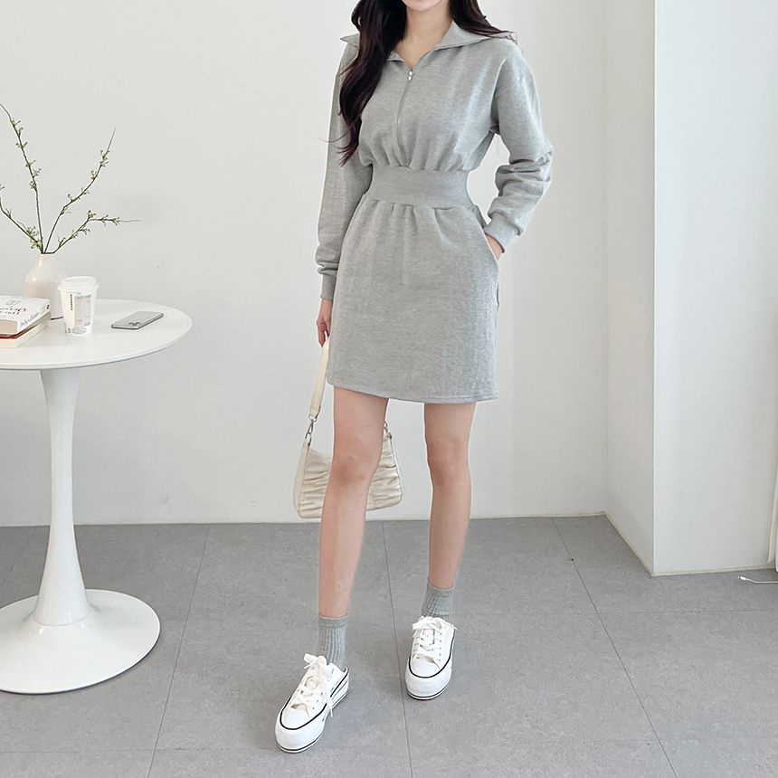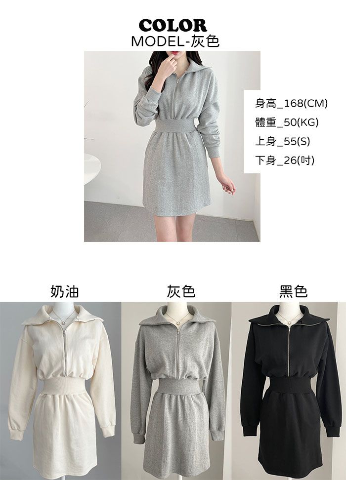 半開襟拉鍊領/V領/翻領/寬版鬆緊收腰/雙口袋 - 休閒居家簡約百搭素面一件式洋裝拉鍊翻領短洋裝收腰洋裝長袖洋裝窄裙洋裝奶油色灰色黑色