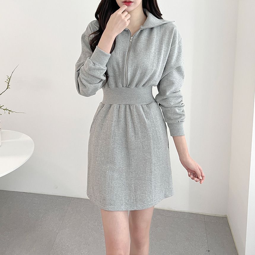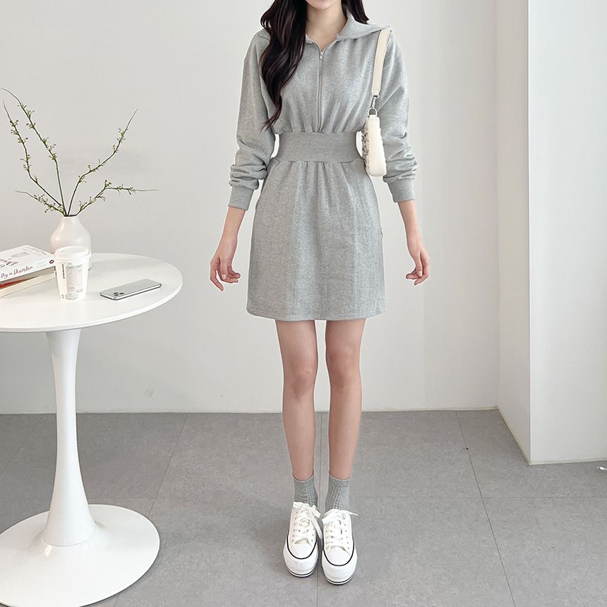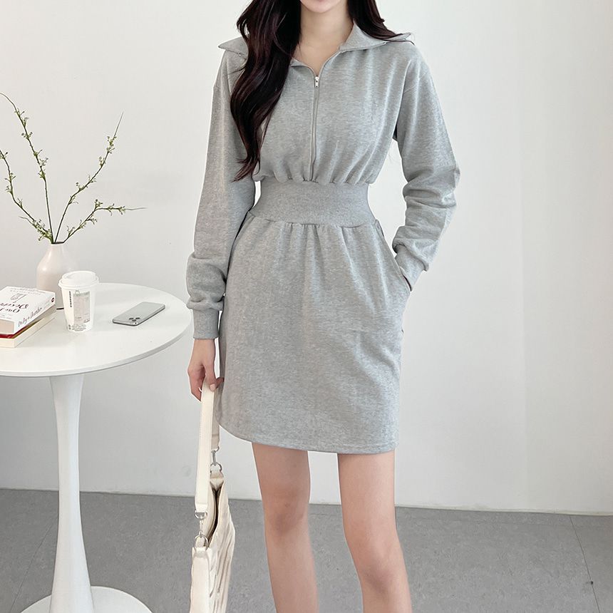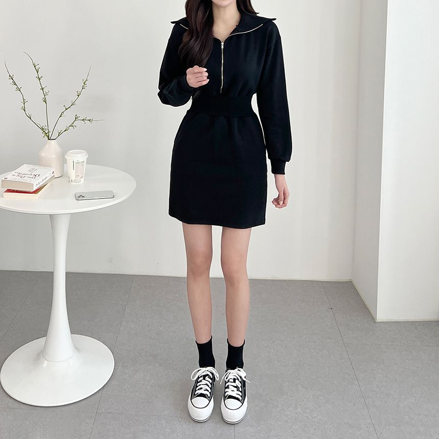 【C55321】韓國CLA 拉鍊翻領短洋裝-素面半開襟V領收腰長袖窄裙★★