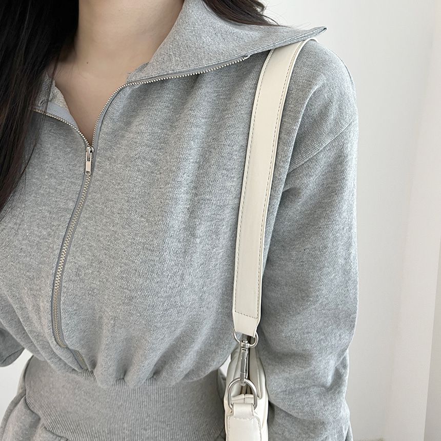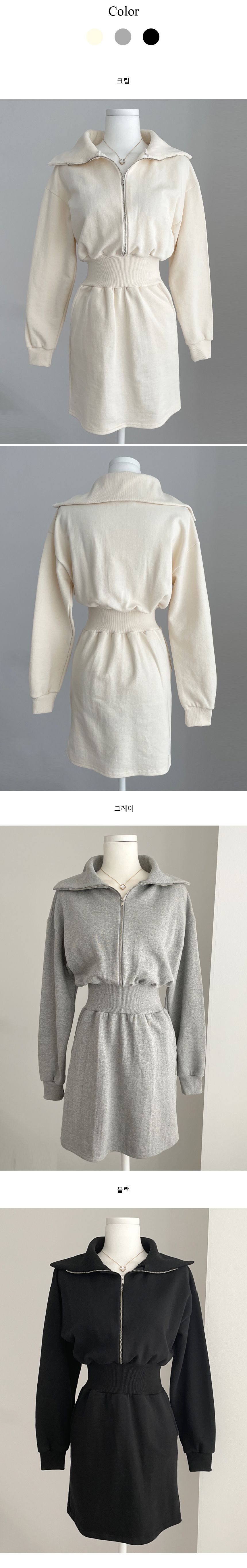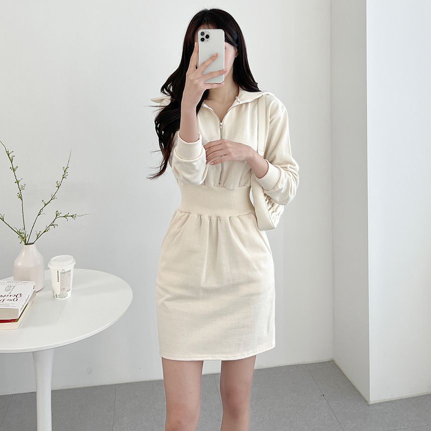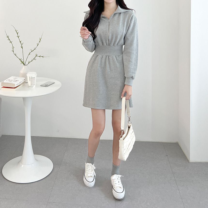 【C55321】韓國CLA 拉鍊翻領短洋裝-素面半開襟V領收腰長袖窄裙★★