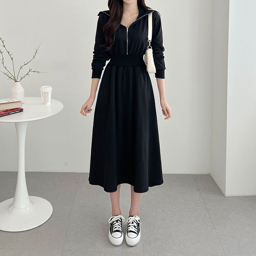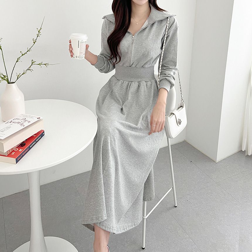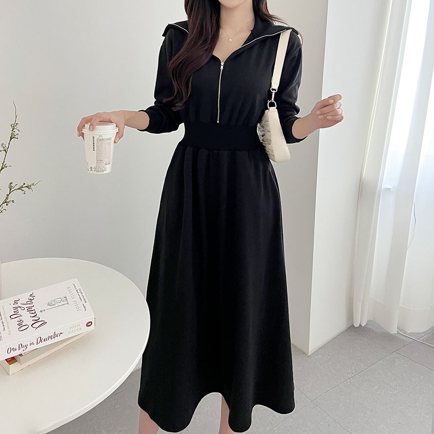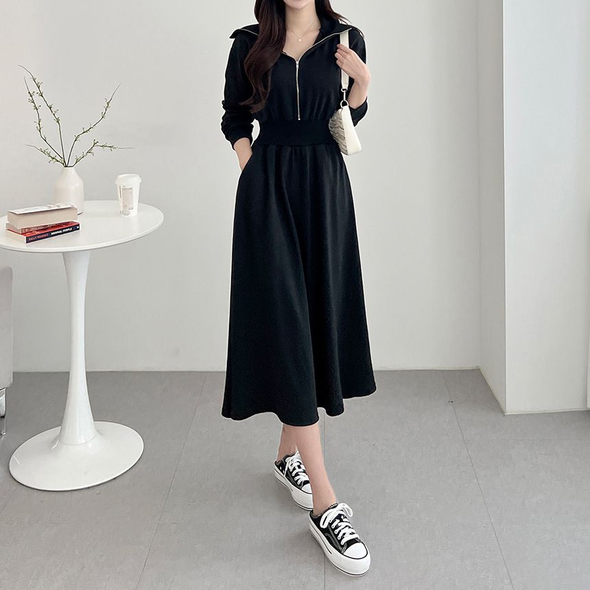 【C55323】韓國CLA 拉鍊翻領長洋裝-素面半開襟V領收腰長袖連身傘裙