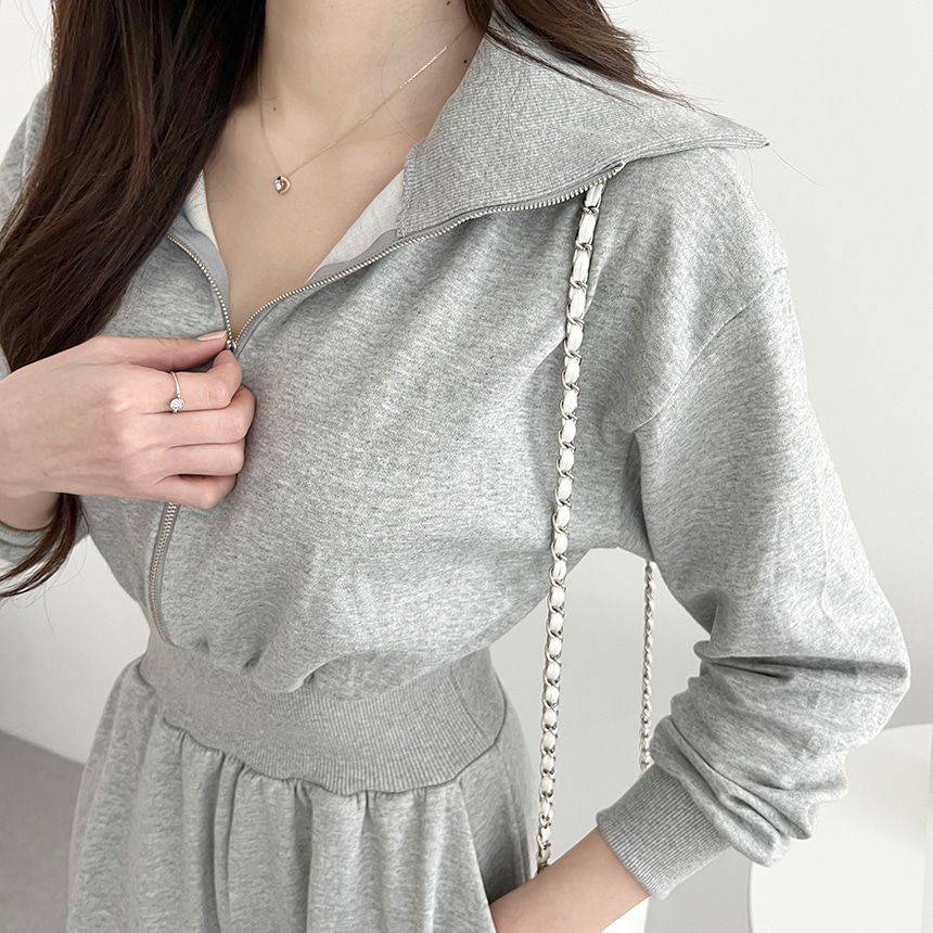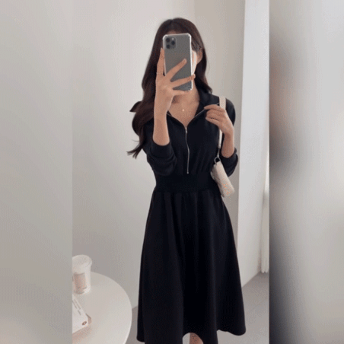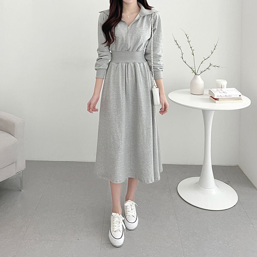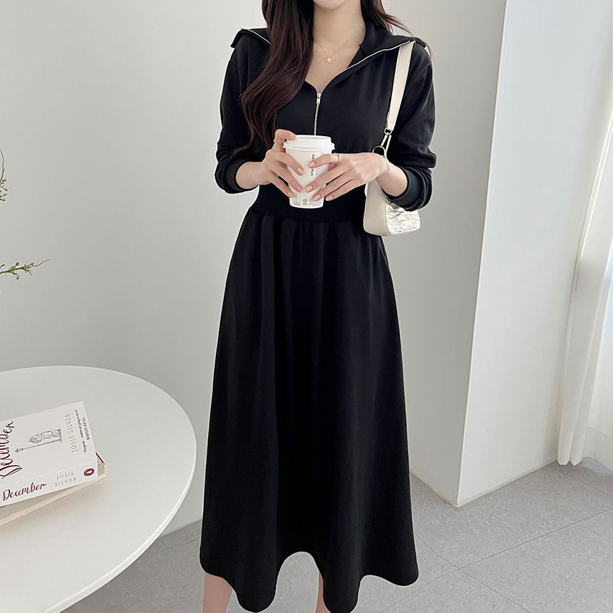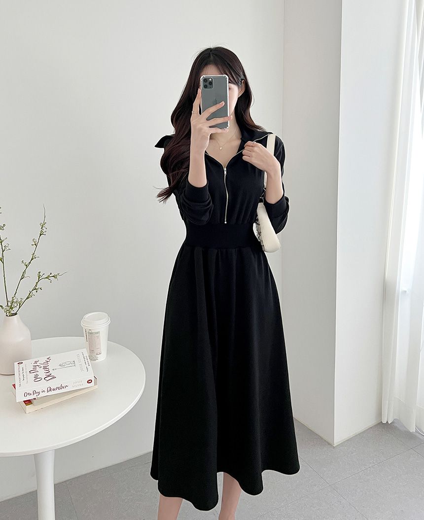 【C55323】韓國CLA 拉鍊翻領長洋裝-素面半開襟V領收腰長袖連身傘裙