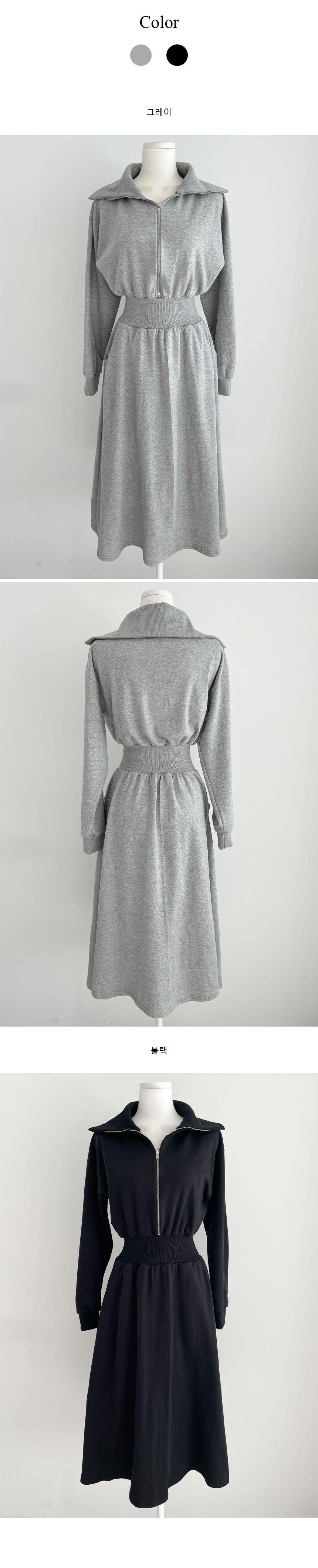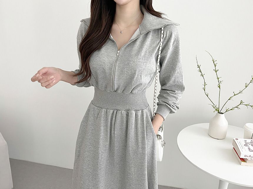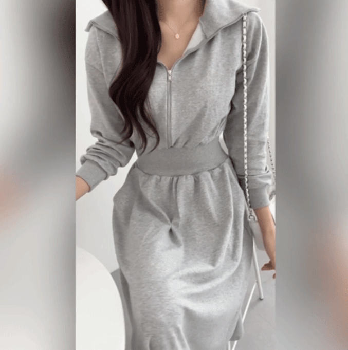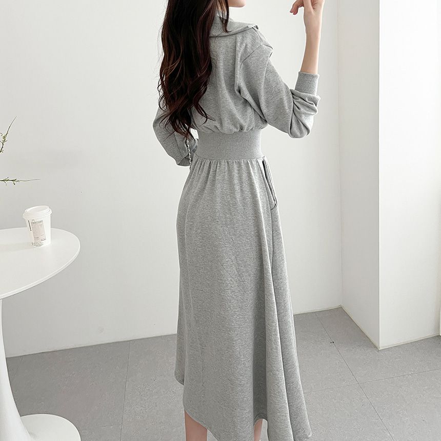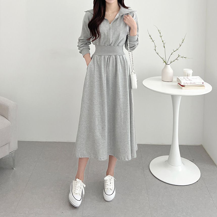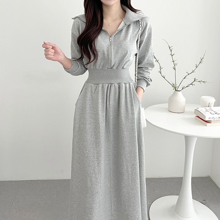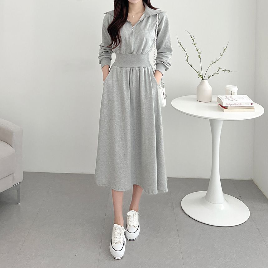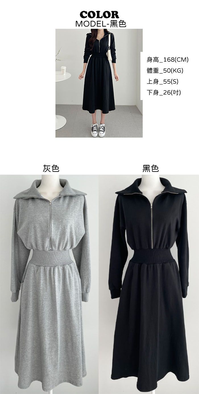 半開襟拉鍊領/V領/翻領/寬版鬆緊收腰/雙口袋 - 休閒居家簡約百搭素面一件式洋裝拉鍊翻領長洋裝收腰洋裝長袖洋裝傘裙洋裝灰色黑色