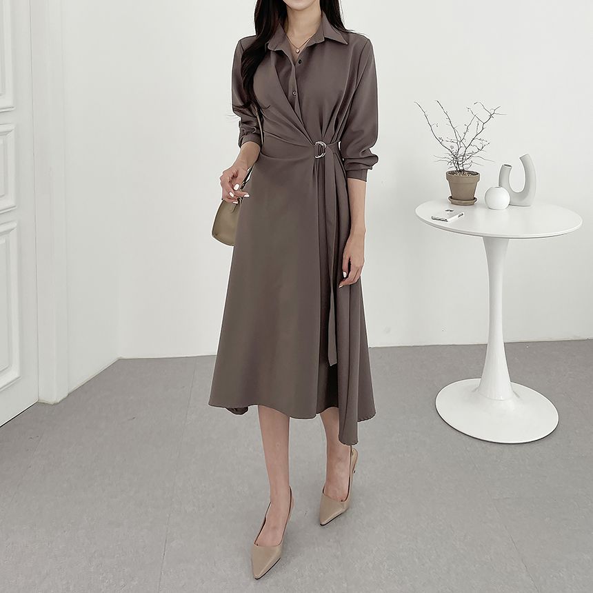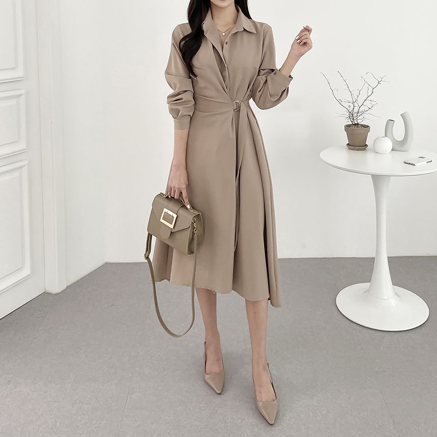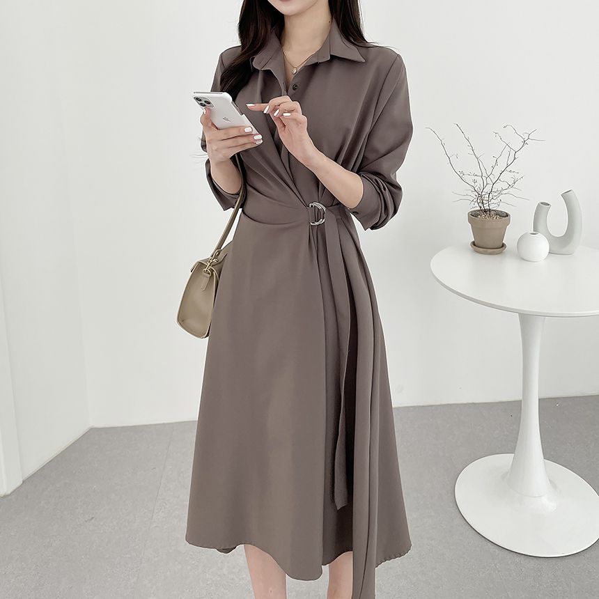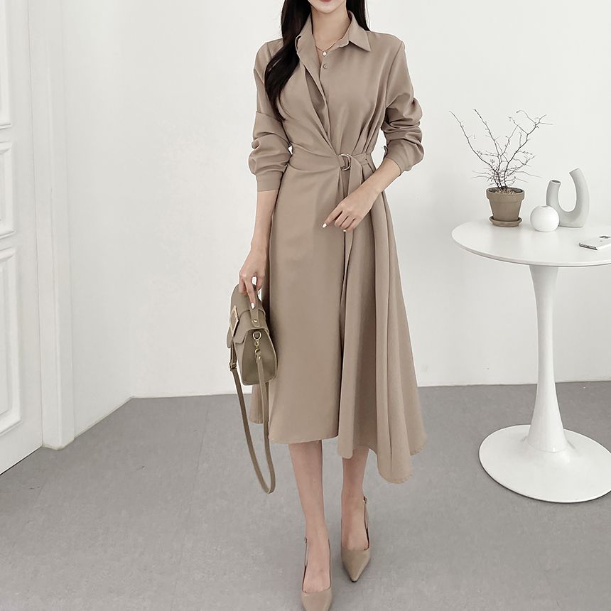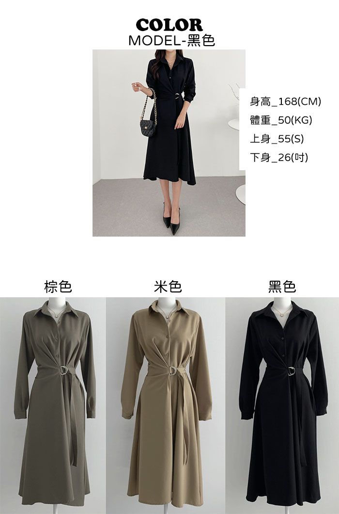 半開襟排釦/斜邊不對稱/紐結腰/抽繩收腰/無口袋 - 休閒婚禮OL上班族簡約百搭素面綁繩收腰洋裝長袖襯衫洋裝一件式洋裝連身裙棕色米色黑色
