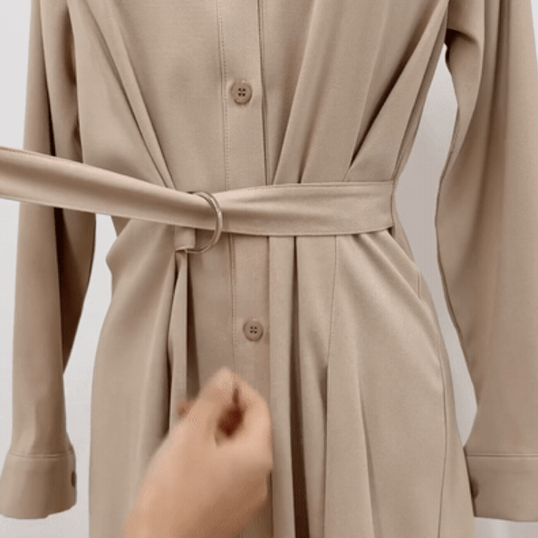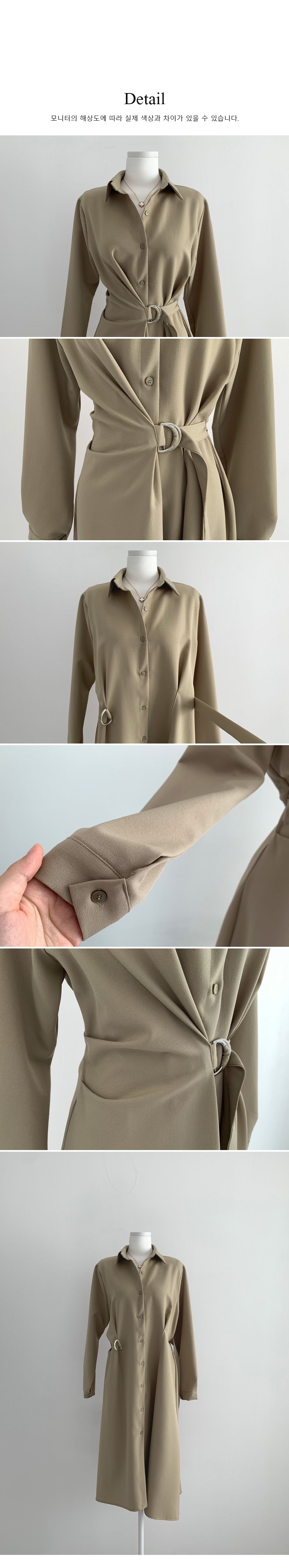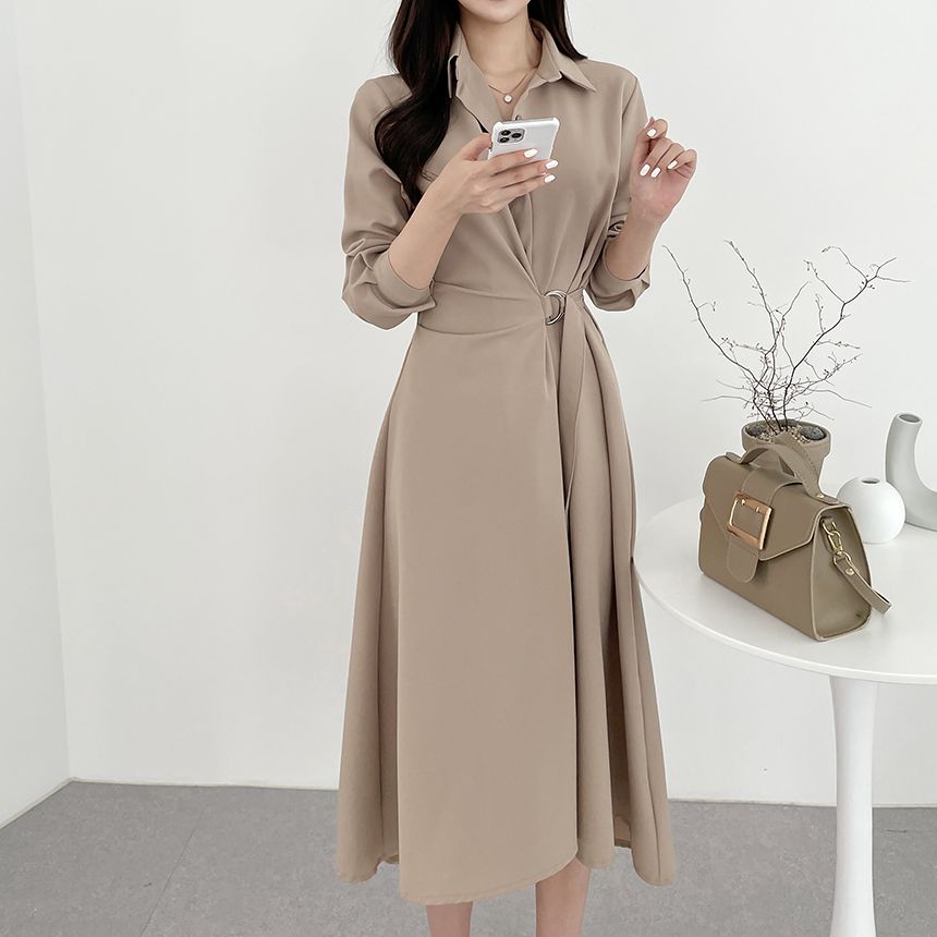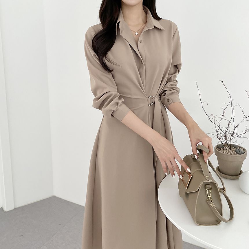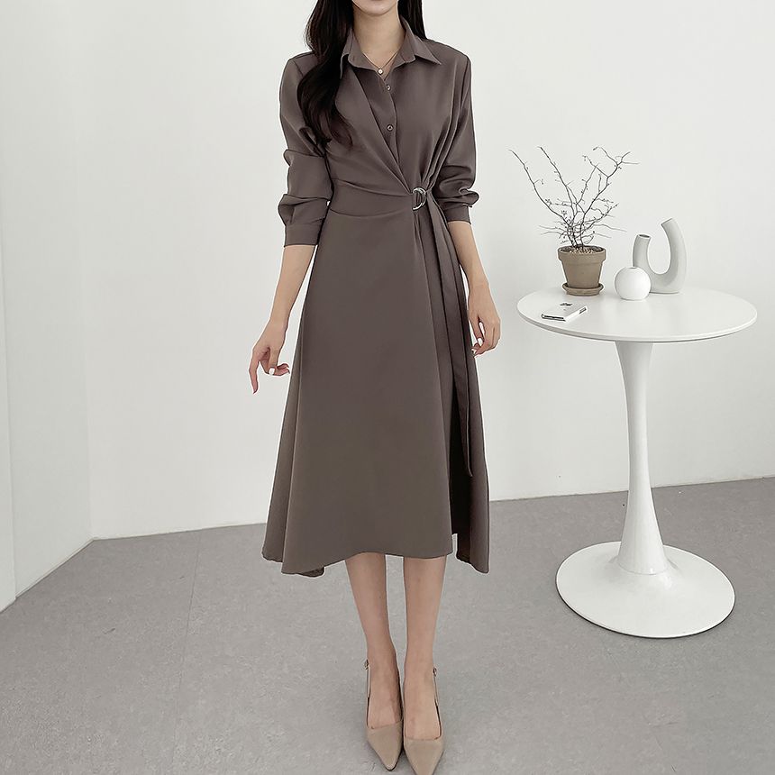 半開襟排釦/斜邊不對稱/紐結腰/抽繩收腰/無口袋 - 休閒婚禮OL上班族簡約百搭素面綁繩收腰洋裝長袖襯衫洋裝一件式洋裝連身裙棕色米色黑色