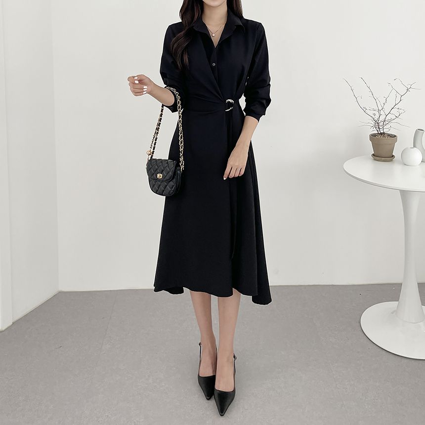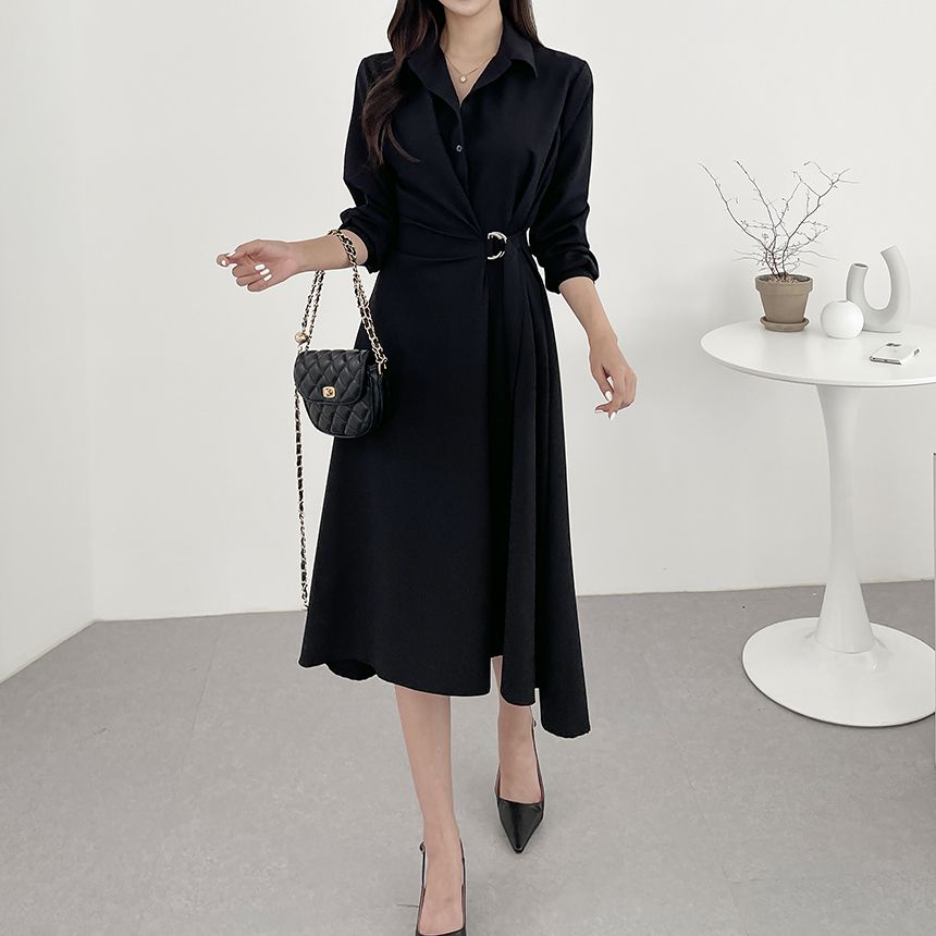 【C55331】韓國CLA 綁繩收腰洋裝-素面半開襟不對稱長袖襯衫連身裙
