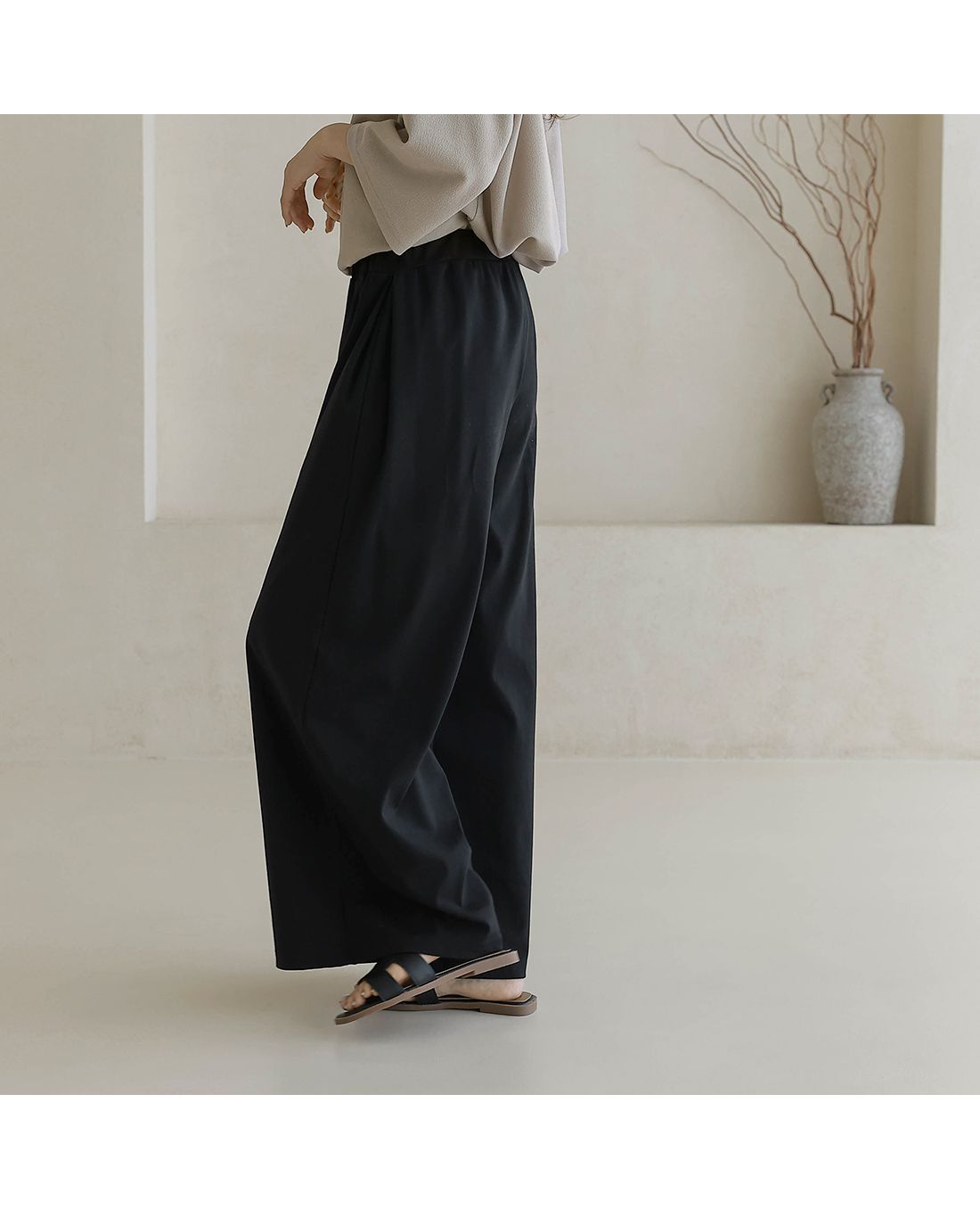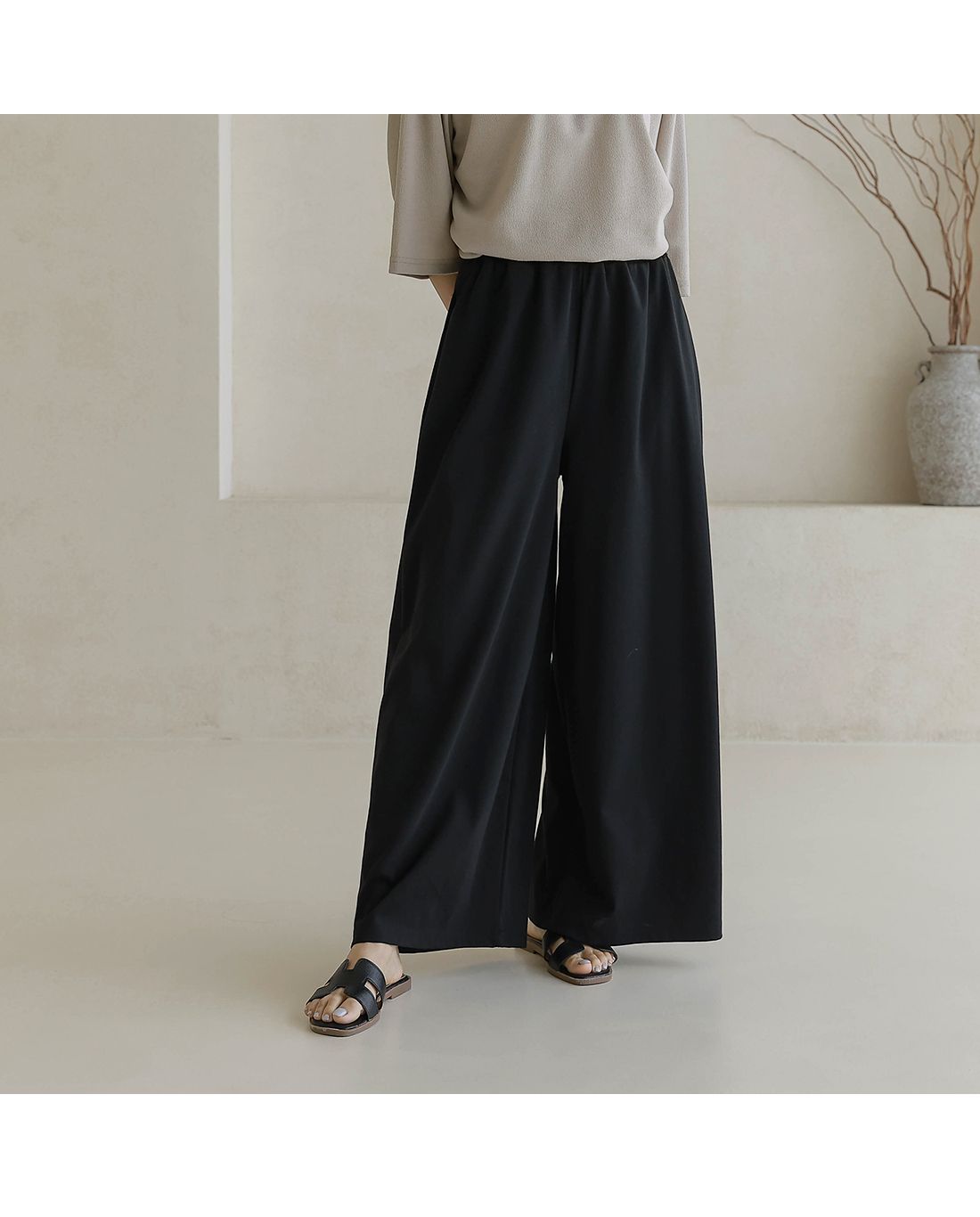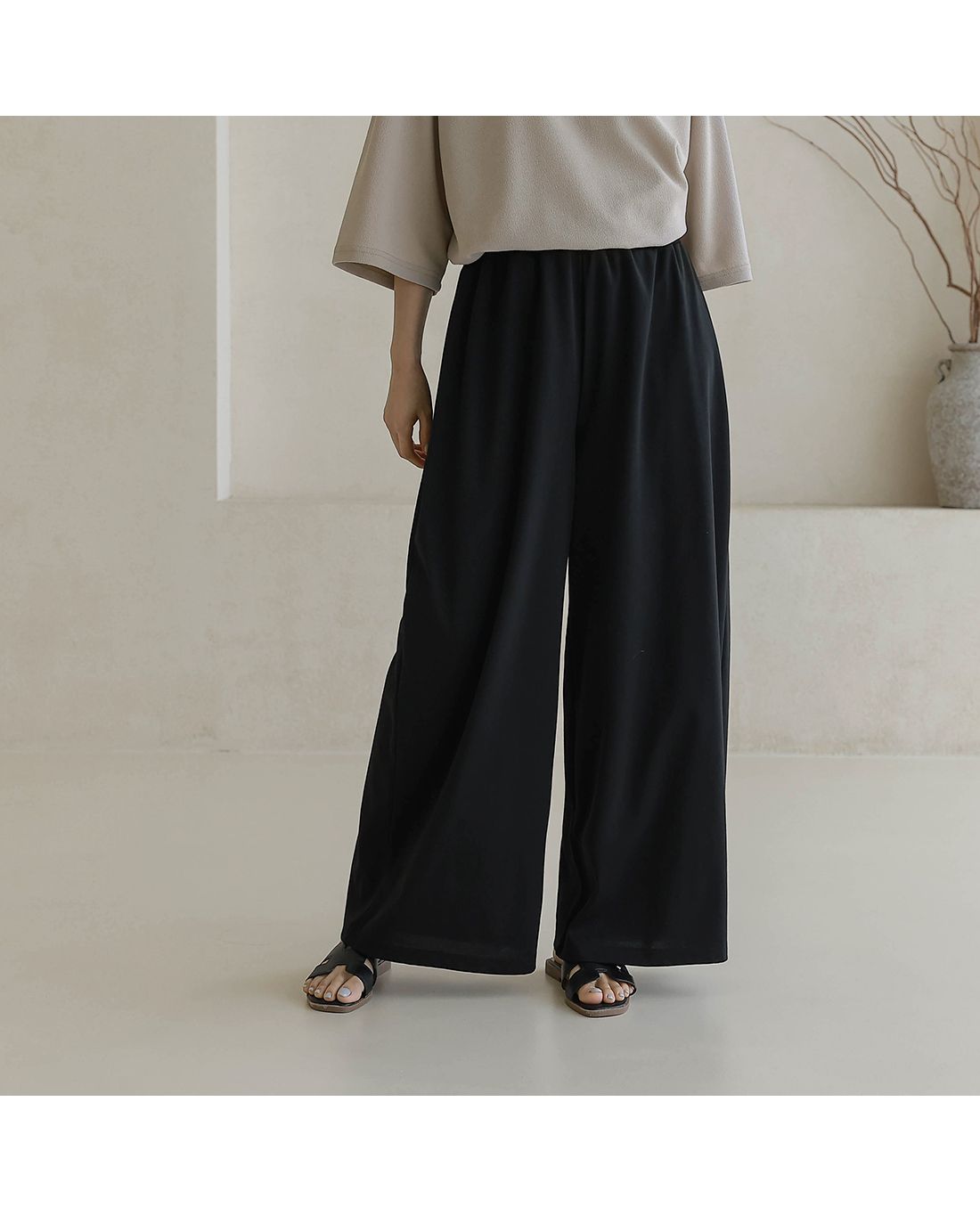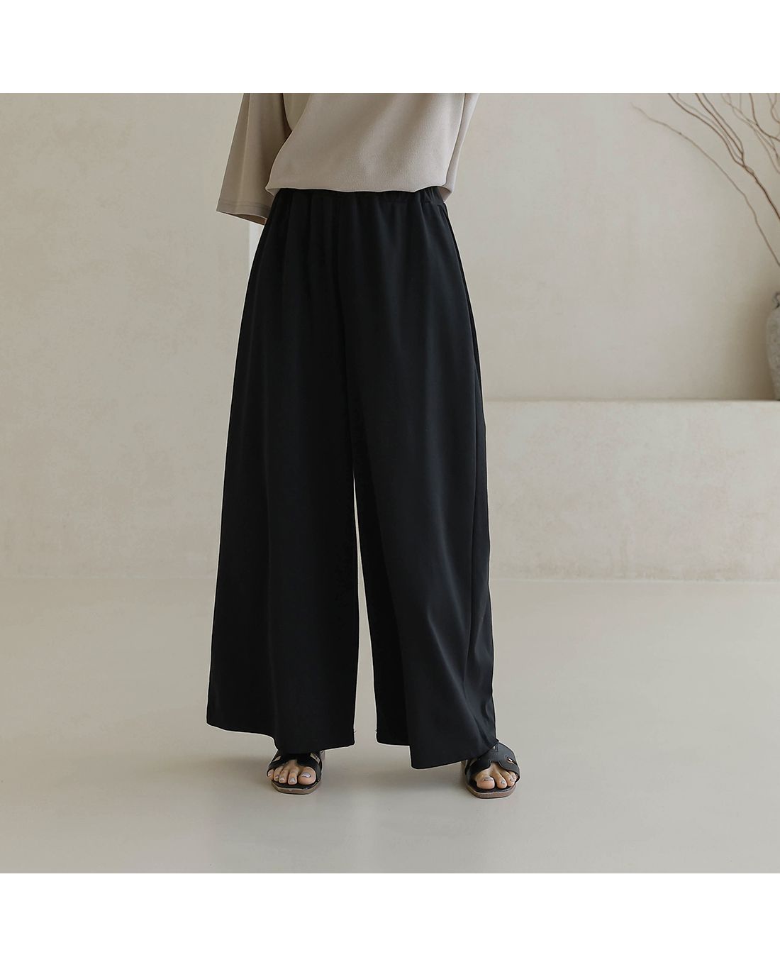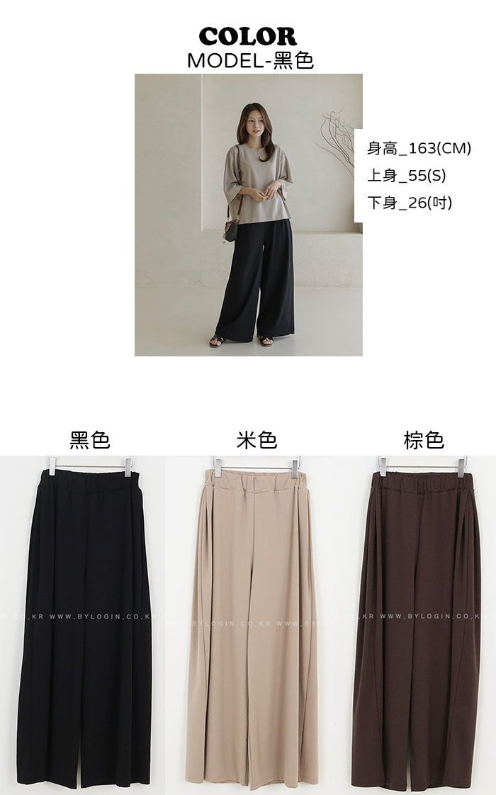 【C55335】韓國BLG 鬆緊腰寬褲-素面寬鬆雙口袋全腰鬆緊闊腿長褲