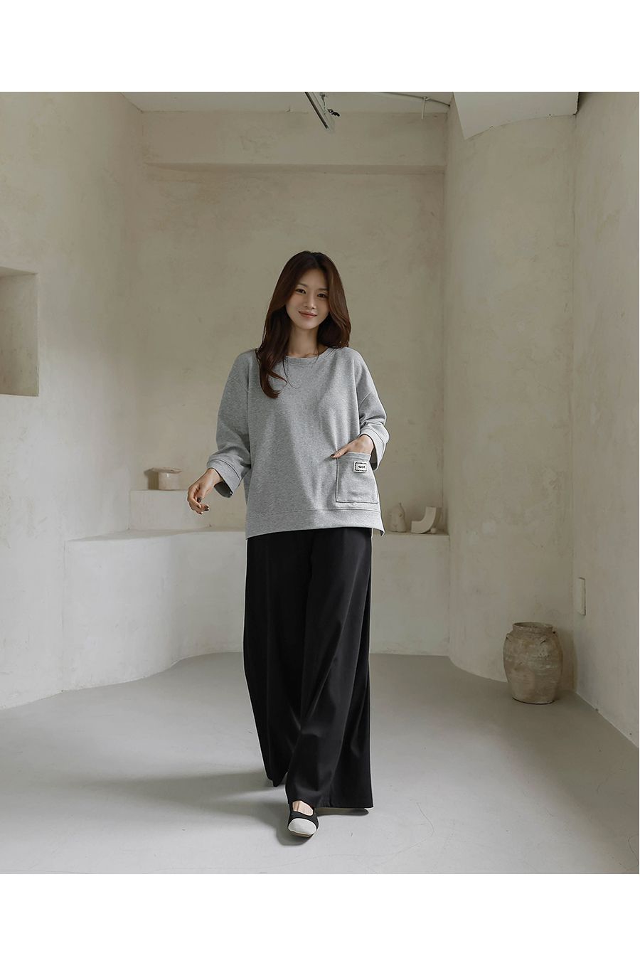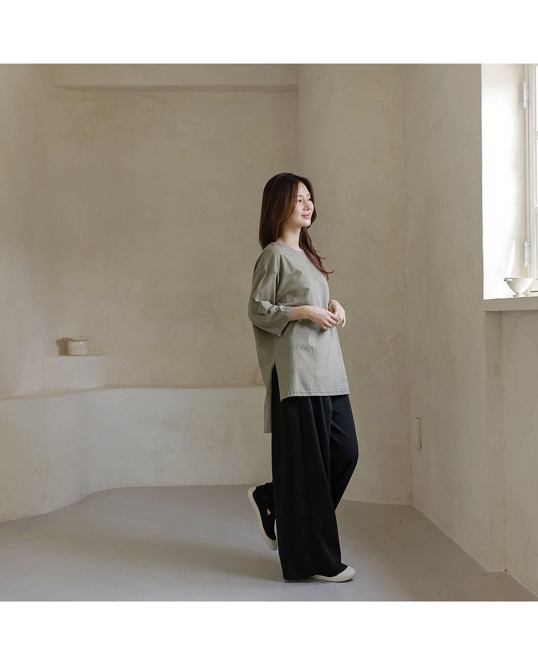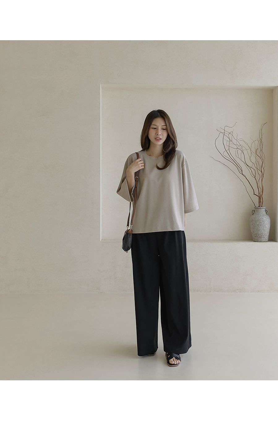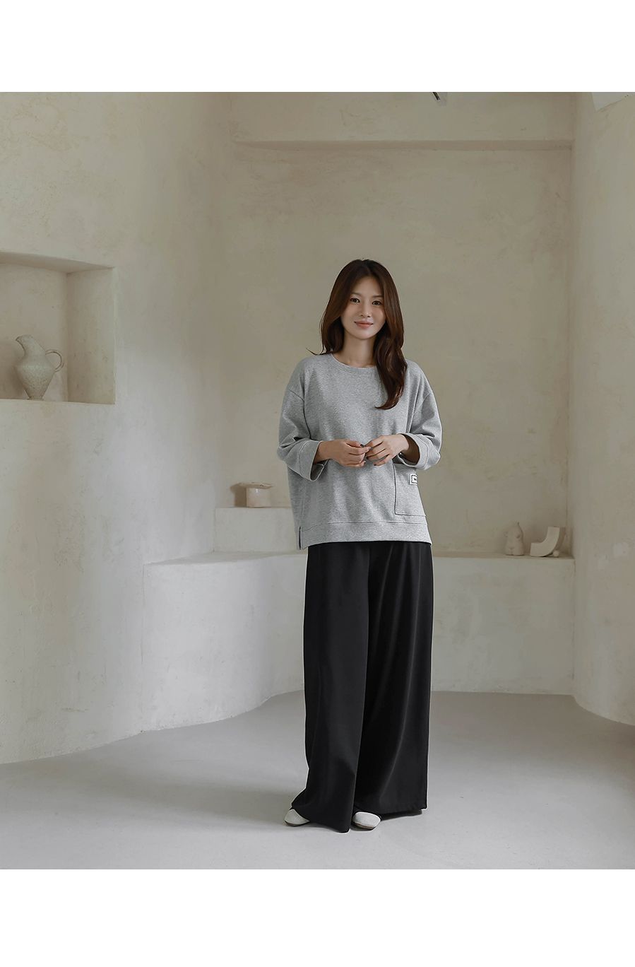【C55335】韓國BLG 鬆緊腰寬褲-素面寬鬆雙口袋全腰鬆緊闊腿長褲