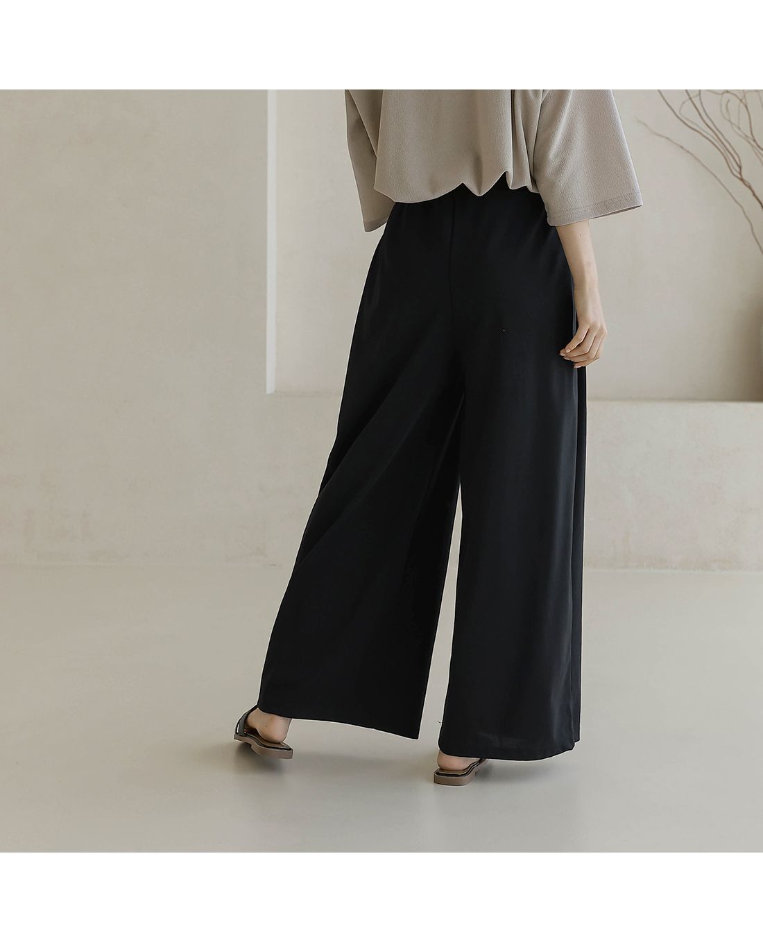 兩種尺寸/雙口袋/全腰鬆緊/寬褲管 - 休閒居家簡約百搭素面鬆緊腰寬褲闊腿褲長褲多尺寸12黑色米色棕色