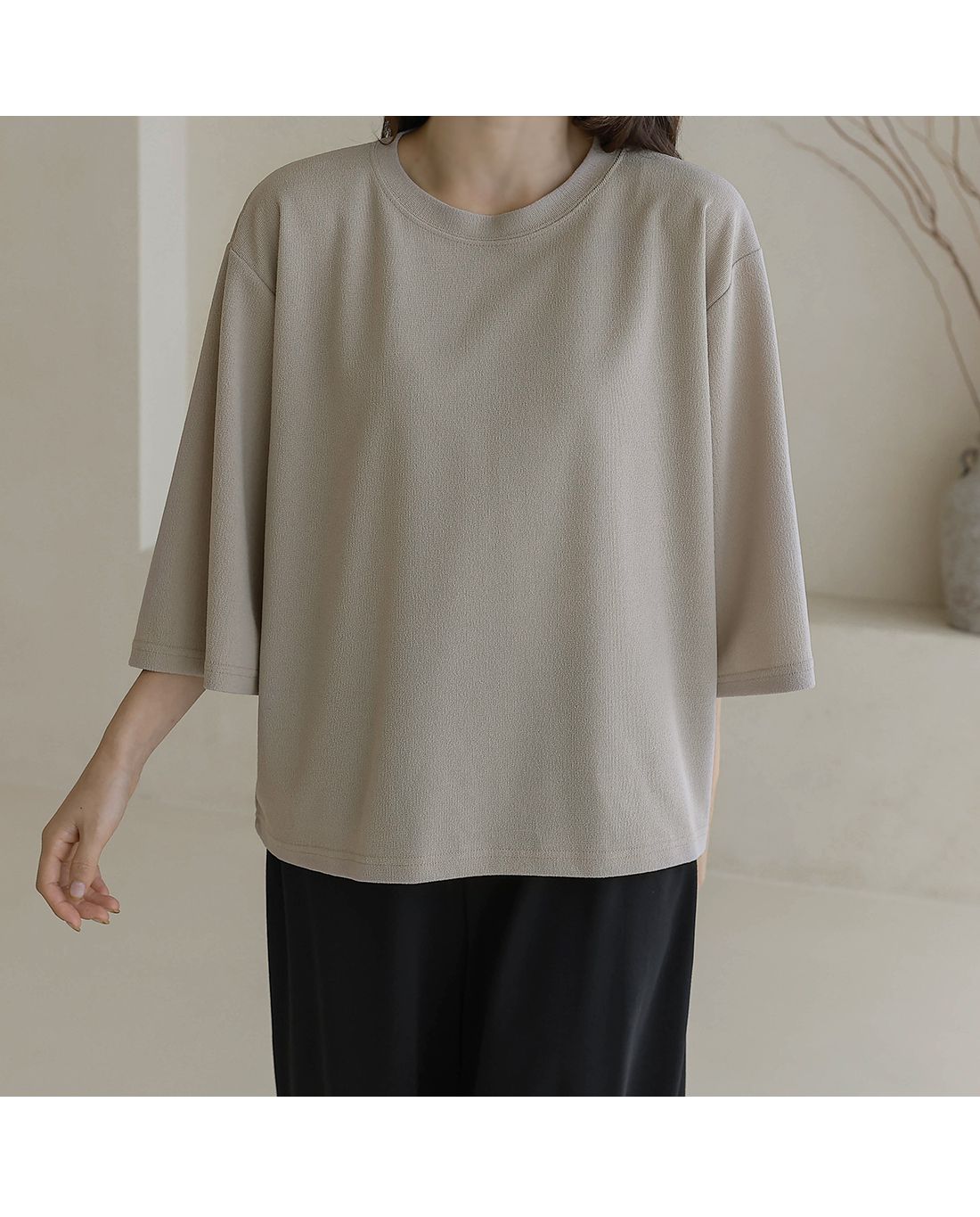基礎款日常穿搭/不易皺快速出門/寬鬆版型不挑身形-休閒居家簡約百搭皺皺紋寬袖素面圓領落肩寬鬆七分袖上衣T恤米色棕色白色黑色