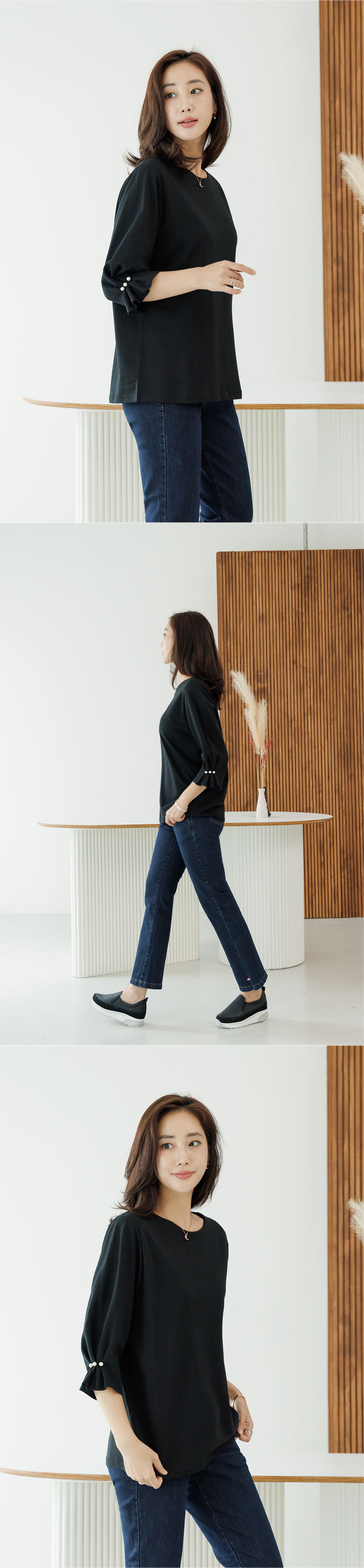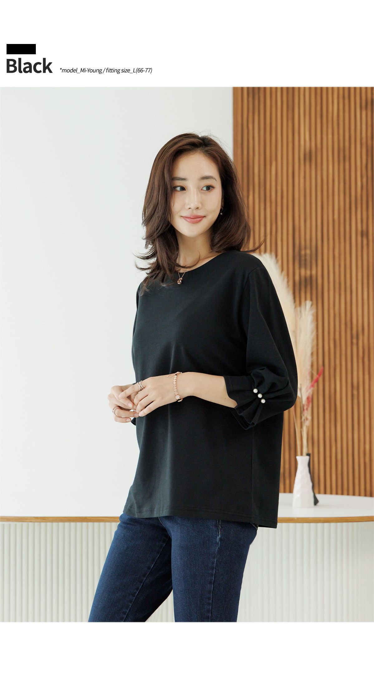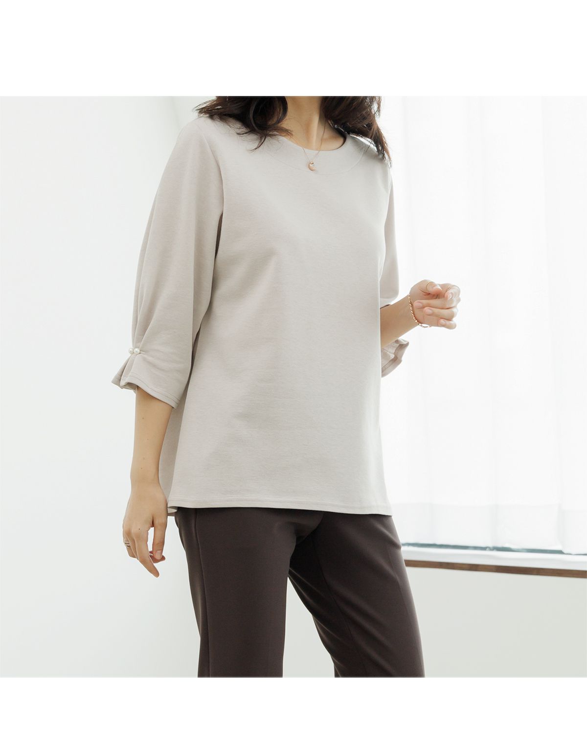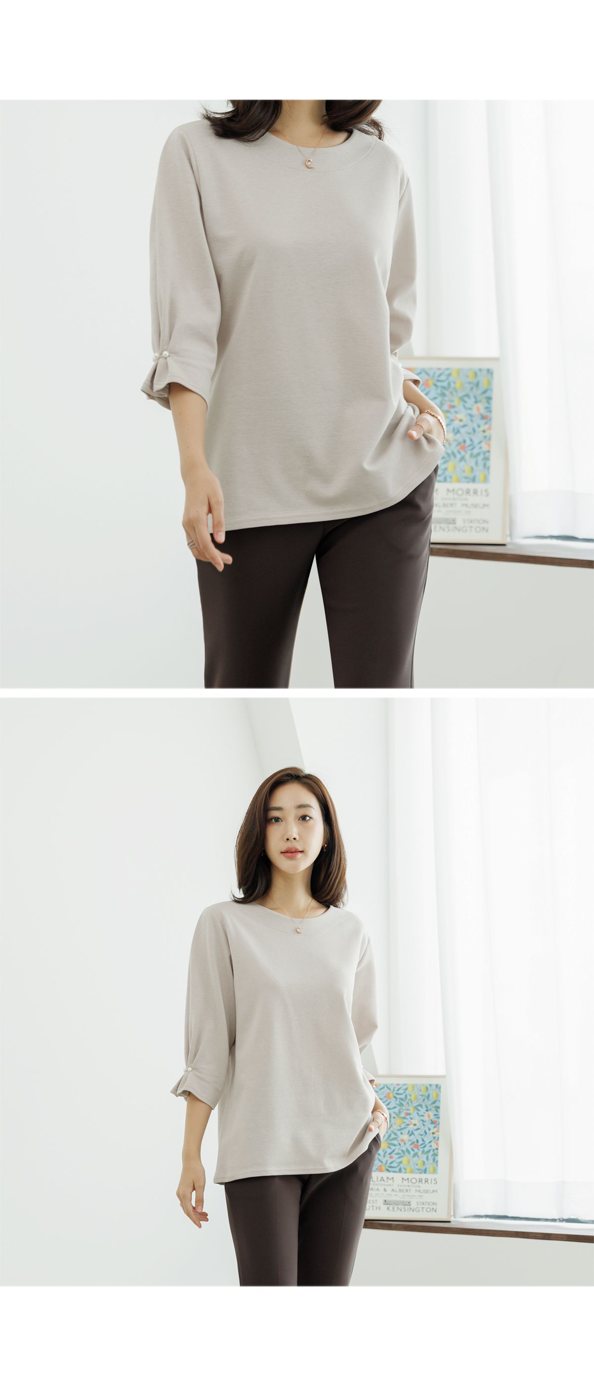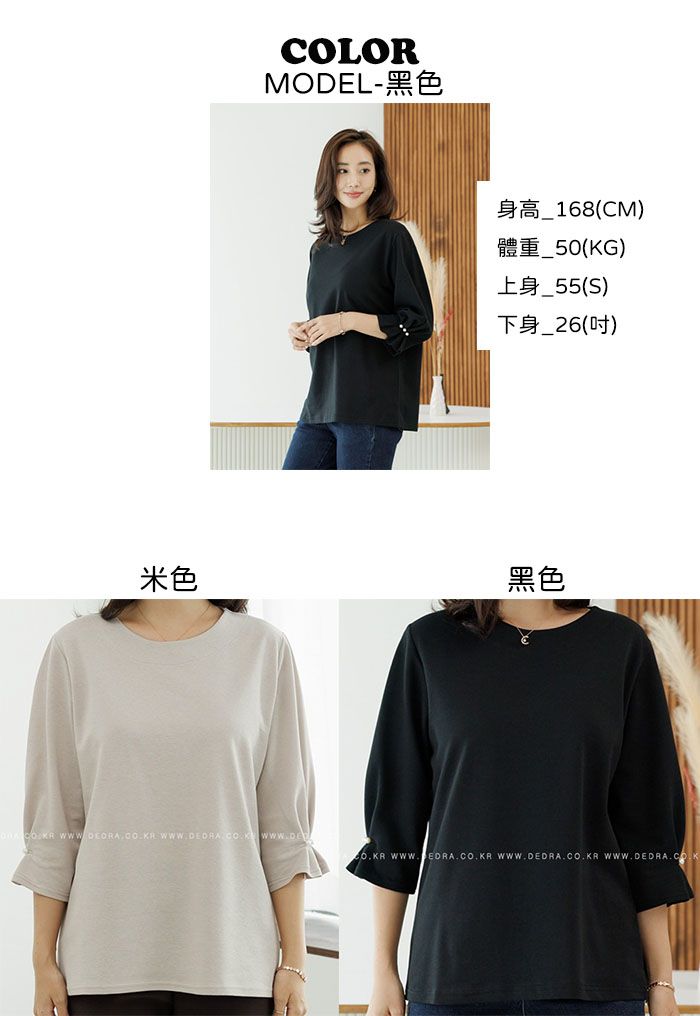 珍珠造型手袖添增質感/獨特不撞衫/寬鬆版型不挑身形-休閒居家簡約百搭車縫珍珠長版寬鬆素面壓褶袖口圓領七分袖上衣T恤米色黑色