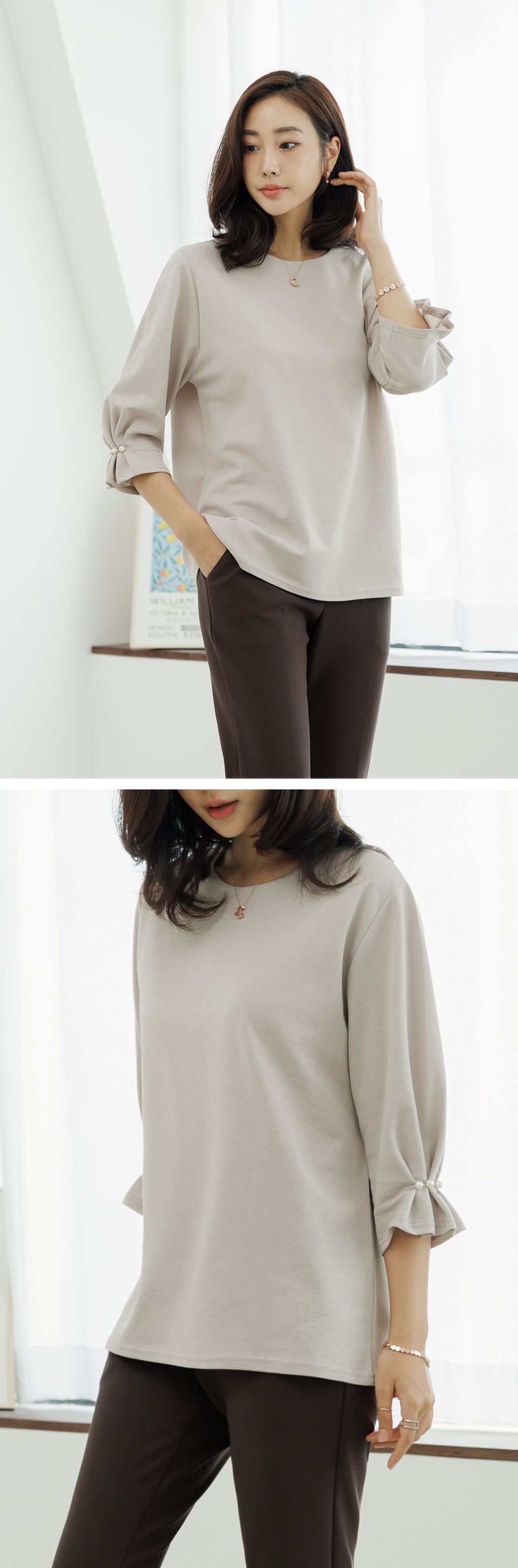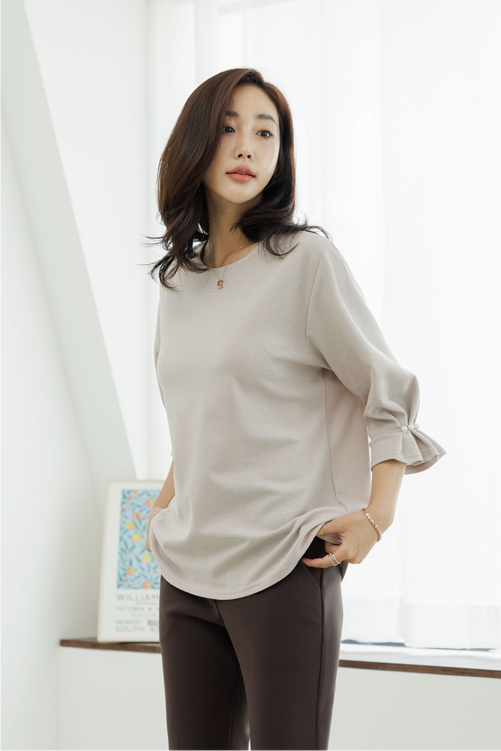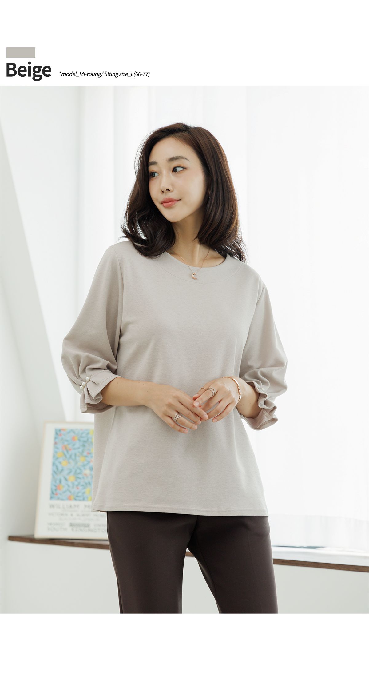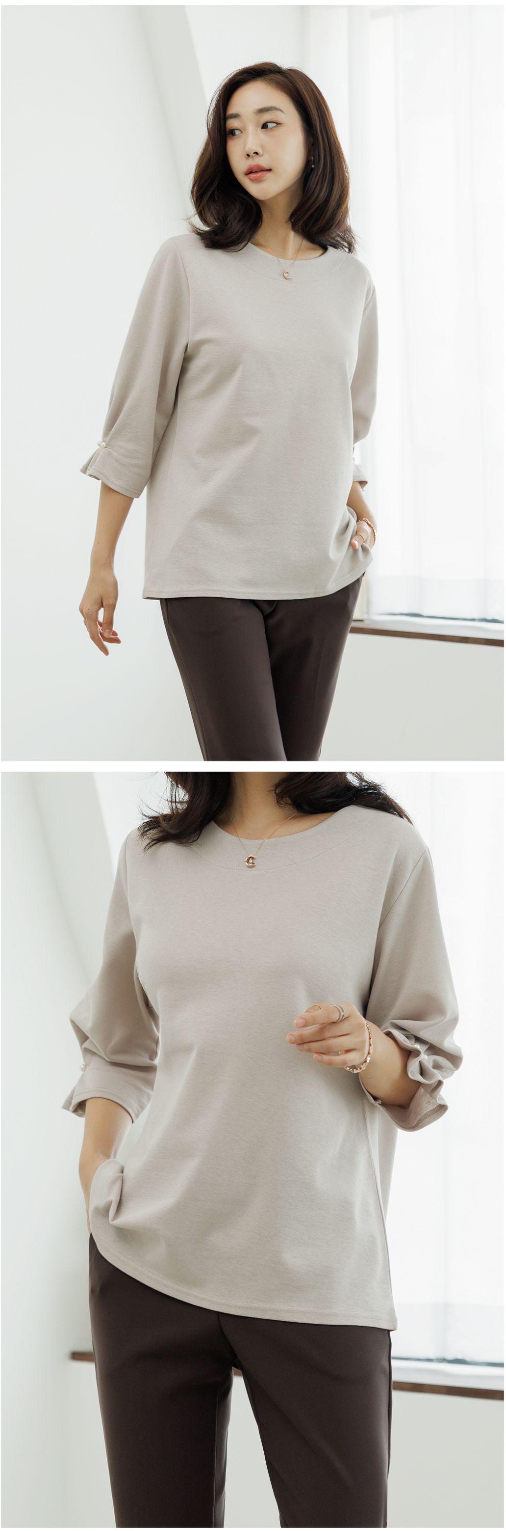 珍珠造型手袖添增質感/獨特不撞衫/寬鬆版型不挑身形-休閒居家簡約百搭車縫珍珠長版寬鬆素面壓褶袖口圓領七分袖上衣T恤米色黑色