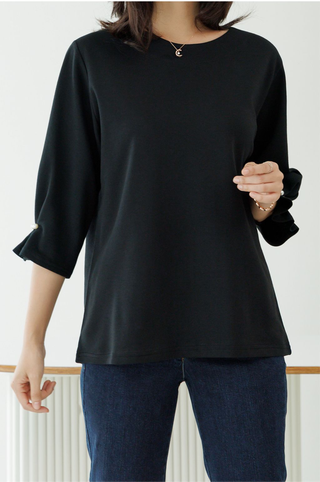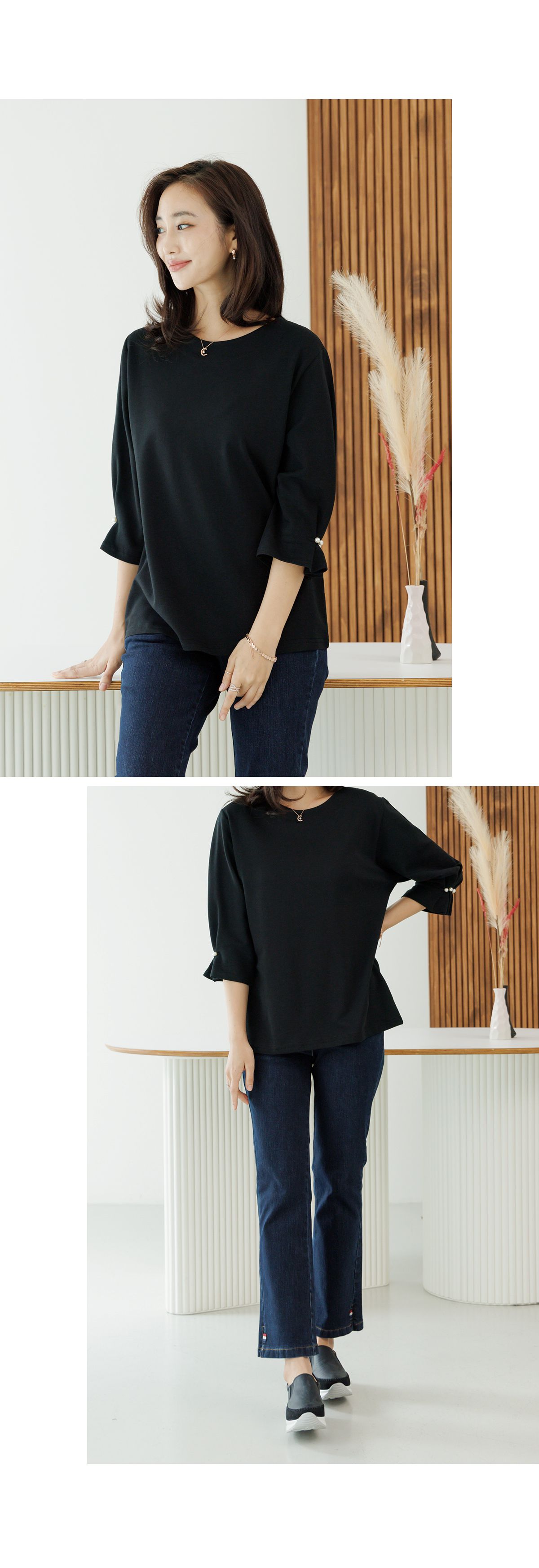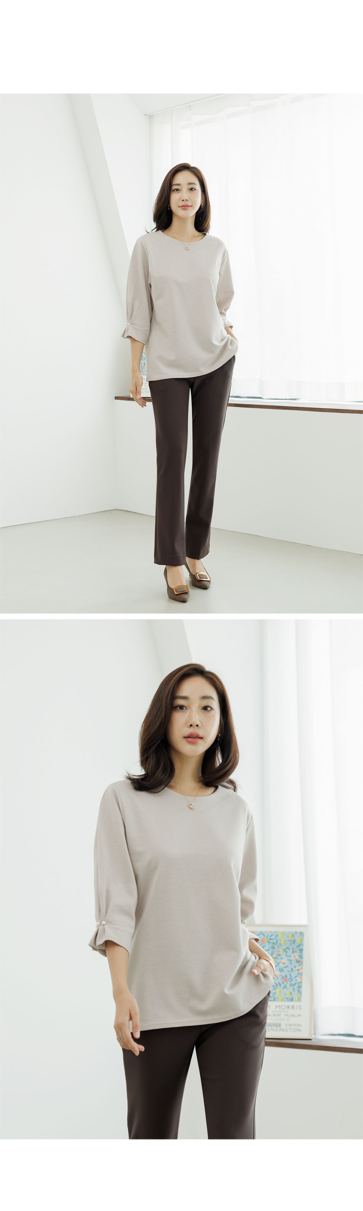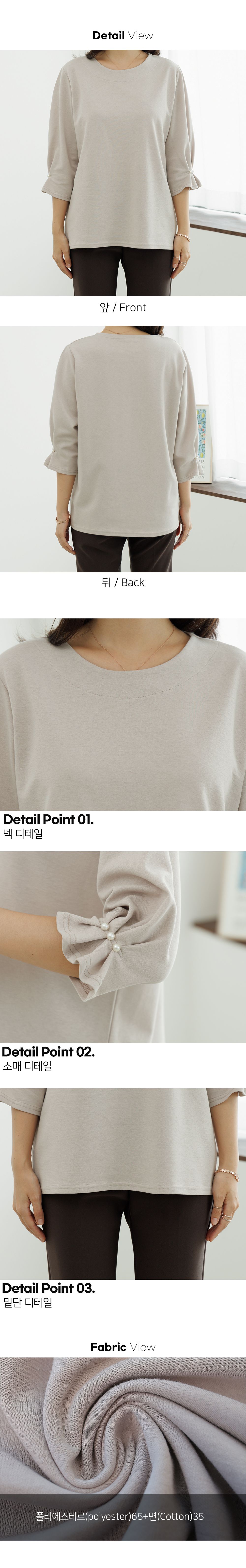 珍珠造型手袖添增質感/獨特不撞衫/寬鬆版型不挑身形-休閒居家簡約百搭車縫珍珠長版寬鬆素面壓褶袖口圓領七分袖上衣T恤米色黑色