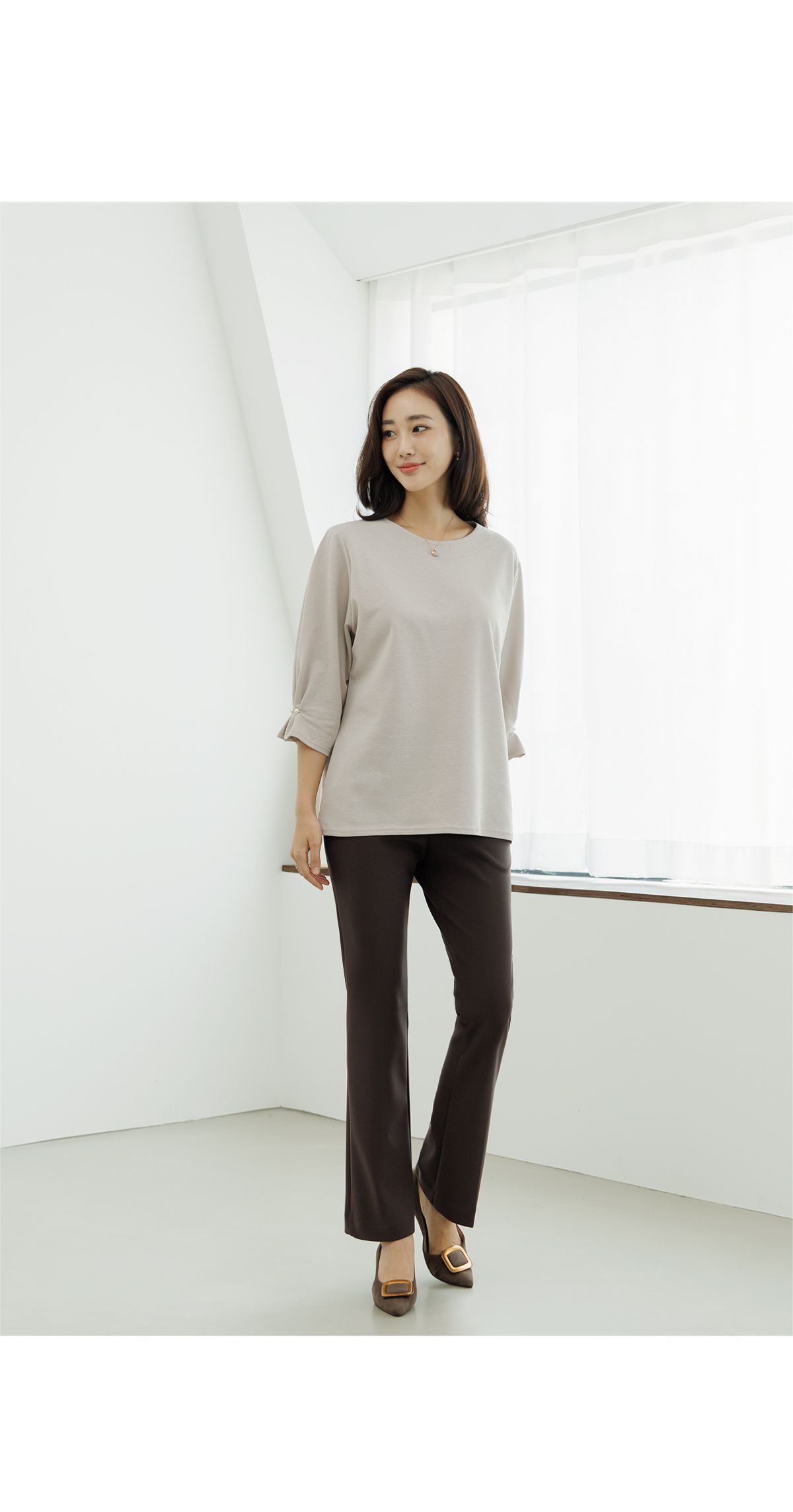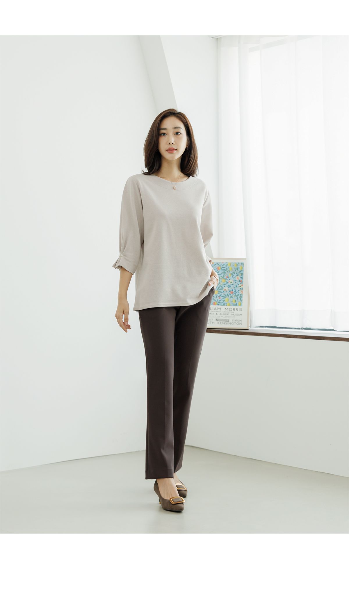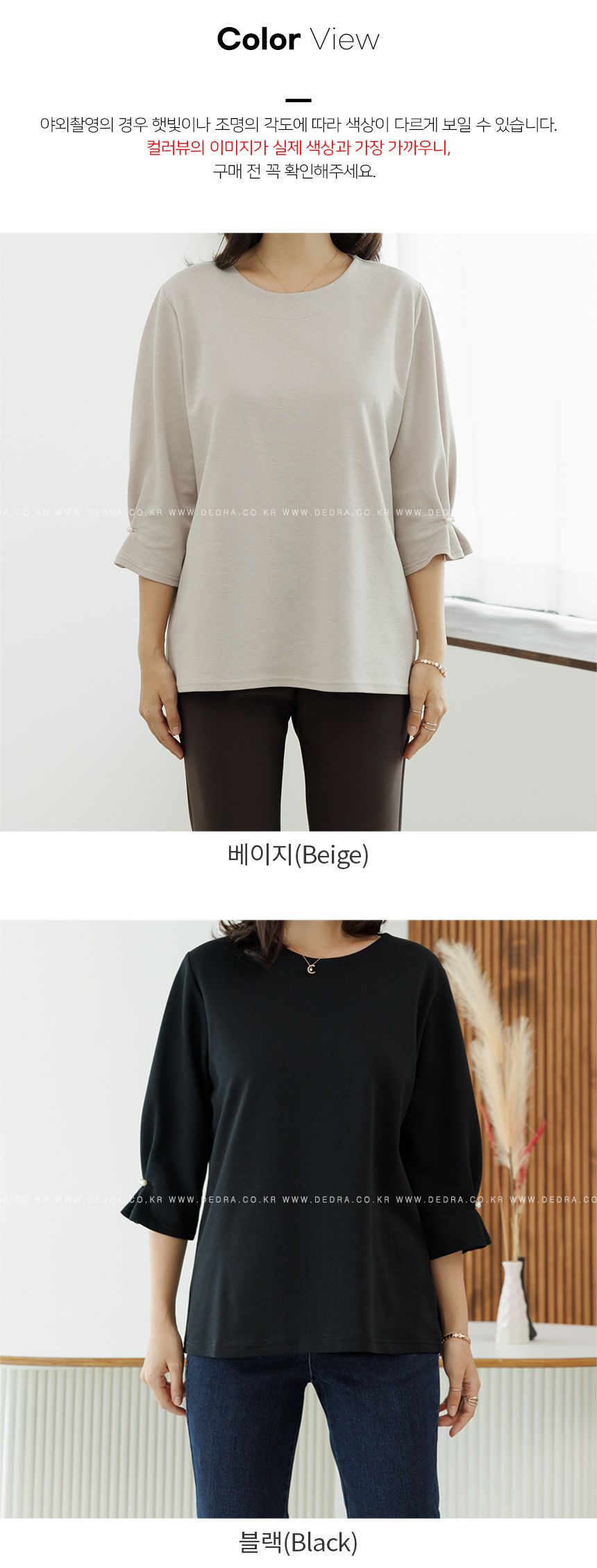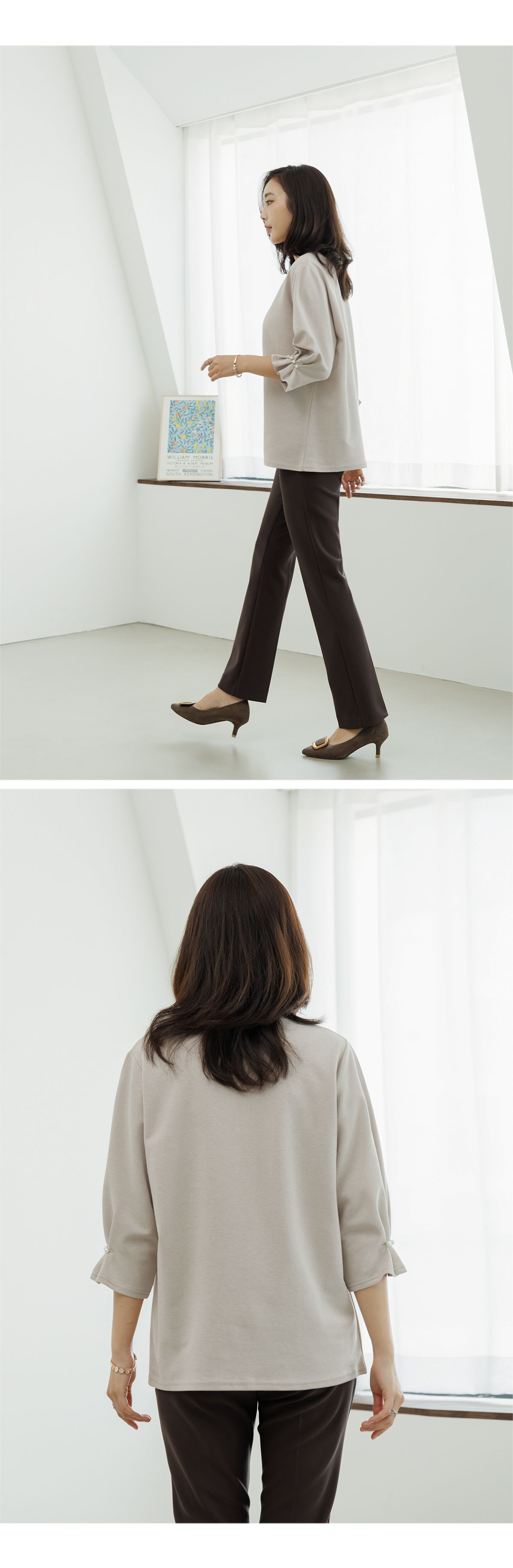 珍珠造型手袖添增質感/獨特不撞衫/寬鬆版型不挑身形-休閒居家簡約百搭車縫珍珠長版寬鬆素面壓褶袖口圓領七分袖上衣T恤米色黑色