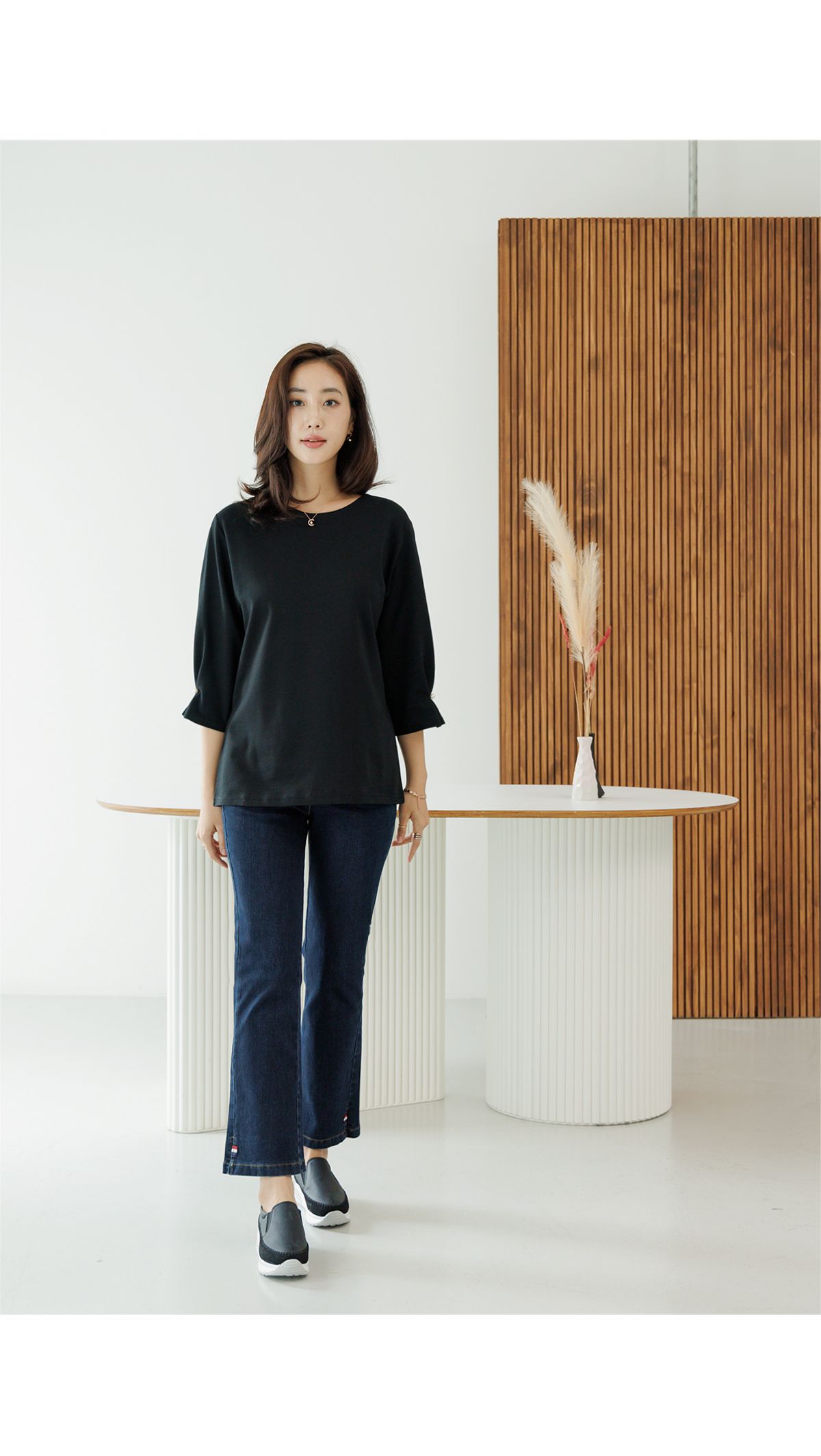 【C55345】韓國DED 車縫珍珠T恤-寬鬆素面壓褶長版圓領七分袖上衣★★
