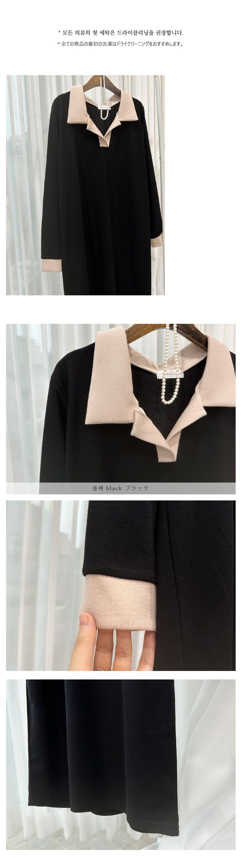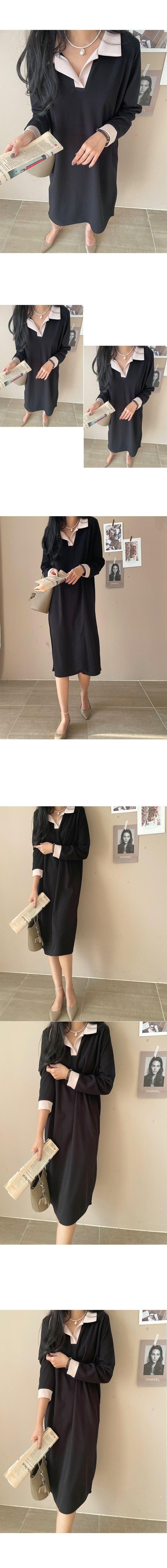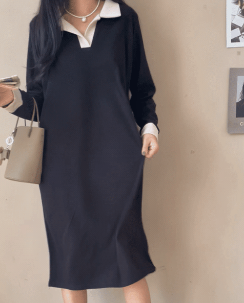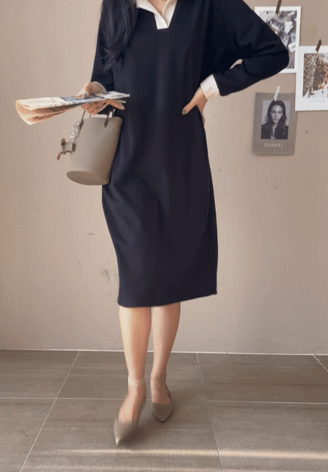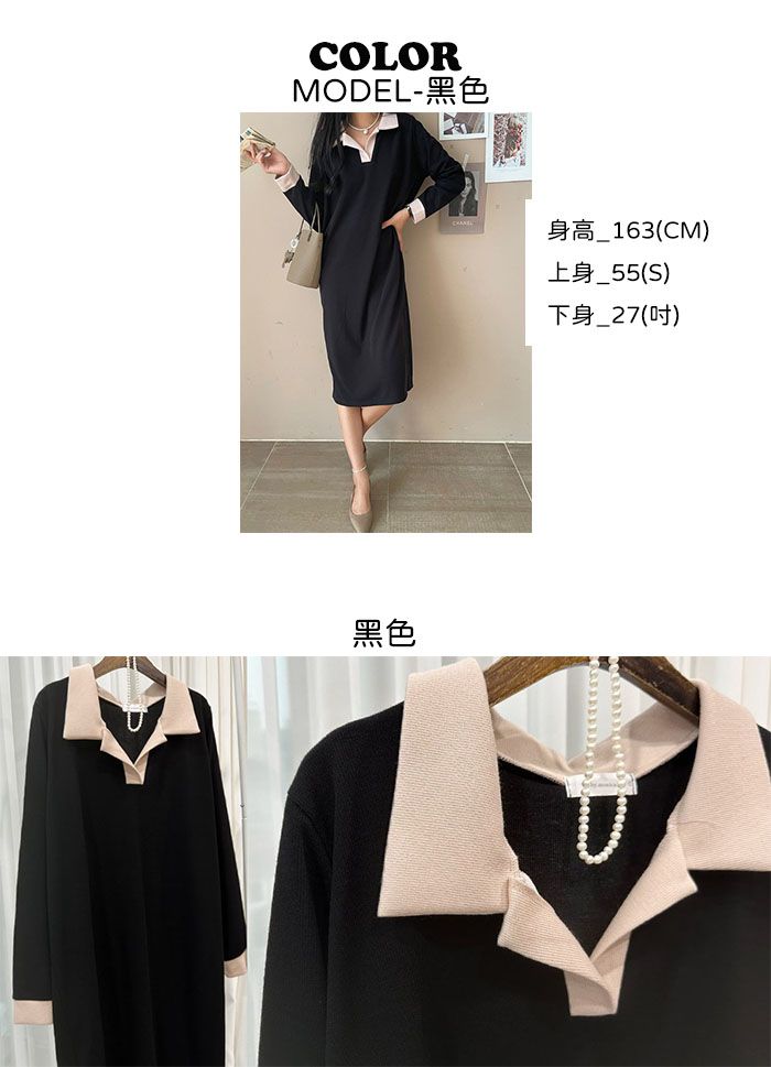 【C55350】韓國MNR 寬鬆針織洋裝-跳色滾邊V領素面長袖直筒連身裙★★