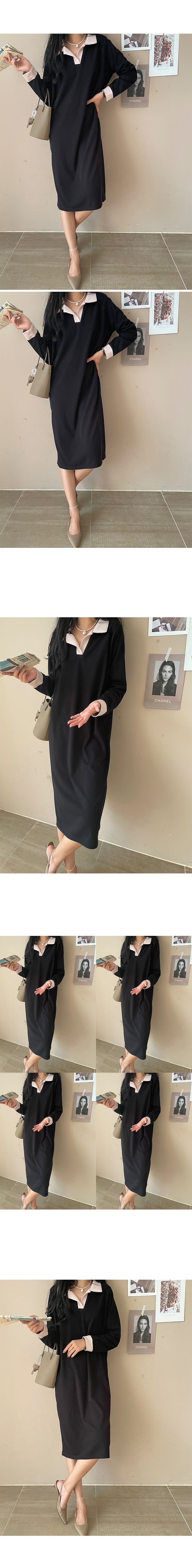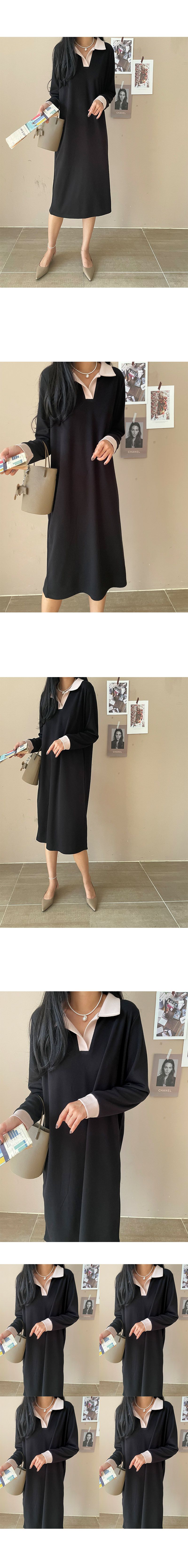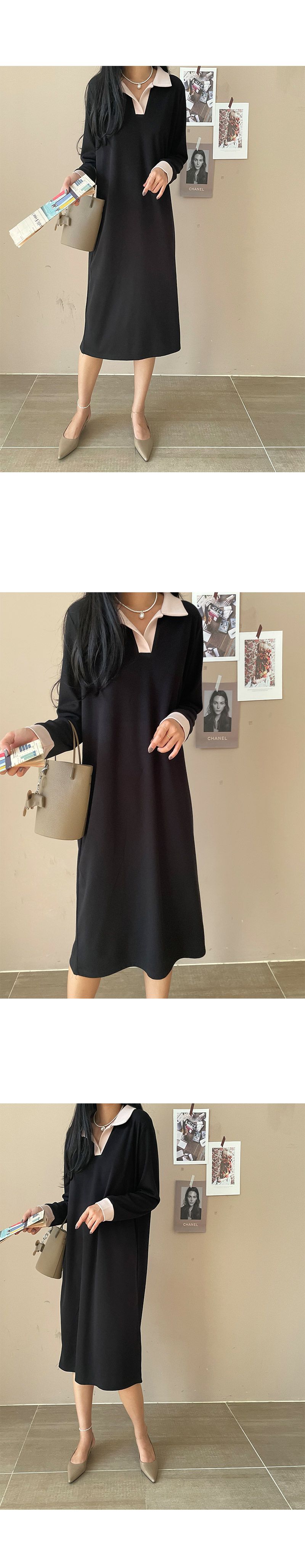 寬鬆版型不挑身形/彈性佳/懶人穿搭風格-休閒居家簡約百搭復古寬鬆針織跳色滾邊V領素面長袖直筒連身裙洋裝黑色