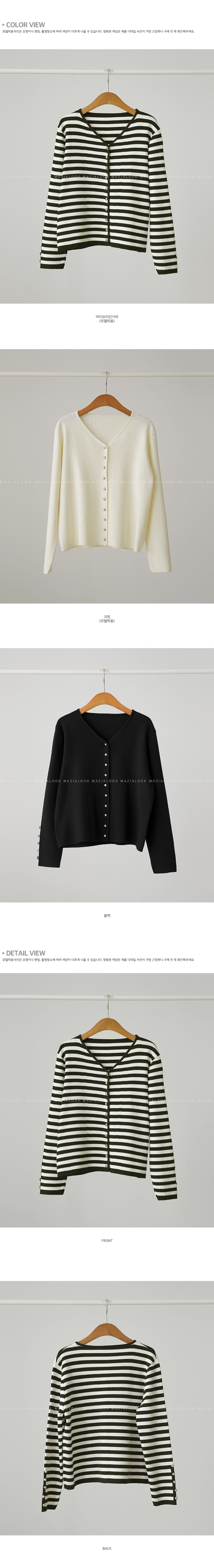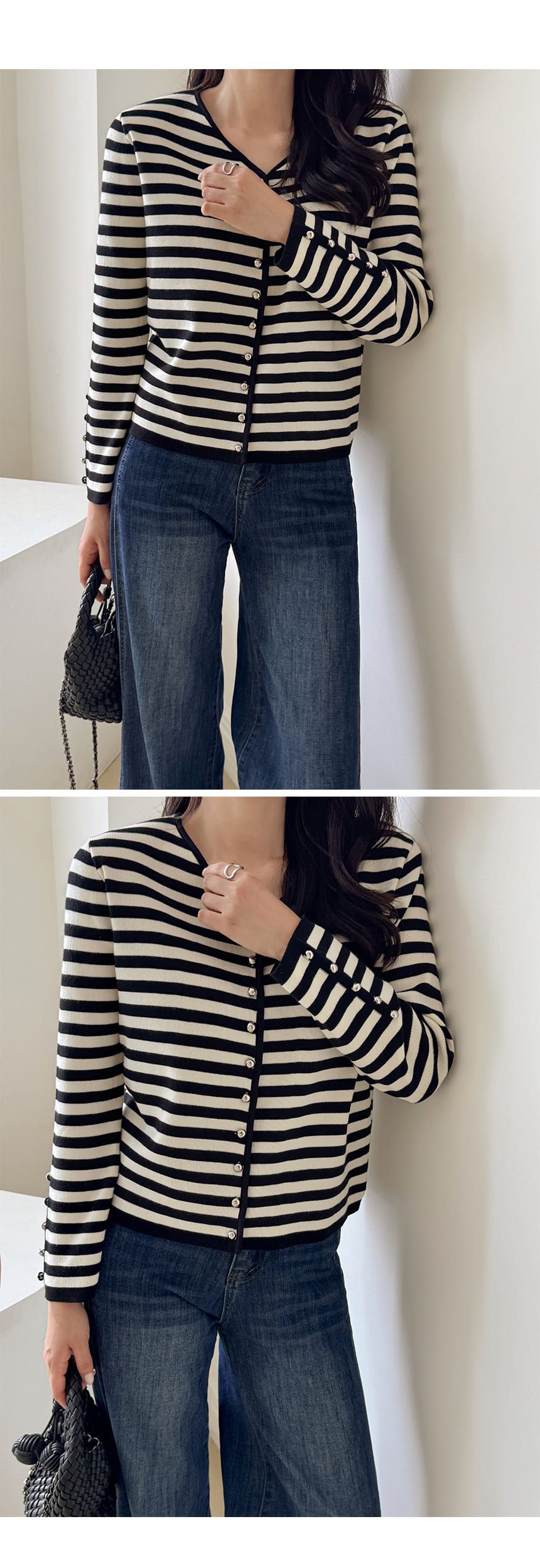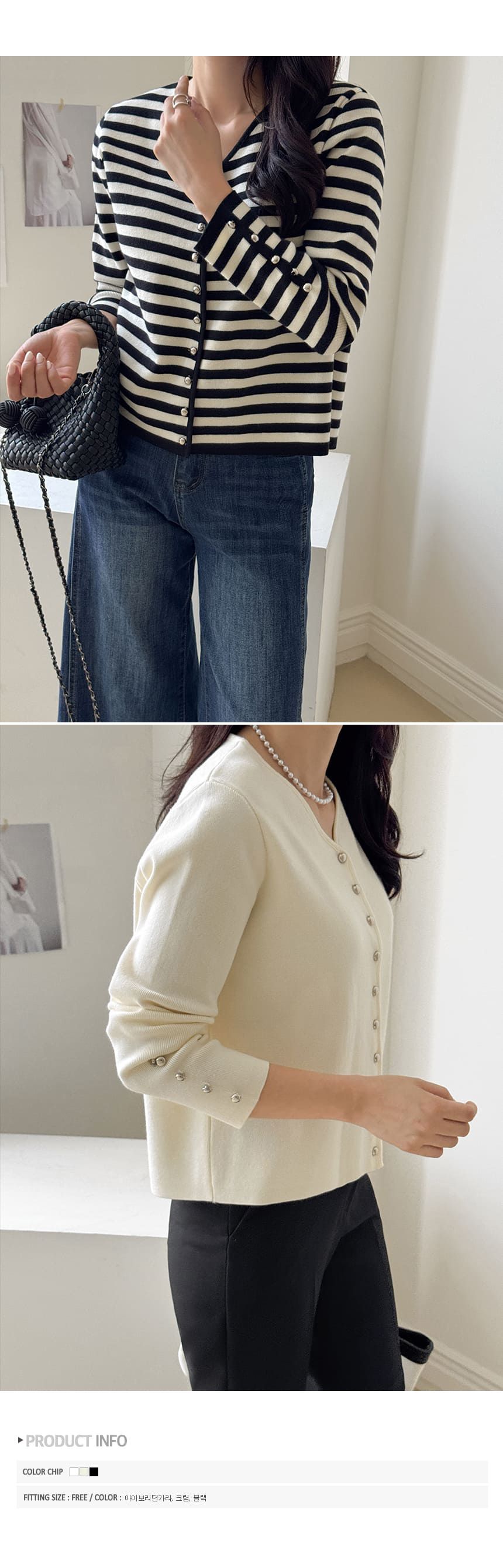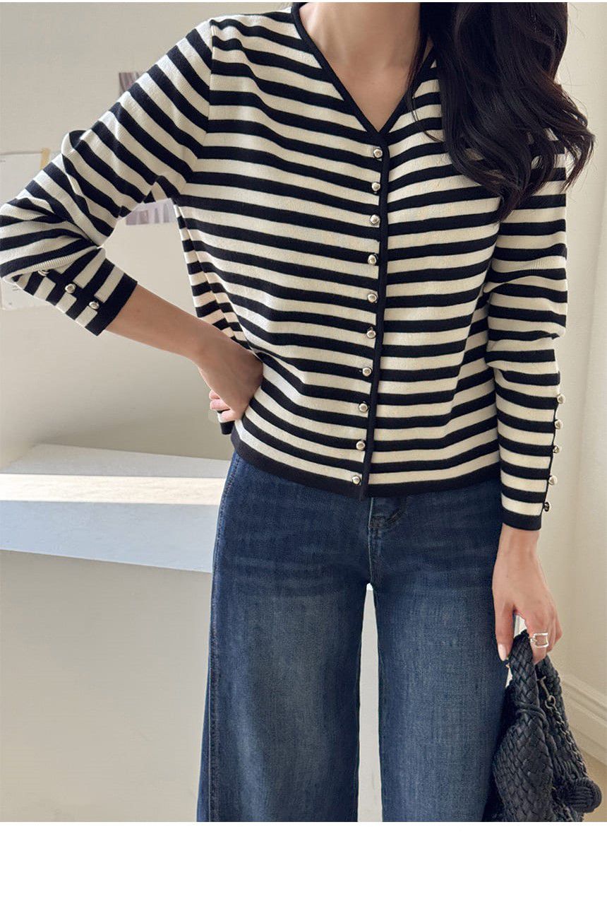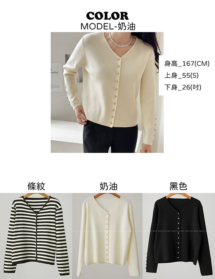 條紋色&素色/V領/開襟排釦/立體金屬鈕釦/袖釦造型 - 休閒居家簡約百搭素面配色條紋上衣條紋外套條紋針織衫針織上衣開襟衫立體排釦針織衫長袖上衣外套條紋色奶油色黑色