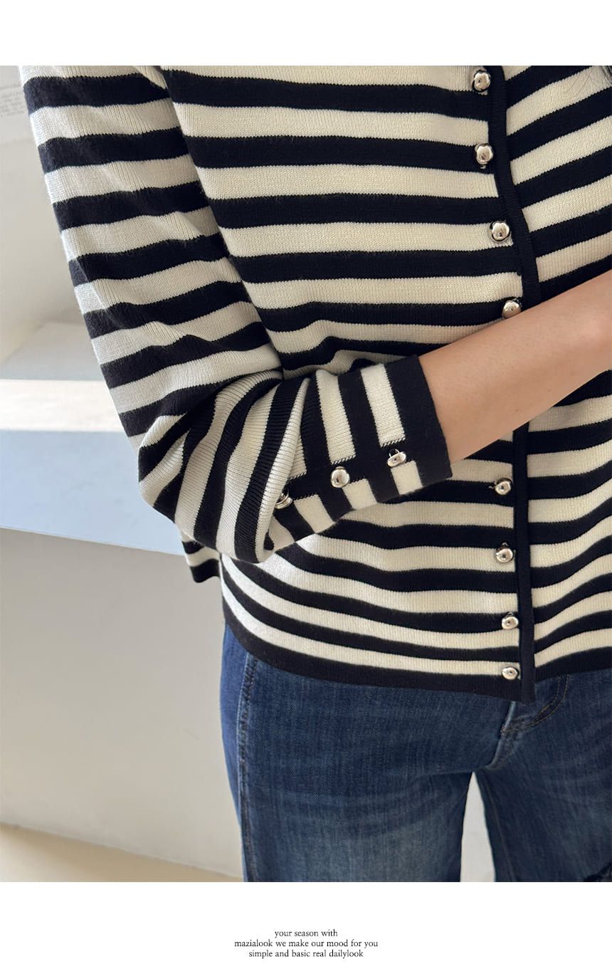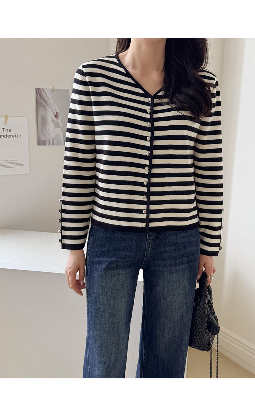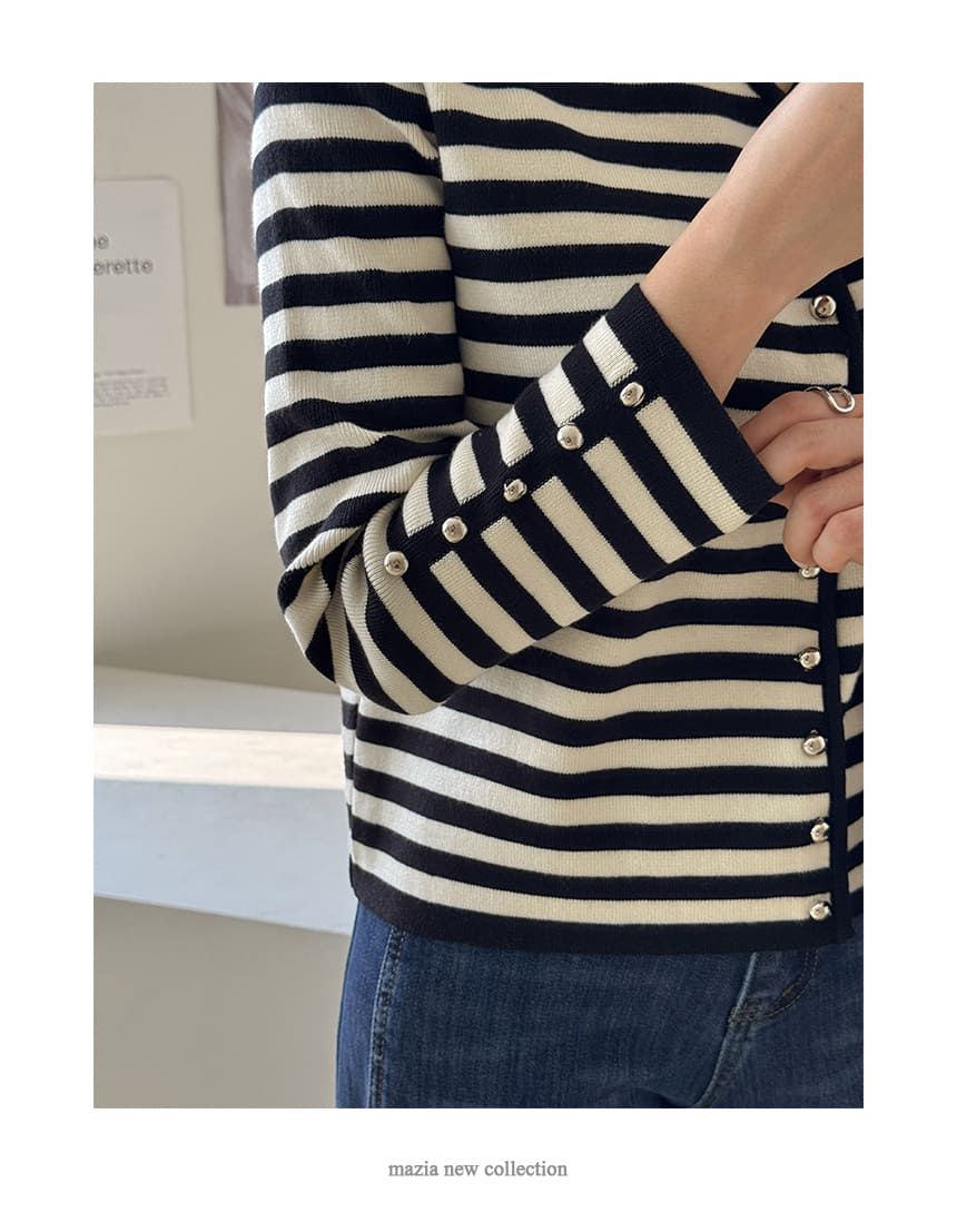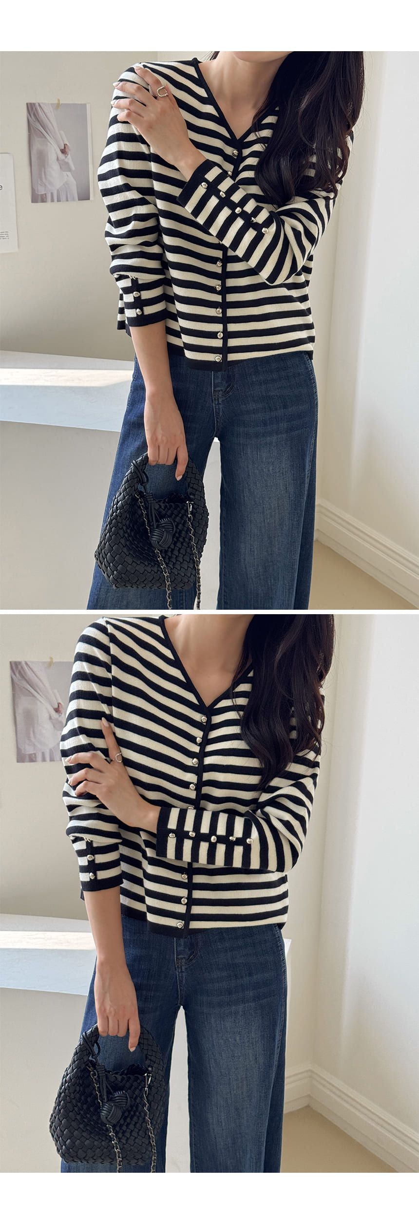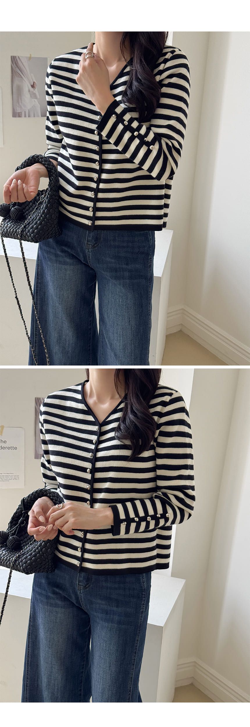 條紋色&素色/V領/開襟排釦/立體金屬鈕釦/袖釦造型 - 休閒居家簡約百搭素面配色條紋上衣條紋外套條紋針織衫針織上衣開襟衫立體排釦針織衫長袖上衣外套條紋色奶油色黑色