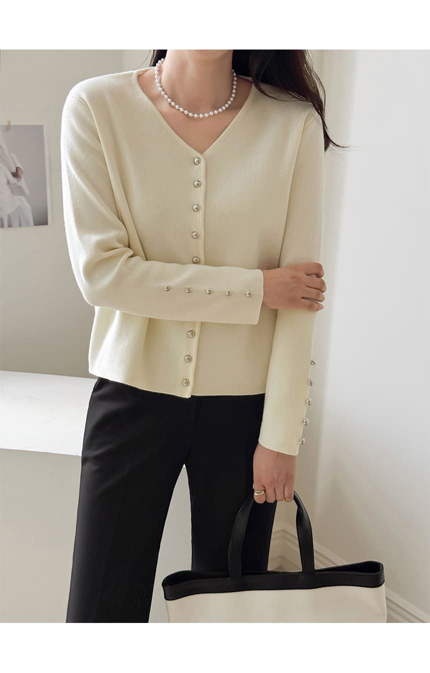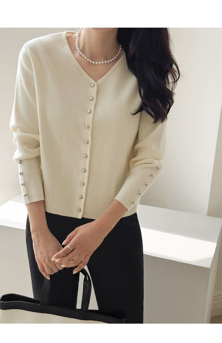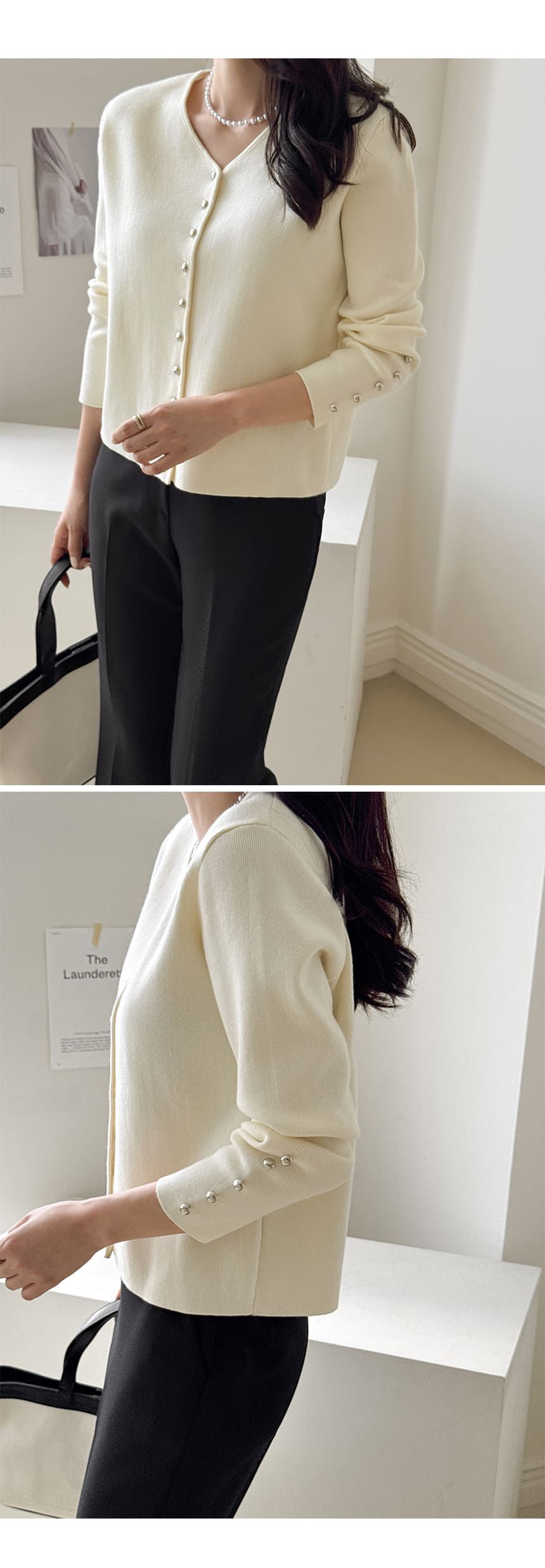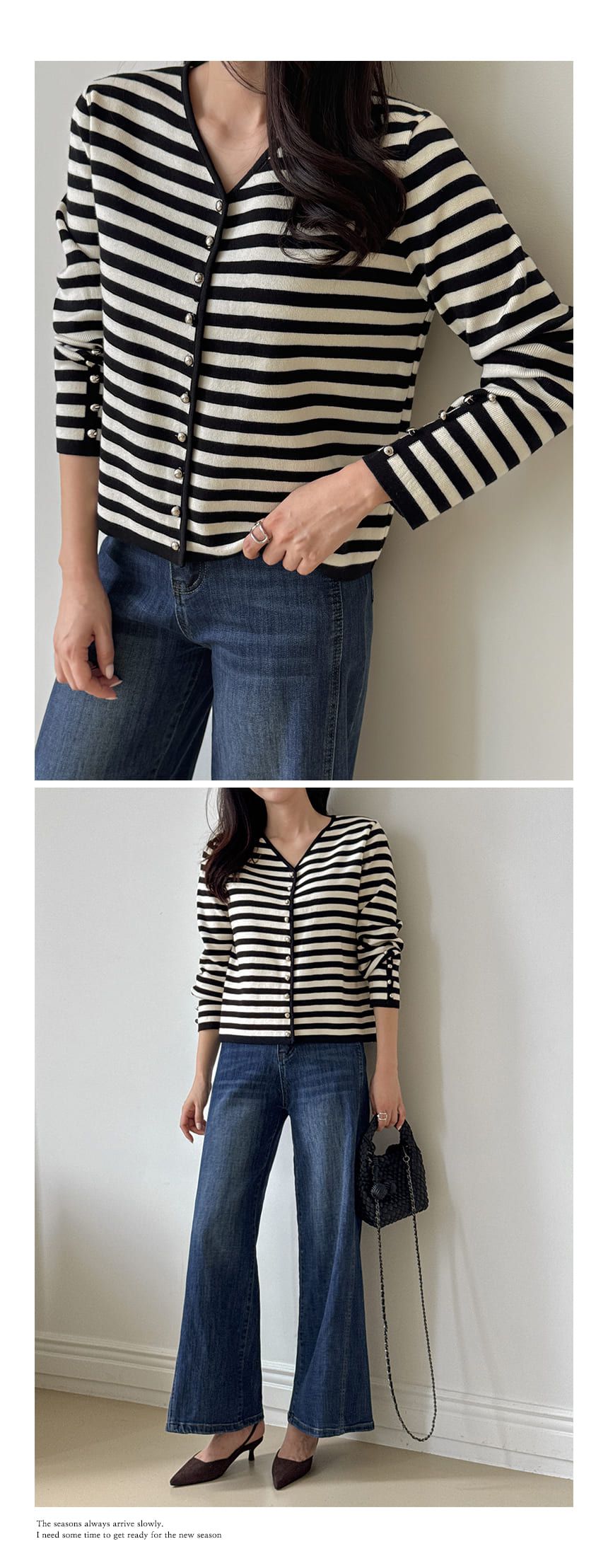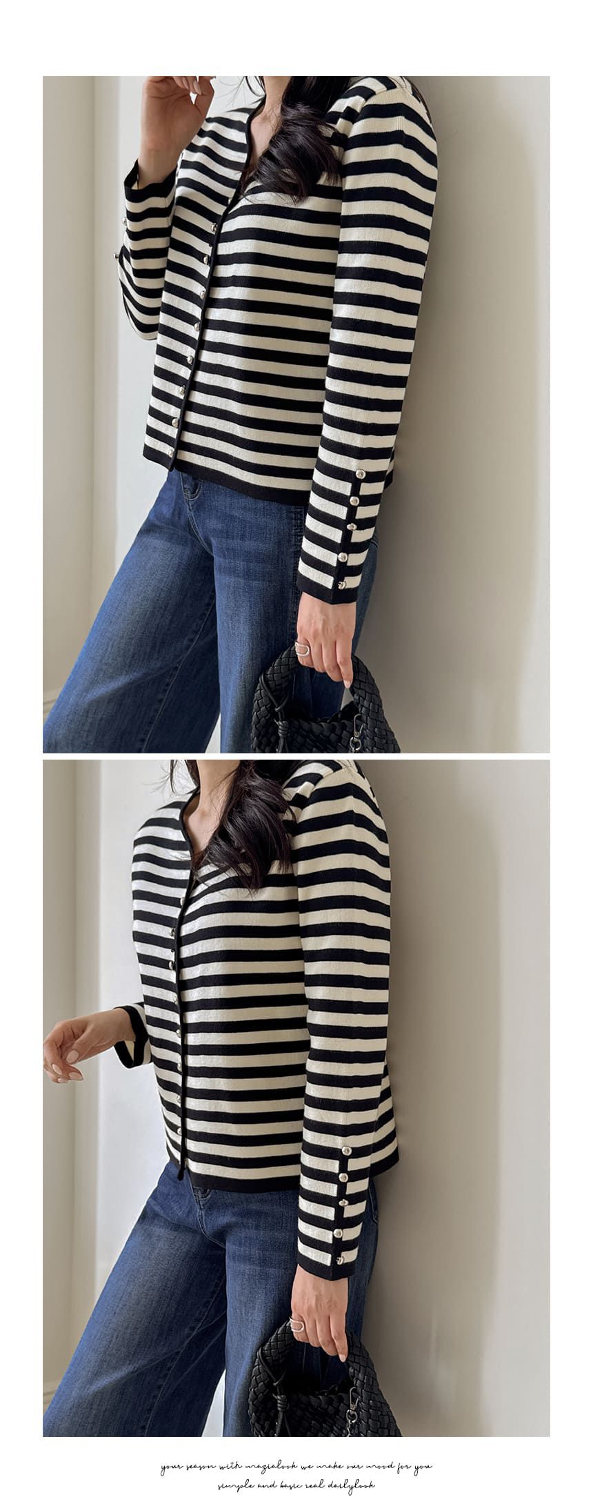 條紋色&素色/V領/開襟排釦/立體金屬鈕釦/袖釦造型 - 休閒居家簡約百搭素面配色條紋上衣條紋外套條紋針織衫針織上衣開襟衫立體排釦針織衫長袖上衣外套條紋色奶油色黑色